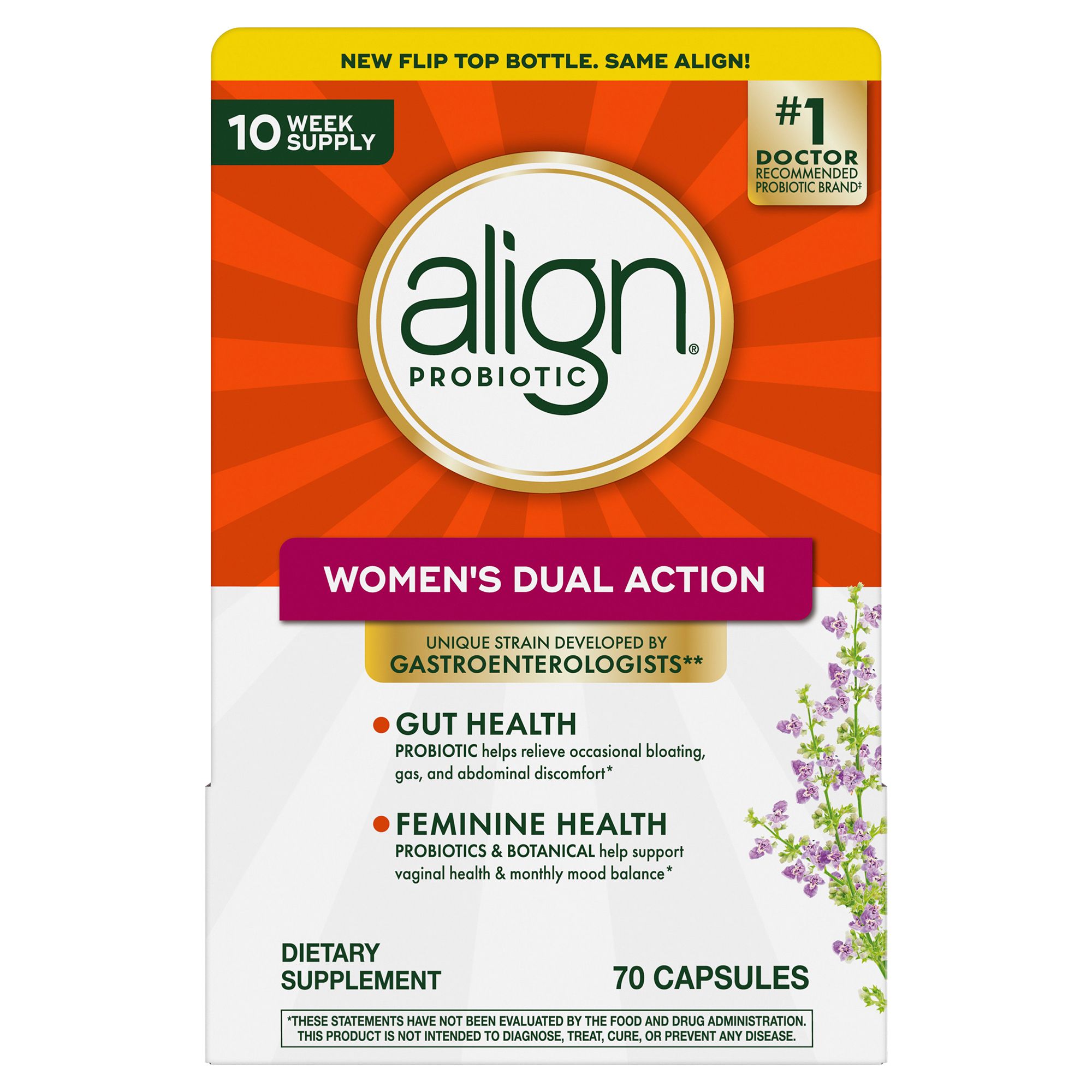 When your gut and vaginal bacteria get out of balance, you may feel it. When taken daily, Align Women's Dual Action Probiotic helps soothe occasional digestive upsets like bloating, gas, and abdominal discomfort by adding a unique strain of good bacteria to your gut.* Plus, it contains women's probiotics to help stabilize your vaginal balance and botanical chaste tree for monthly mood balance.*Recommended by Gastroenterologists two times more than any other probiotic, Align daily probiotic supplement is the #1 doctor and gastroenterologist recommended probiotic brand. Good bacteria are essential for many bodily functions, including healthy digestion. However, common issues such as diet, travel and stress can disrupt the natural balance of bacteria in your digestive system. Discovered by Gastroenterologists and backed by 20+ years of research, Align Probiotic Women's Dual Action supplement contains the unique strain Bifidobacterium 35624 and naturally helps soothe occasional abdominal discomfort, gas, and bloating.