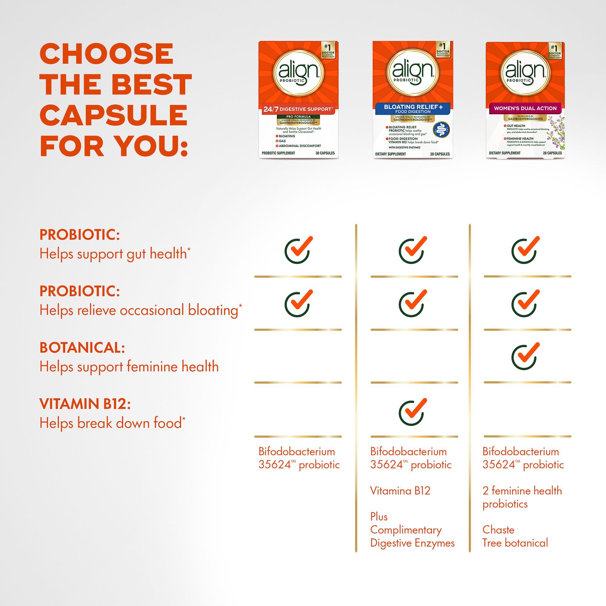 When your gut and vaginal bacteria get out of balance, you may feel it. When taken daily, Align Women's Dual Action Probiotic helps soothe occasional digestive upsets like bloating, gas, and abdominal discomfort by adding a unique strain of good bacteria to your gut.* Plus, it contains women's probiotics to help stabilize your vaginal balance and botanical chaste tree for monthly mood balance.*Recommended by Gastroenterologists two times more than any other probiotic, Align daily probiotic supplement is the #1 doctor and gastroenterologist recommended probiotic brand. Good bacteria are essential for many bodily functions, including healthy digestion. However, common issues such as diet, travel and stress can disrupt the natural balance of bacteria in your digestive system. Discovered by Gastroenterologists and backed by 20+ years of research, Align Probiotic Women's Dual Action supplement contains the unique strain Bifidobacterium 35624 and naturally helps soothe occasional abdominal discomfort, gas, and bloating.