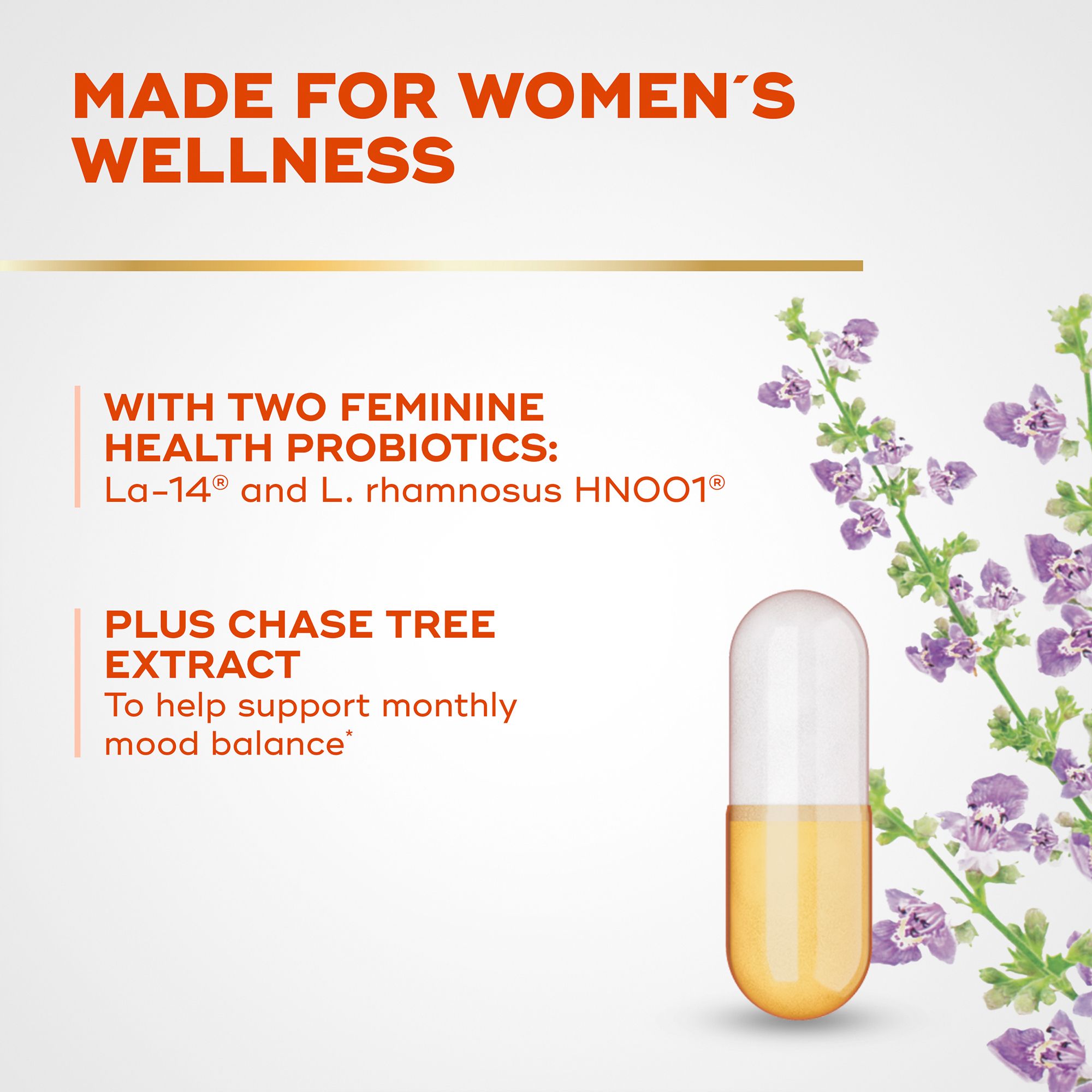 Helps ease monthly PMS symptoms: A women's blend of probiotics with chaste tree, a botanical that helps provide monthly mood balance and helps relieve monthly bloating*