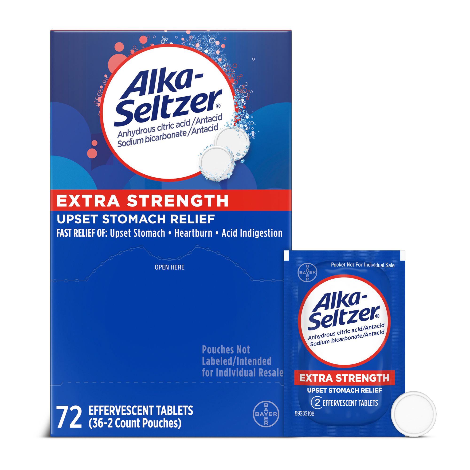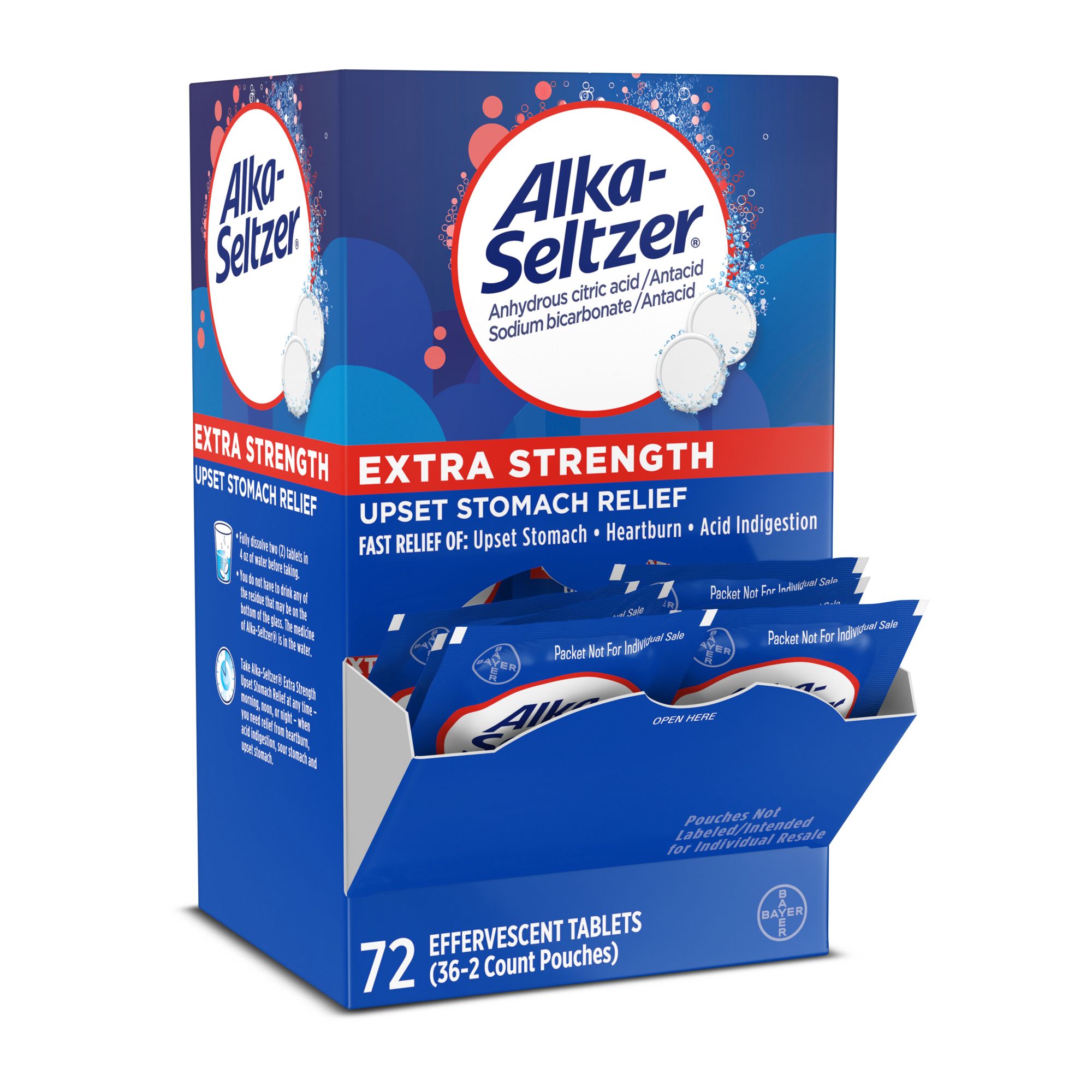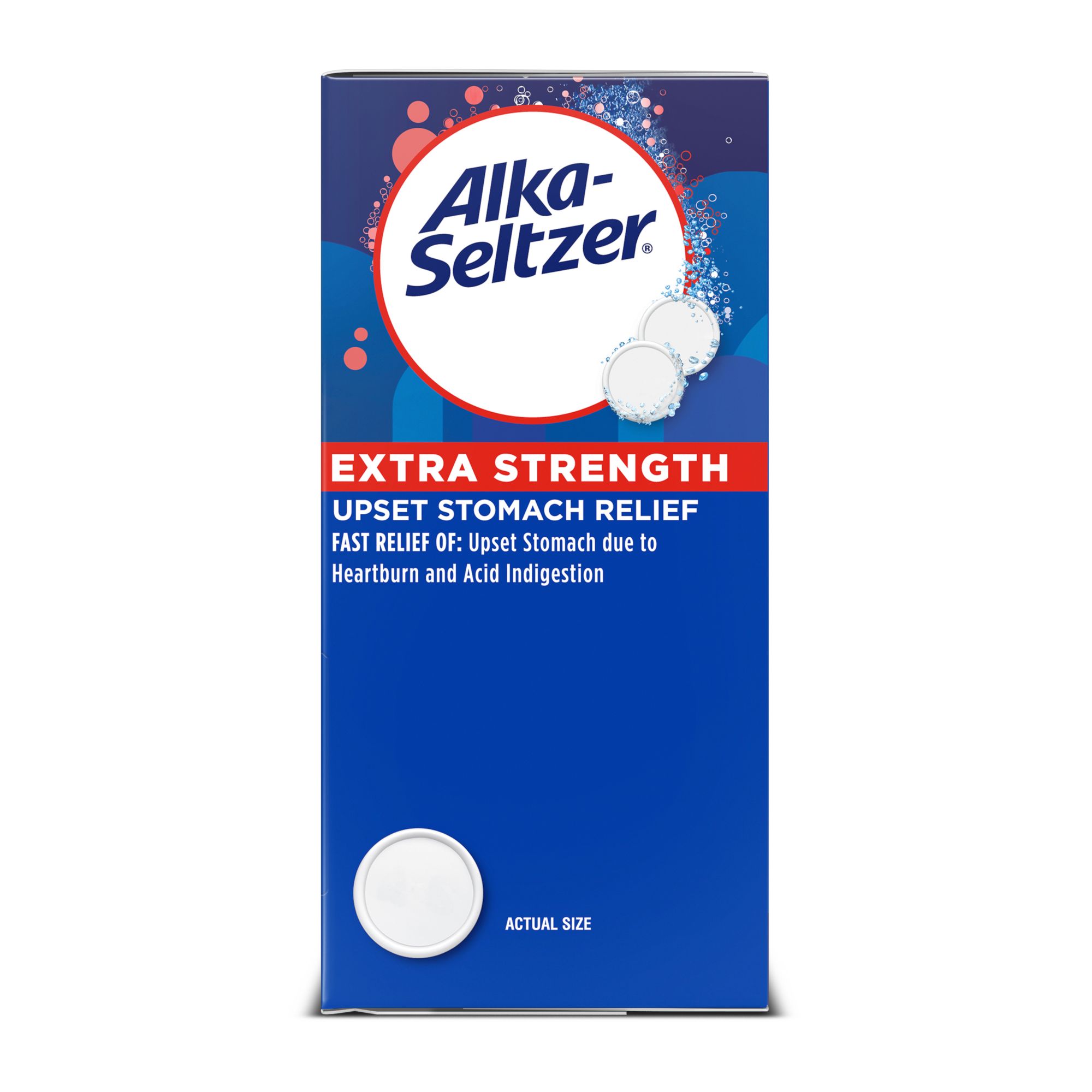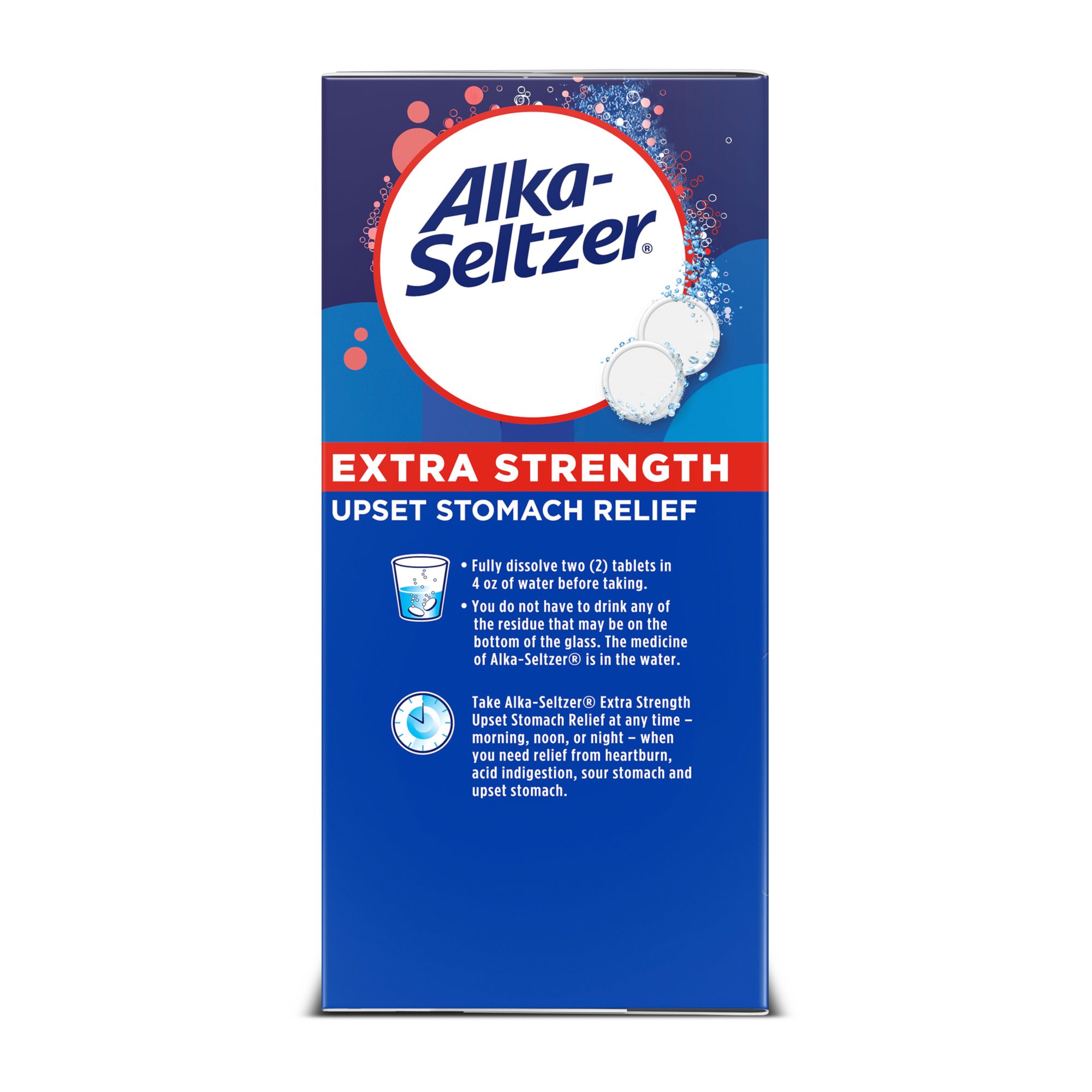 Alka Seltzer Extra Strength Effervescent Heartburn Relief Antacid Tablets. Multi-symptom relief offers fast occasional heartburn, acid indigestion and upset stomach relief associated with these symptoms. Powerful heartburn medicine with sodium bicarbonate and an hydrous citric acid, these tablets fight tough heartburn and acid indigestion symptoms. Fast acting Alka Seltzer Extra Strength Effervescent Heartburn Relief and Antacid Tablets start neutralizing acid in seconds. Hear, see and feel it, these effervescent tablets quickly dissolve in water for relief you can hear, see and feel working.