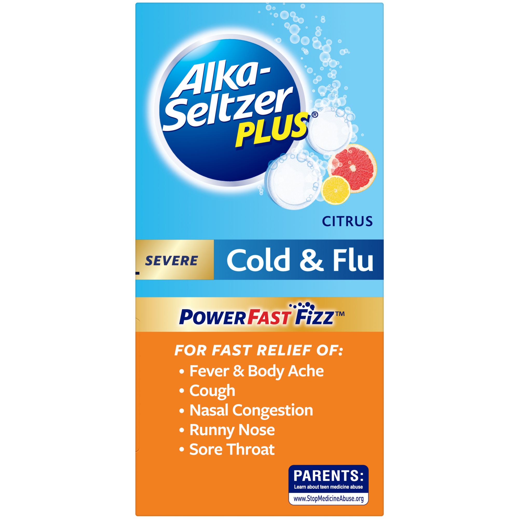 Severe Cold & Flu formula provides fizzy fast relief of headache, sore throat, cough, nasal and sinus congestion, runny nose, sneezing, aches and pains and fever.