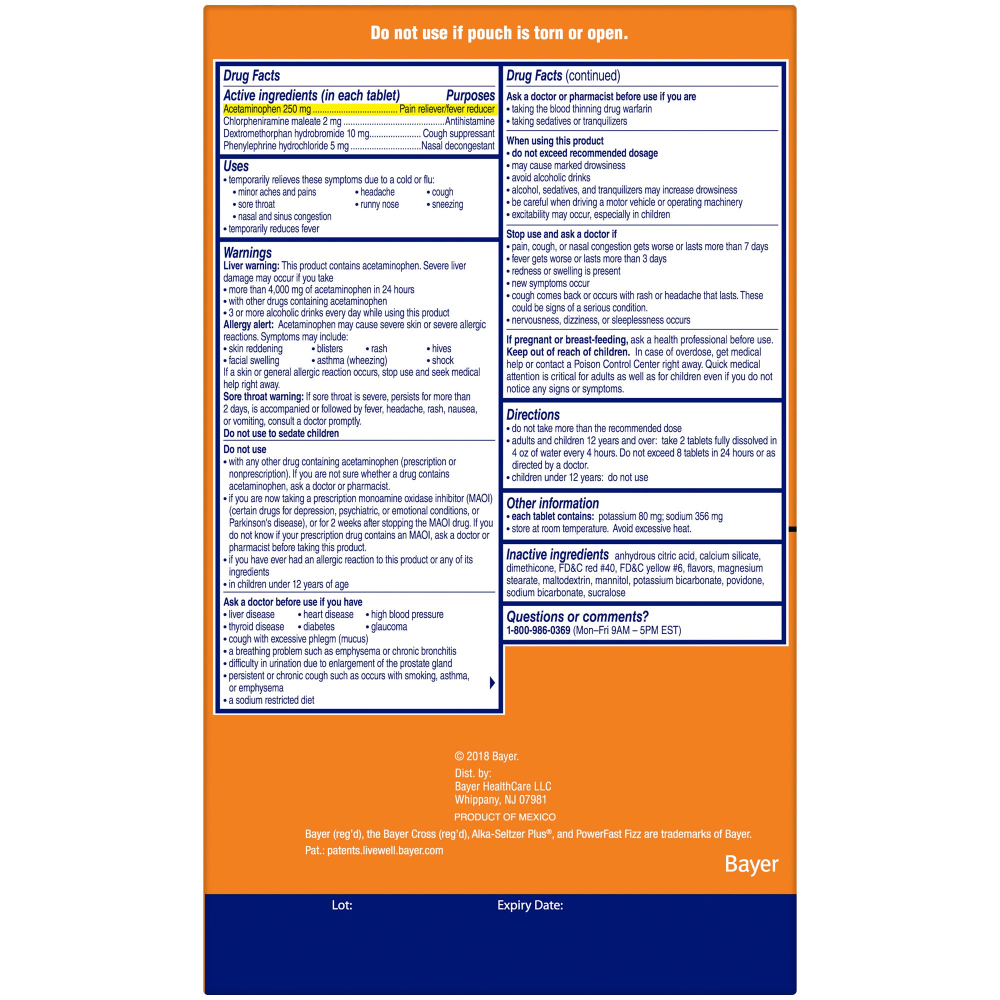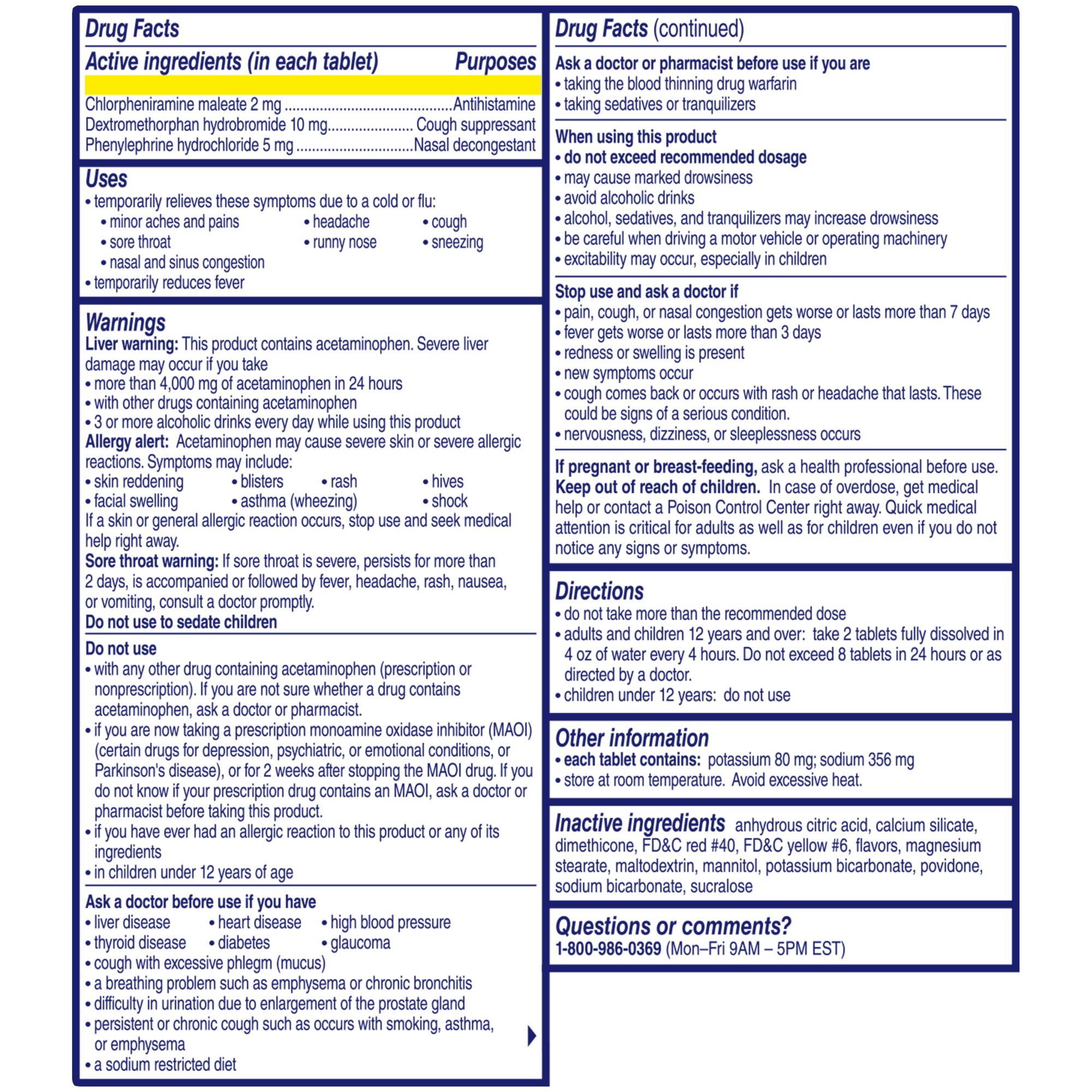 Active Ingredients: Acetaminophen 250 mg, Chlorpheniramine maleate 2 mg, Dextromethorphan hydrobromide 10 mg, Phenylephrine hydrochloride 5 mg.