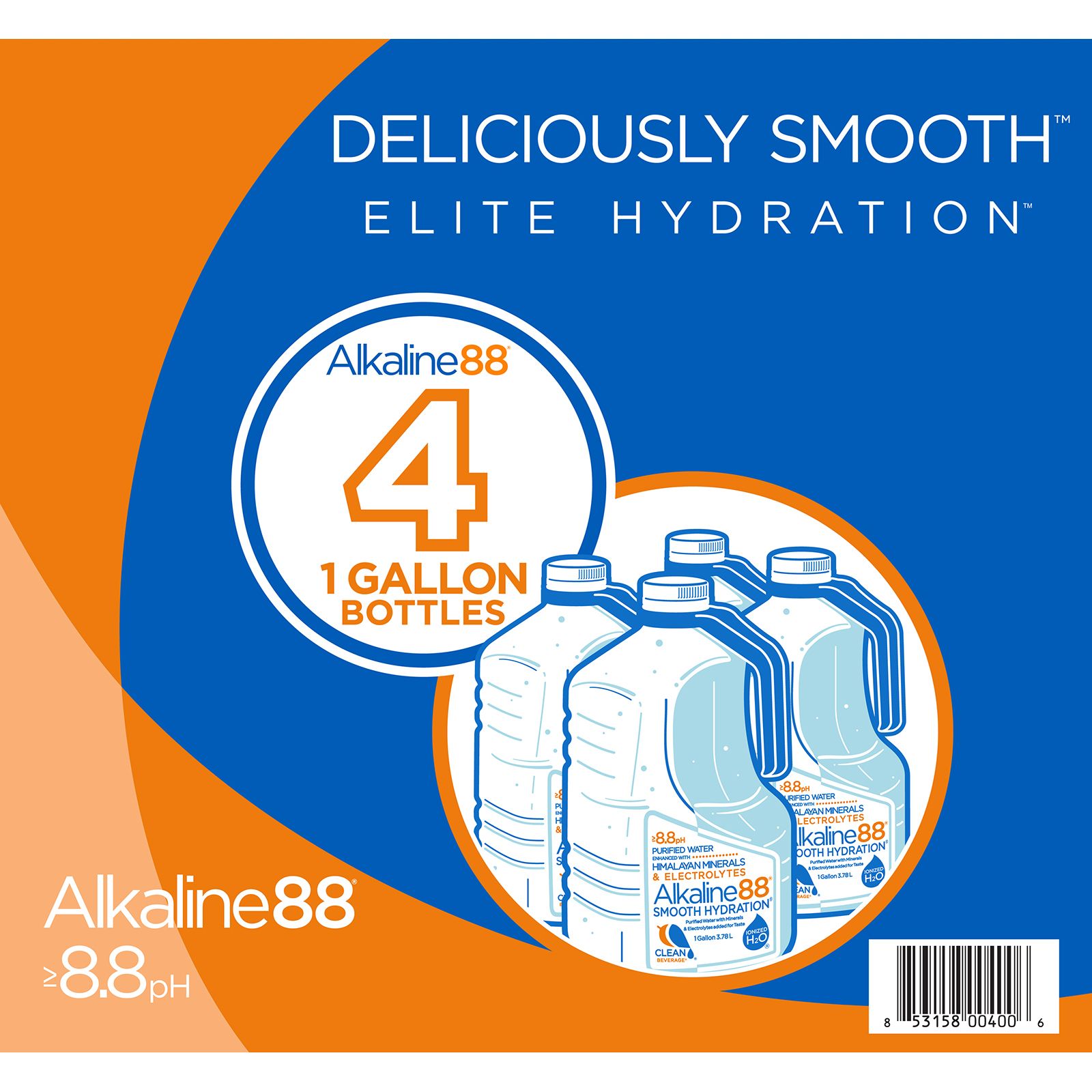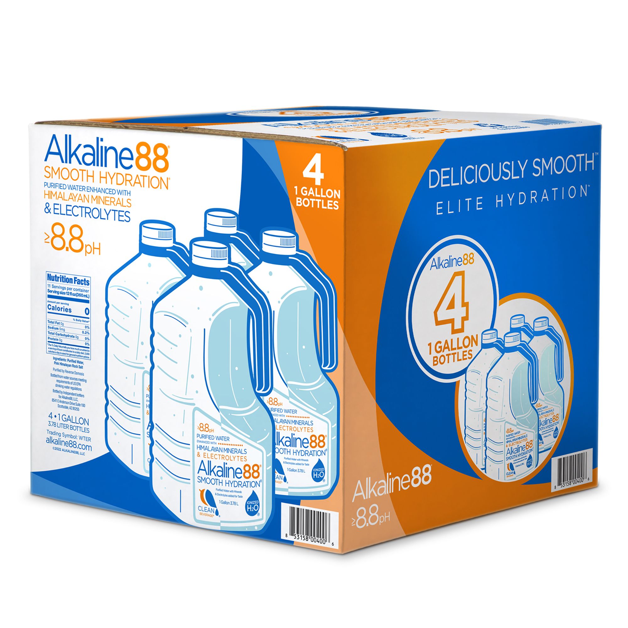 Elite hydration that’s deliciously smooth. Enjoy more Alkaline88 water with a 4 pk. of this signature blue-handle gallon that's easy to carry, store, and pour. With a perfect 8.8 pH, Alkaline 88 water offers elite hydration. The clean and pure alkaline water features only two natural ingredients; purified ionized H20, enhanced with pink Himalayan rock salt for rapid hydration and the smooth taste you crave.
