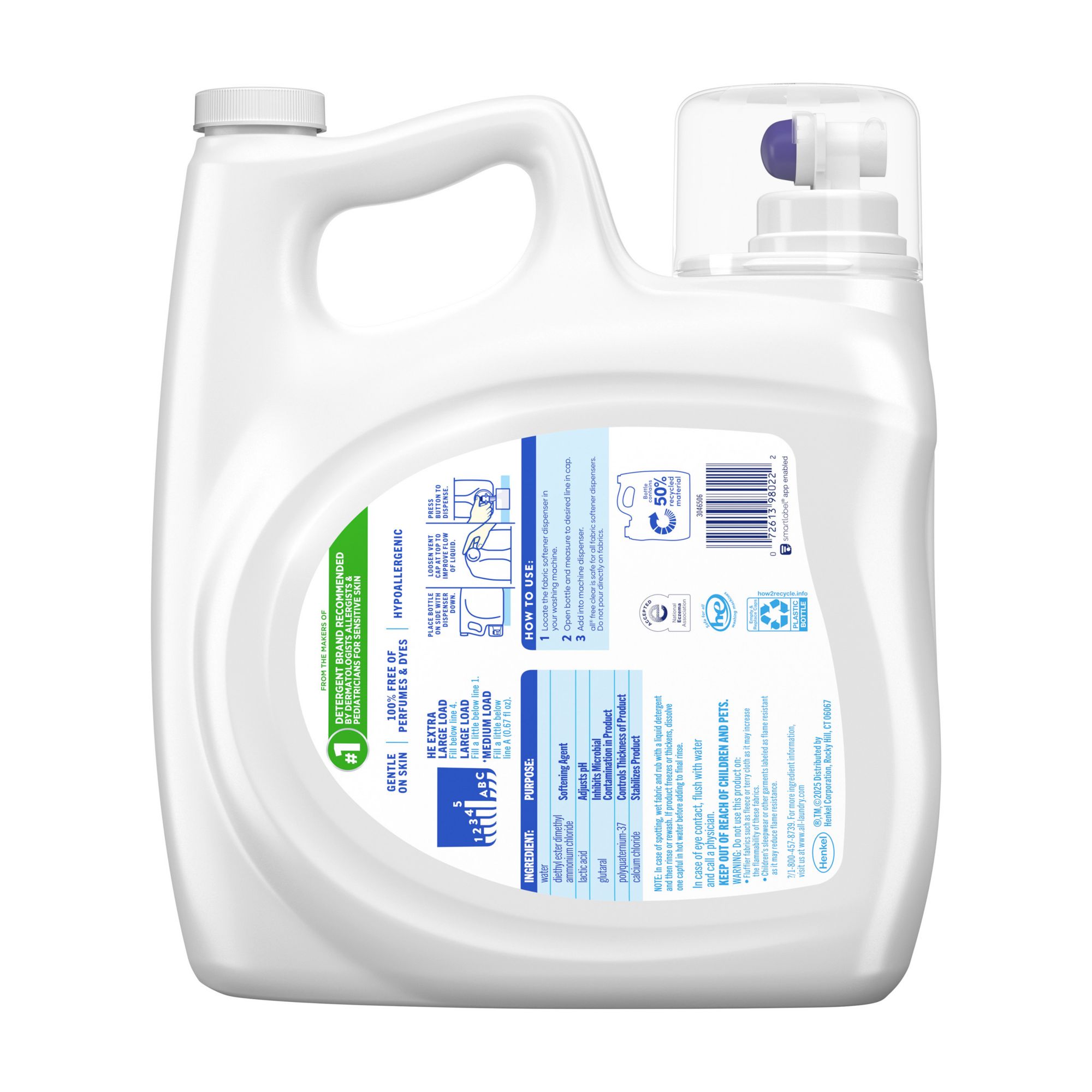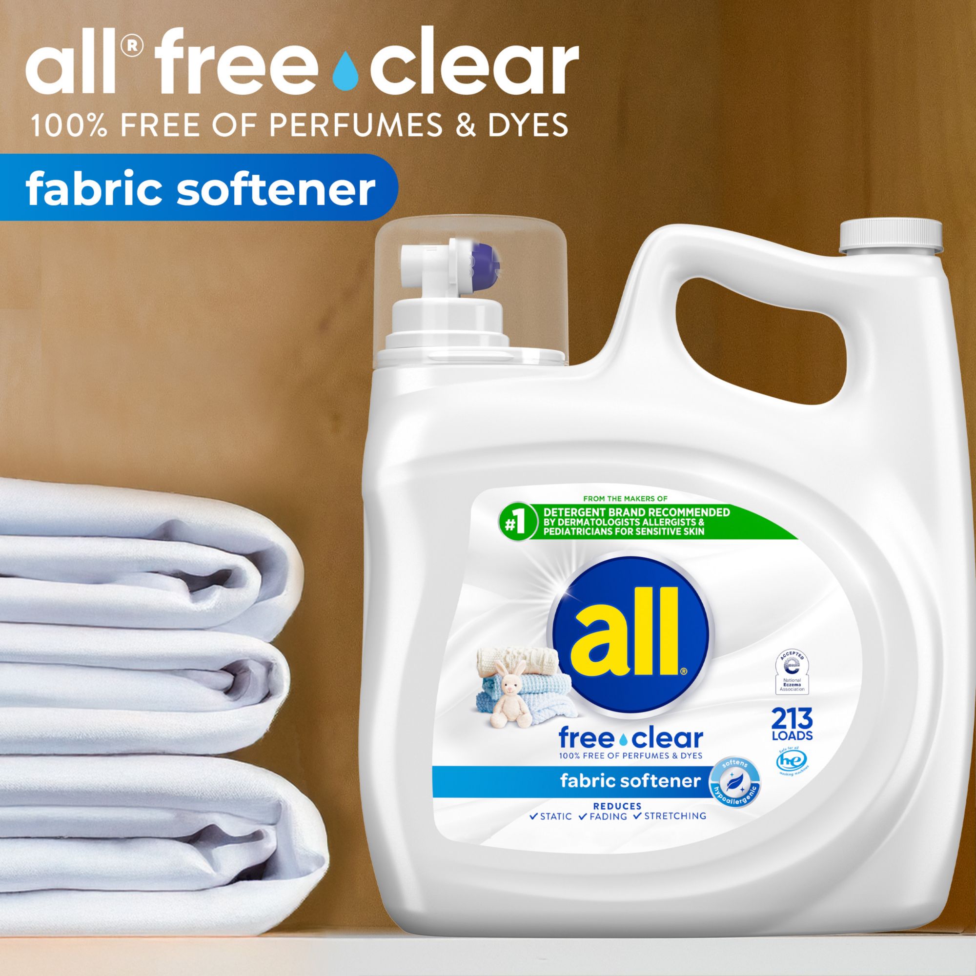 Leave your fabrics feeling soft and comfortable against sensitive skin with this hypoallergenic, fragrance free fabric softener Recommended by dermatologists for sensitive skin Add to your wash for clothes and bedding that are gentle on the skin Use with all Free Clear laundry detergent and dryer sheets for clean and soft clothes with static cling reduction in the dryer This gentle fabric softener is 100% fragrance-free and dye-free Includes 1 Bottle of all® Free Clear Liquid Fabric Softener