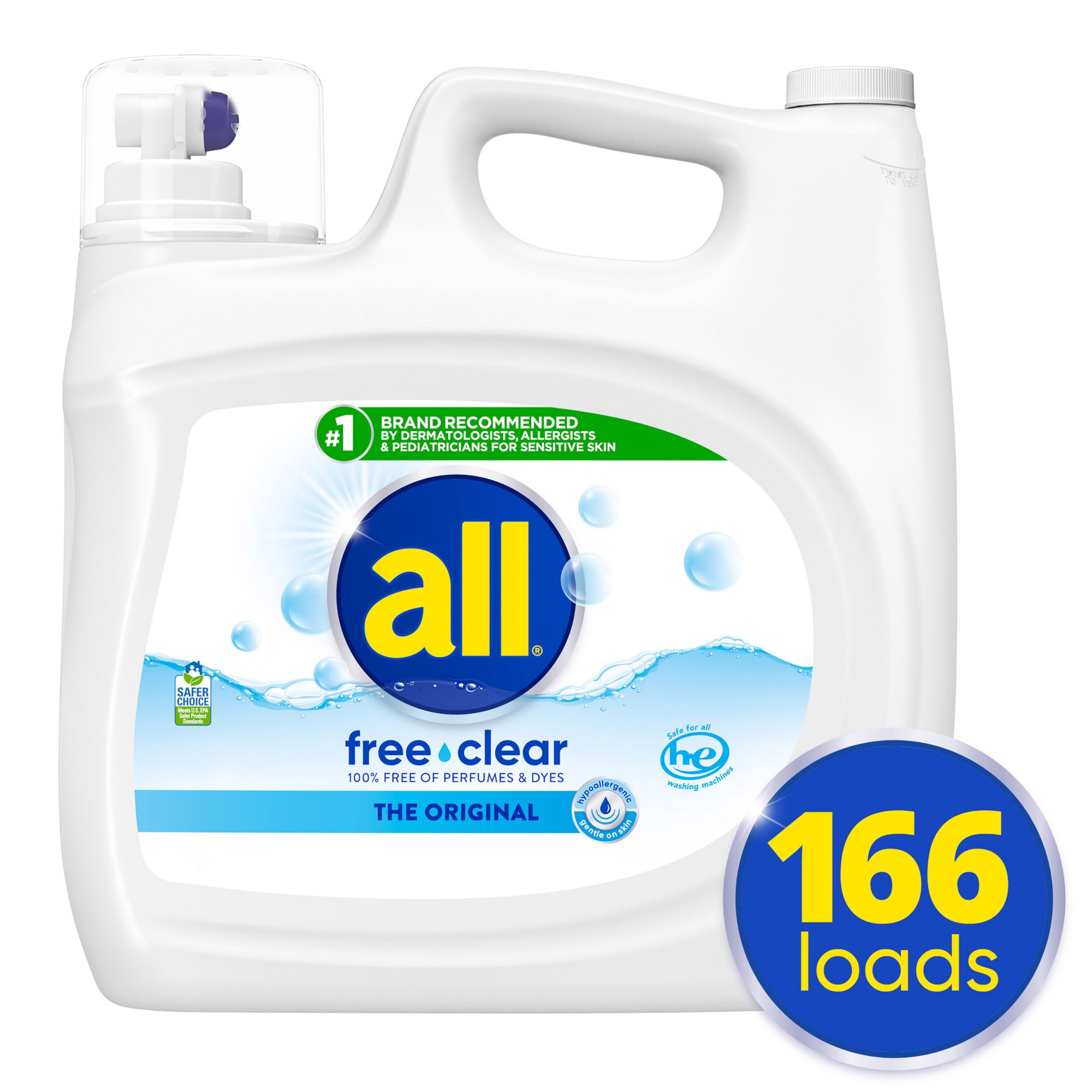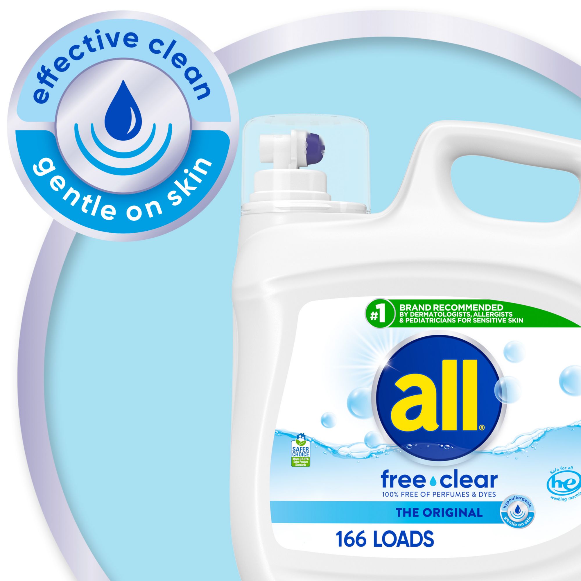 all® free clear is the #1 Brand Recommended by Dermatologists, allergists and Pediatricians for Sensitive Skin 100% free of perfumes and dyes, all® free clear effective clean, gentle on skin Now more concentrated; more cleaning power per drop* Use with all® free clear fabric softener and dryer sheets for clean and soft clothes with static cling reduction in the dryer Removes impurities without leaving irritating residues** all® free clear Original includes biodegradable surfactants. Safe for septic systems. Works effectively, even in cold water. As always, contains no phosphates. Safe for all HE washing machines. Includes one 208 oz. bottle of all Free Clear liquid laundry detergent