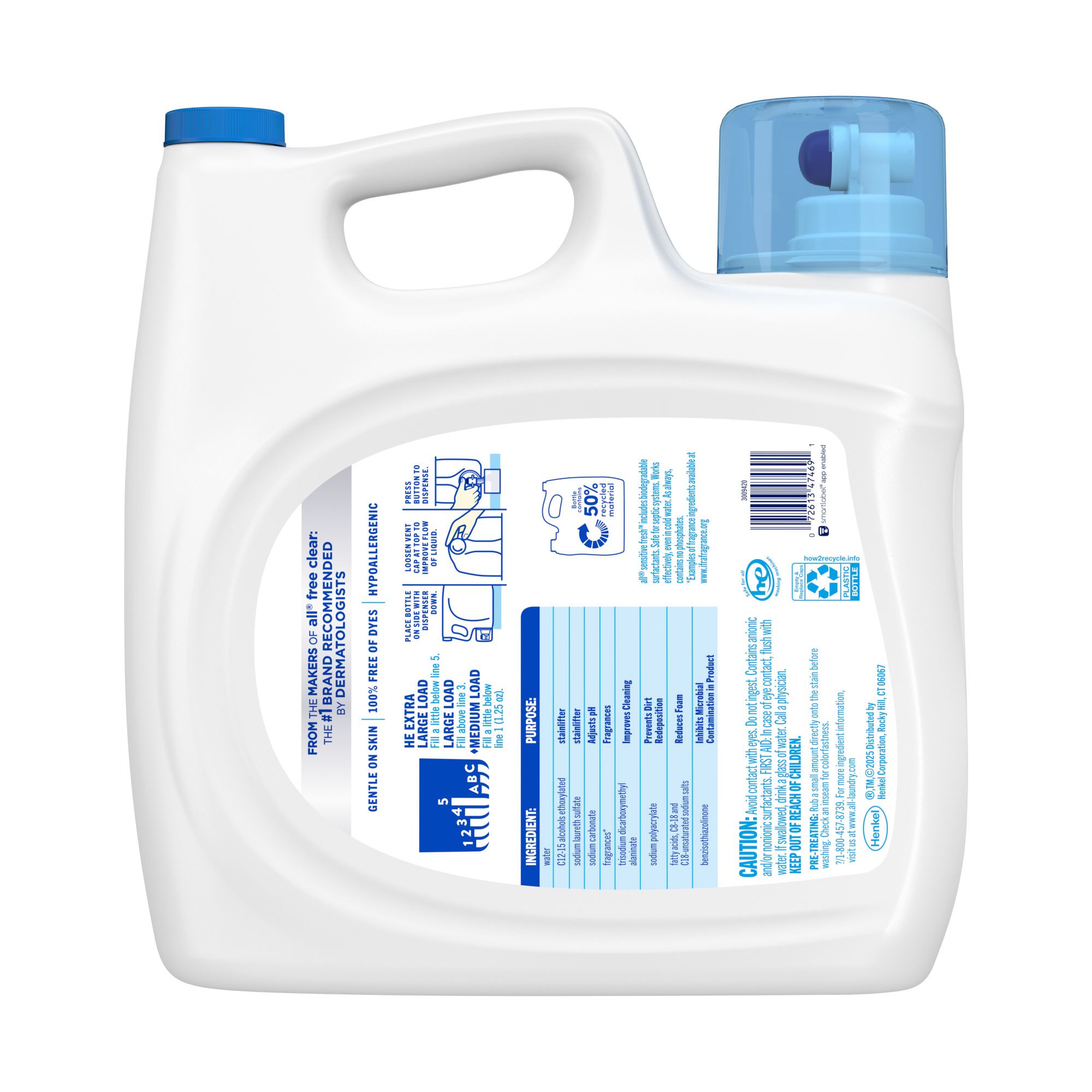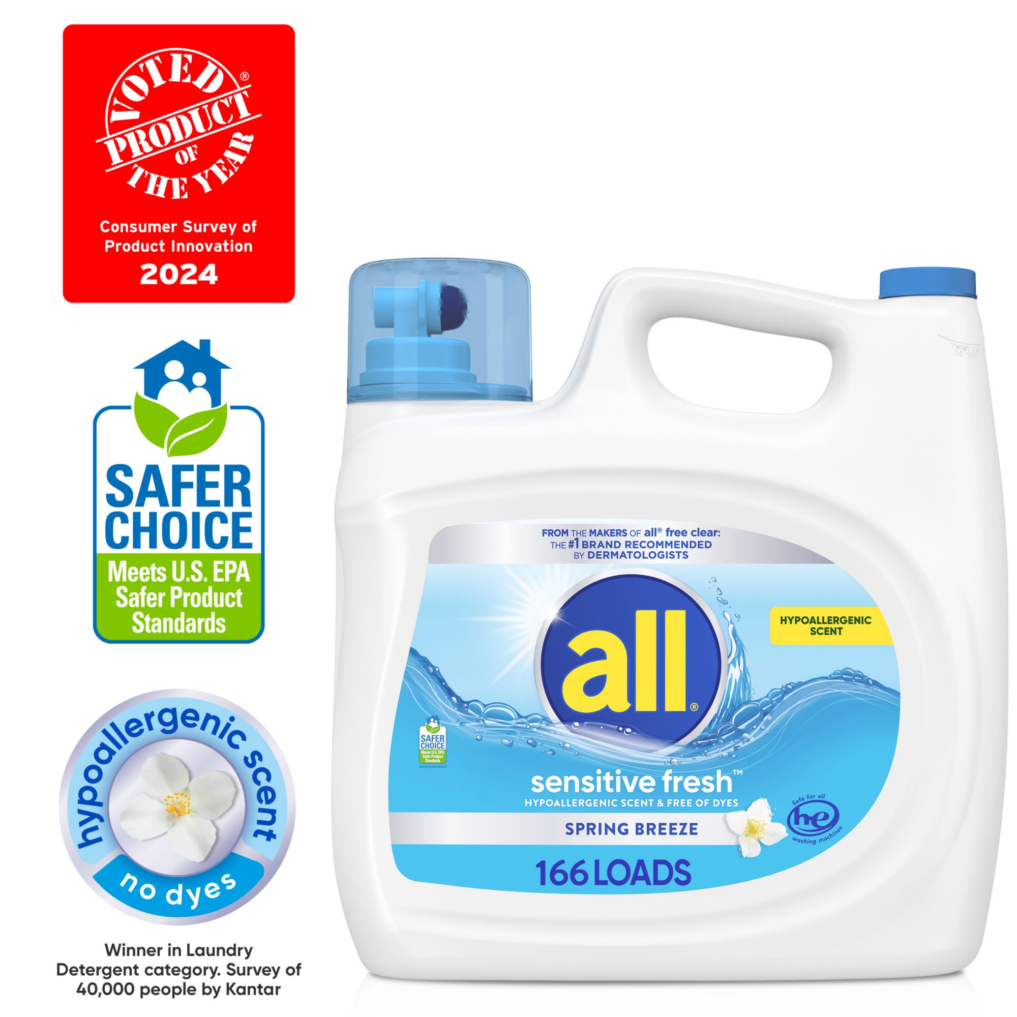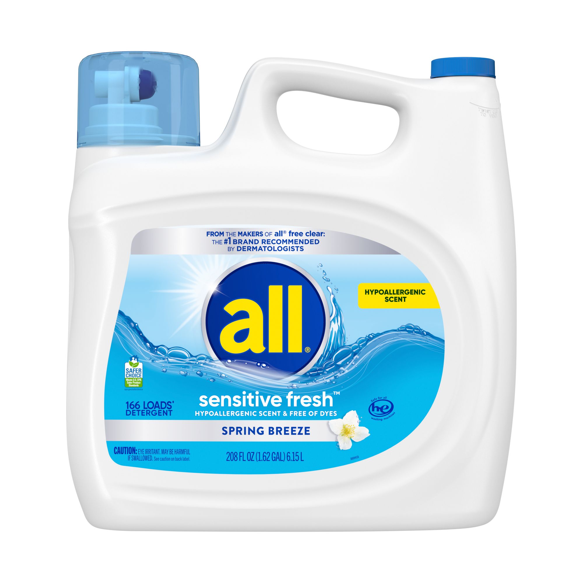 From the makers of all® free clear: The #1 Brand Recommended by Dermatologists 100% Free of Dyes, Hypoallergenic scent Now more concentrated. More cleaning power per drop* Spring Breeze Scent Removes impurities without leaving irritating residues** all® Sensitive Fresh™ includes biodegradable surfactants. Safe for septic systems. Works effectively, even in cold water. As always, contains no phosphates. Safe for all HE washing machines. This package includes one 208-ounce bottle of all® Sensitive Fresh liquid laundry detergent, enough for 166 loads