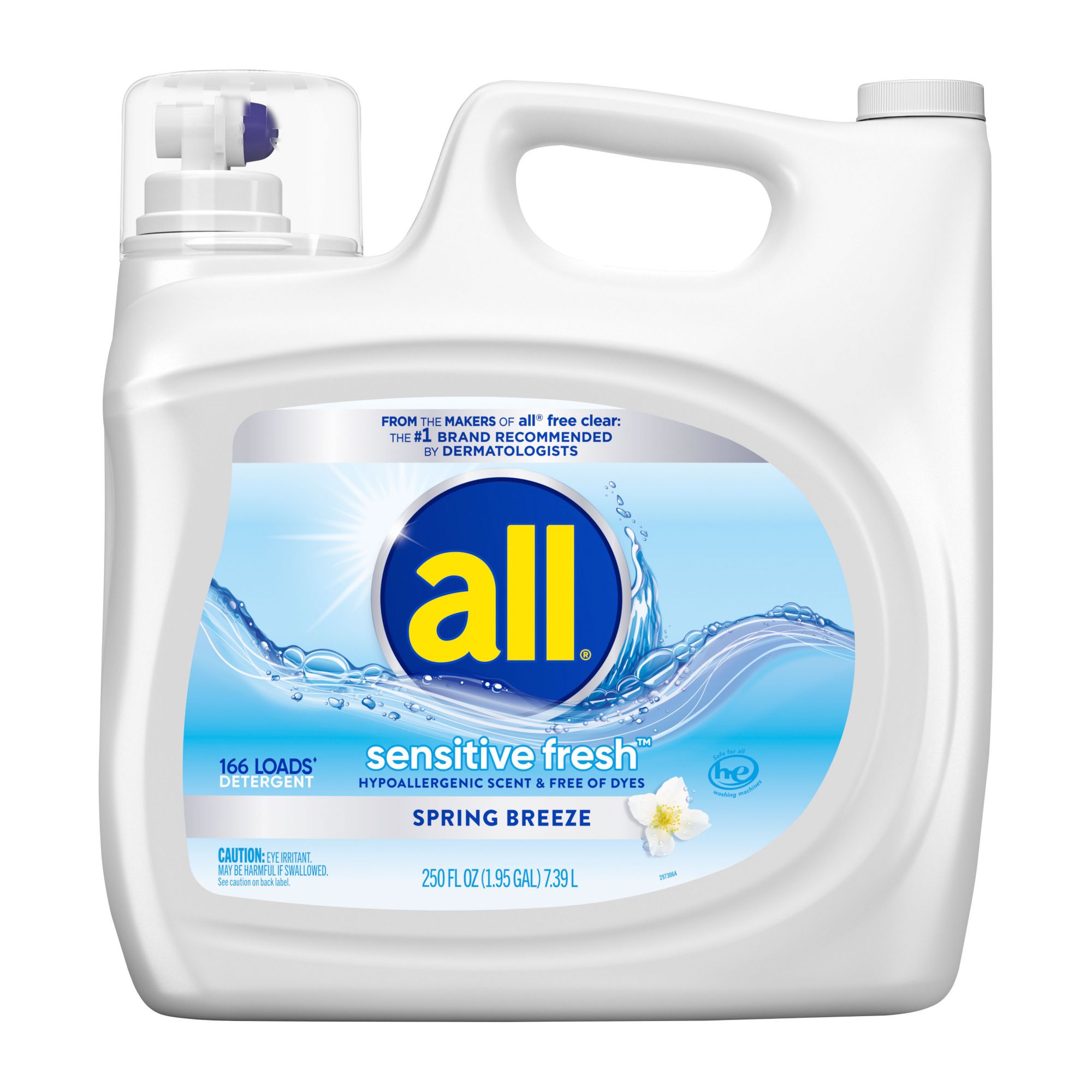 Gentle on skin with a hypoallergenic scent 100% free of dyes From the makers of all free clear: the #1 brand recommended by dermatologists Removes 99% of top everyday and seasonal allergens* Works effectively, even in cold water (1) all Sensitive Fresh Liquid Laundry Detergent, 166 loads/250 oz.