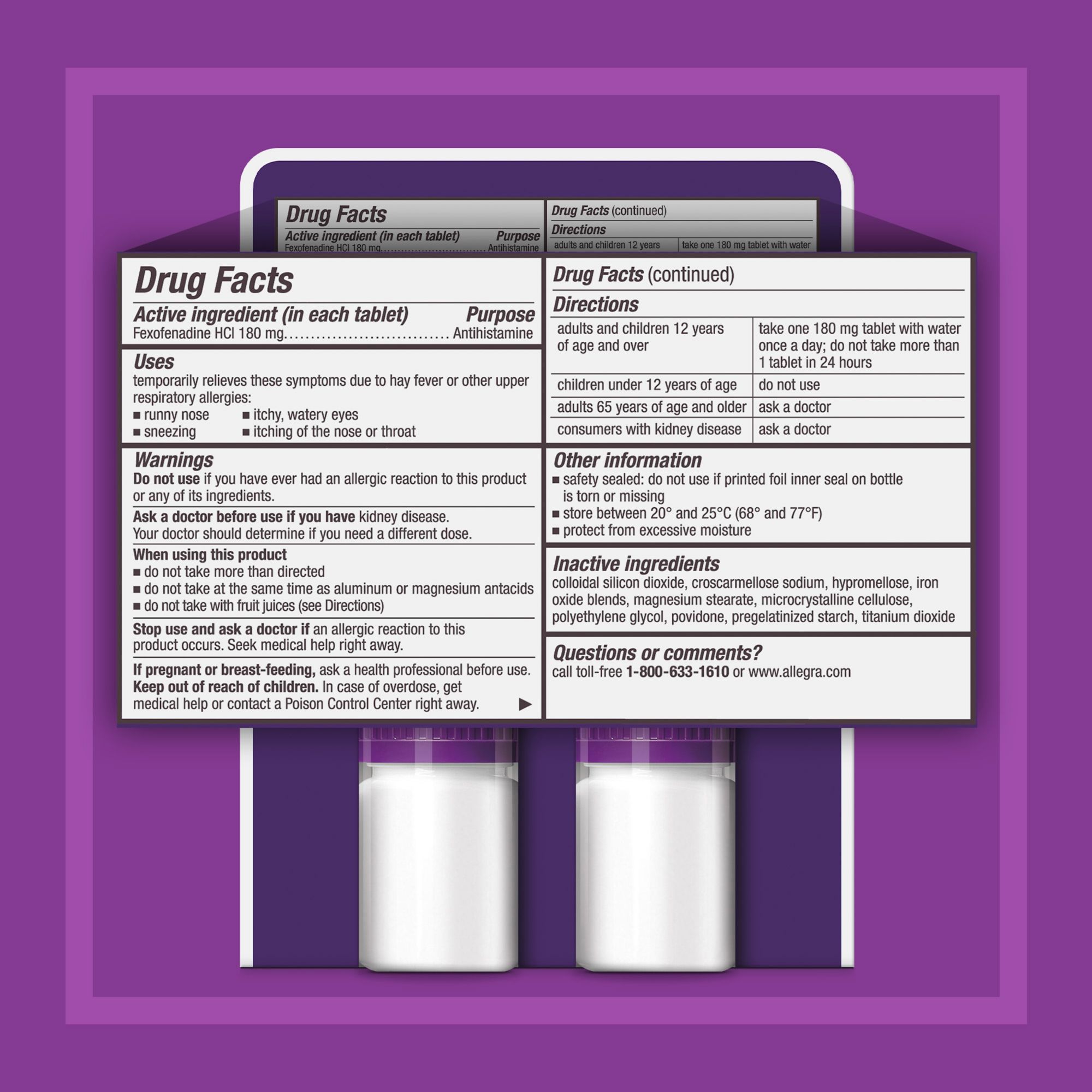 Two 55-count bottle of Allegra Adult Non-Drowsy Antihistamine Tablets for 24-Hour Allergy Relief One pill is all you need for round-the-clock relief from your worst allergy symptoms Allegra 24-Hour Allergy starts working in one hour for fast* relief from sneezing, runny nose, itchy and watery eyes, and itchy nose or throat Formulated with active ingredient fexofenadine, a non-drowsy antihistamine Use Allegra tablets for indoor and outdoor allergies, including seasonal allergies and pet allergies
