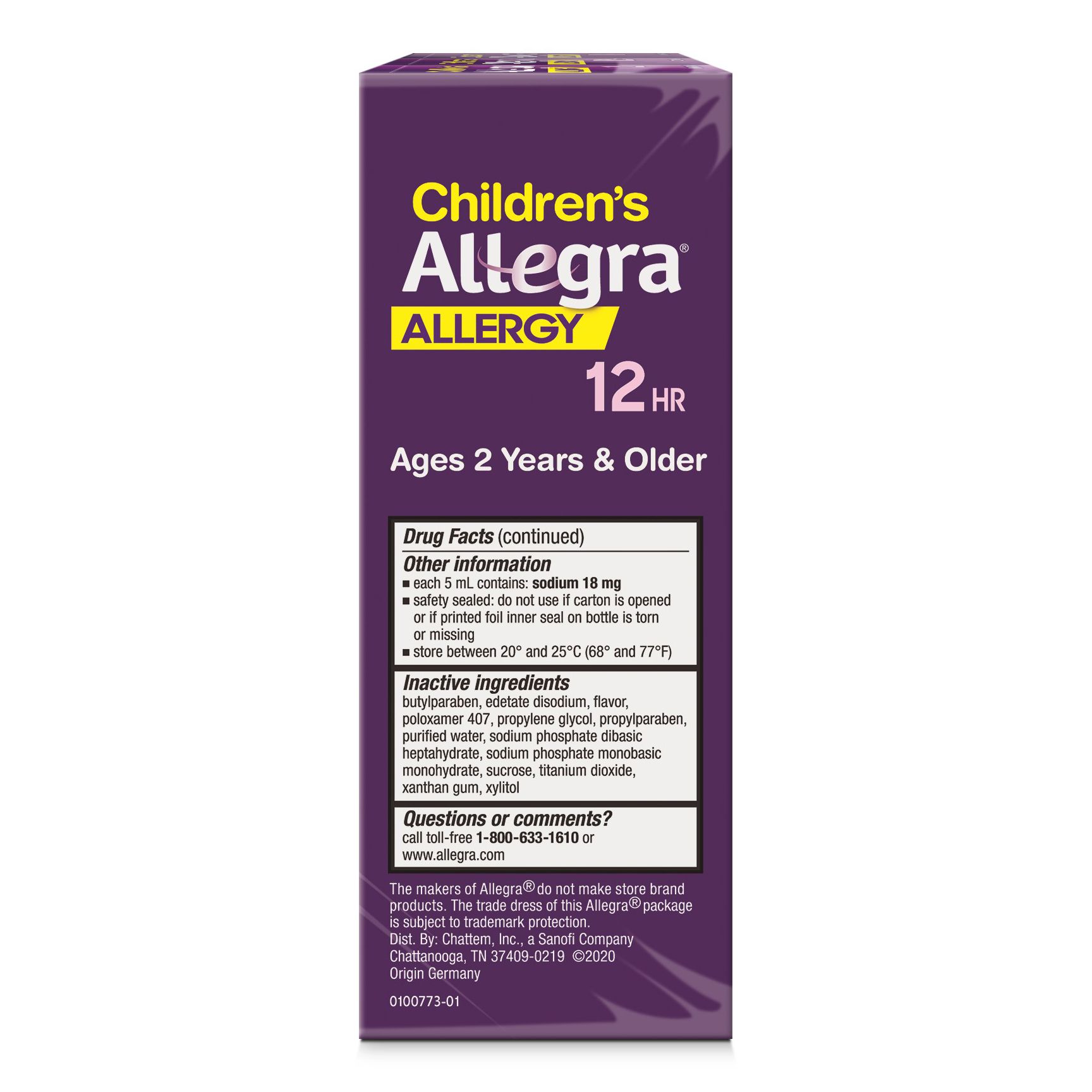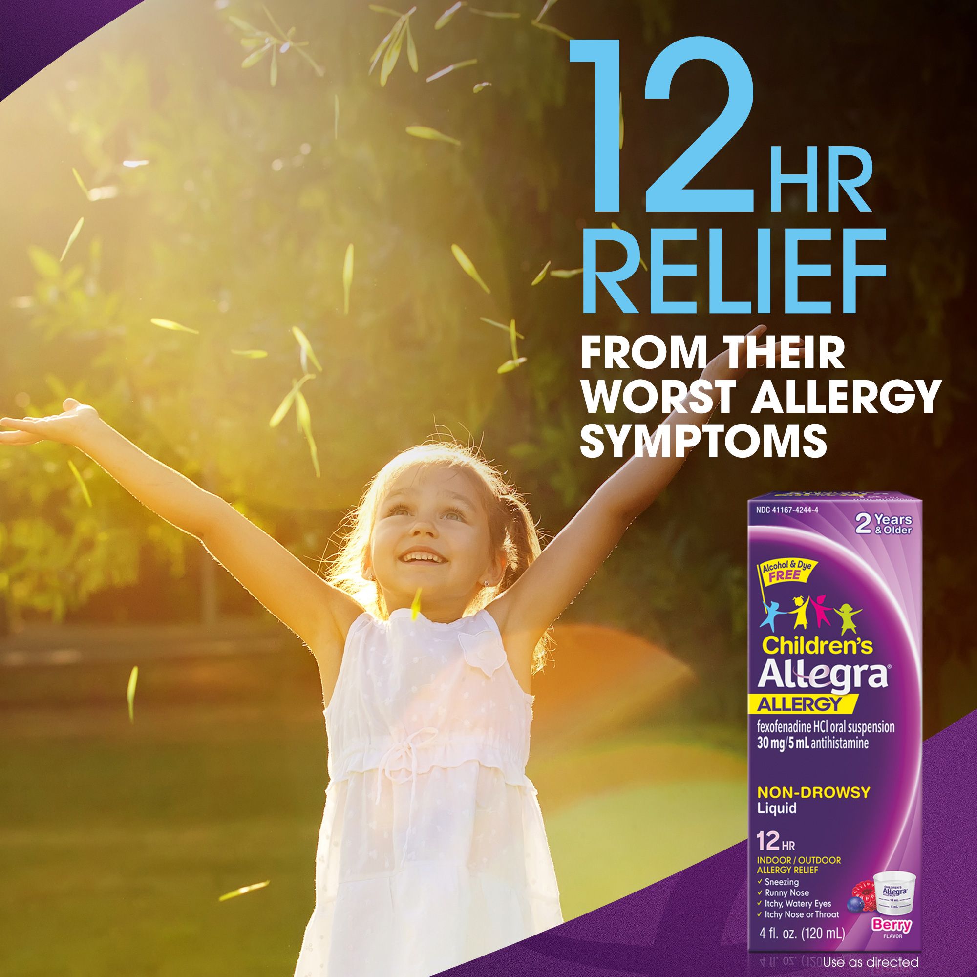 Kid allergies are unpleasant. Taking their allergy medicine doesn't have to be. Alleviate their worst allergy symptoms with Dye-Free Allegra Children's Non-Drowsy Antihistamine Liquid Berry Flavor. Children's Allegra for kids 2 years and older provides 12 full hours of non-drowsy relief from sneezing, runny nose, itchy and watery eyes, and itchy nose or throat. Use Allegra Children's Liquid for indoor and outdoor allergies, including seasonal allergies and pet allergies. Best of all, this berry-flavored allergy medicine is made with active ingredient fexofenadine, a non-drowsy antihistamine. Be ready for spring allergies, fall allergies, dog allergies and more. Stock up on Children's Allegra 12-Hour Berry Flavor Liquid Allergy Medicine.