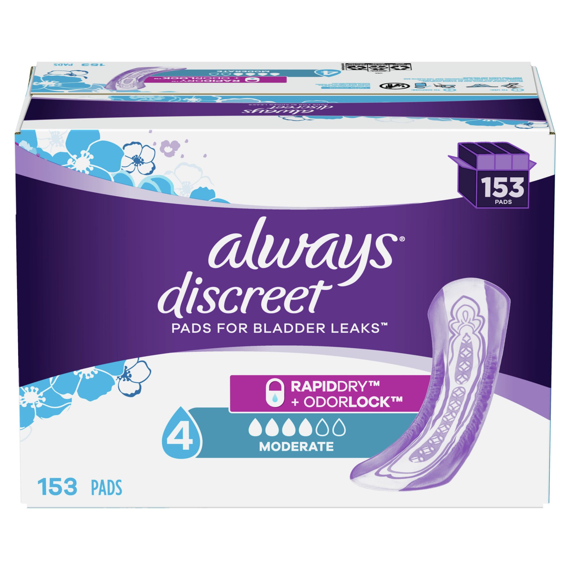 153 Incontinence Pads Always Discreet Moderate Incontinence Pads offer up to 100% leak-free protection Layered core turns liquid to gel and locks it away Pads stay comfortably in place and are discreet under your clothing Drier without the bulk End-to-end core with side LeakGuards to help keep wetness away from the edges Always Discreet Moderate Absorbency Pads are ideal for frequent leaks