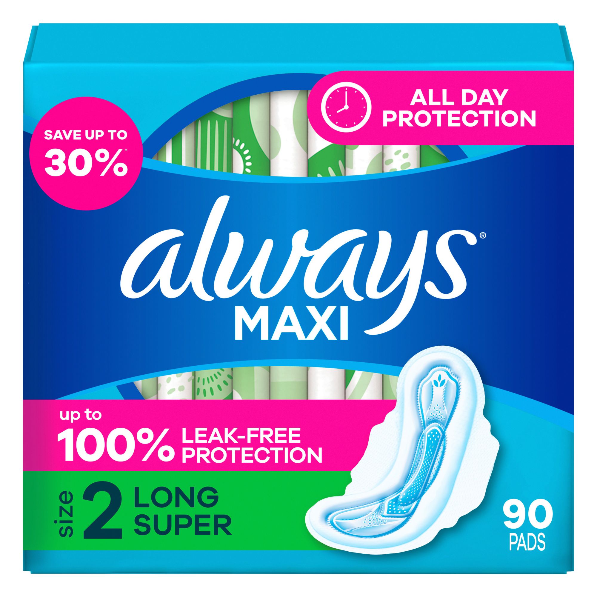 Always Maxi Feminine Pads with Wings for Women, Size 2, Long Super Absorbency, Unscented, 90 ct.