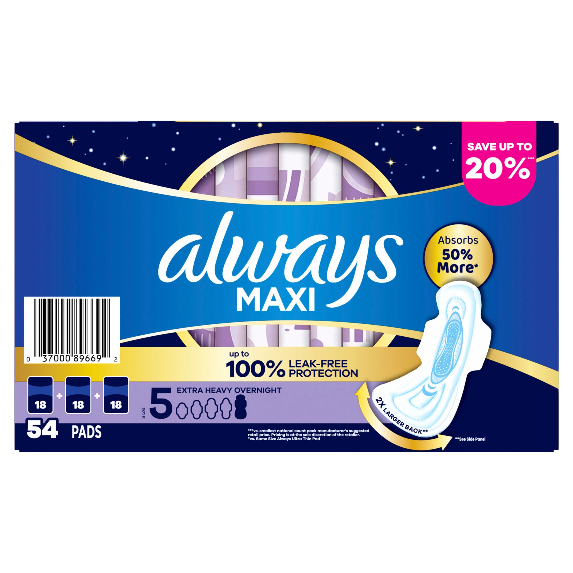 Always Maxi Overnight Pads with Wings for Women, Size 5, Extra Heavy Overnight Absorbency, 54 ct.