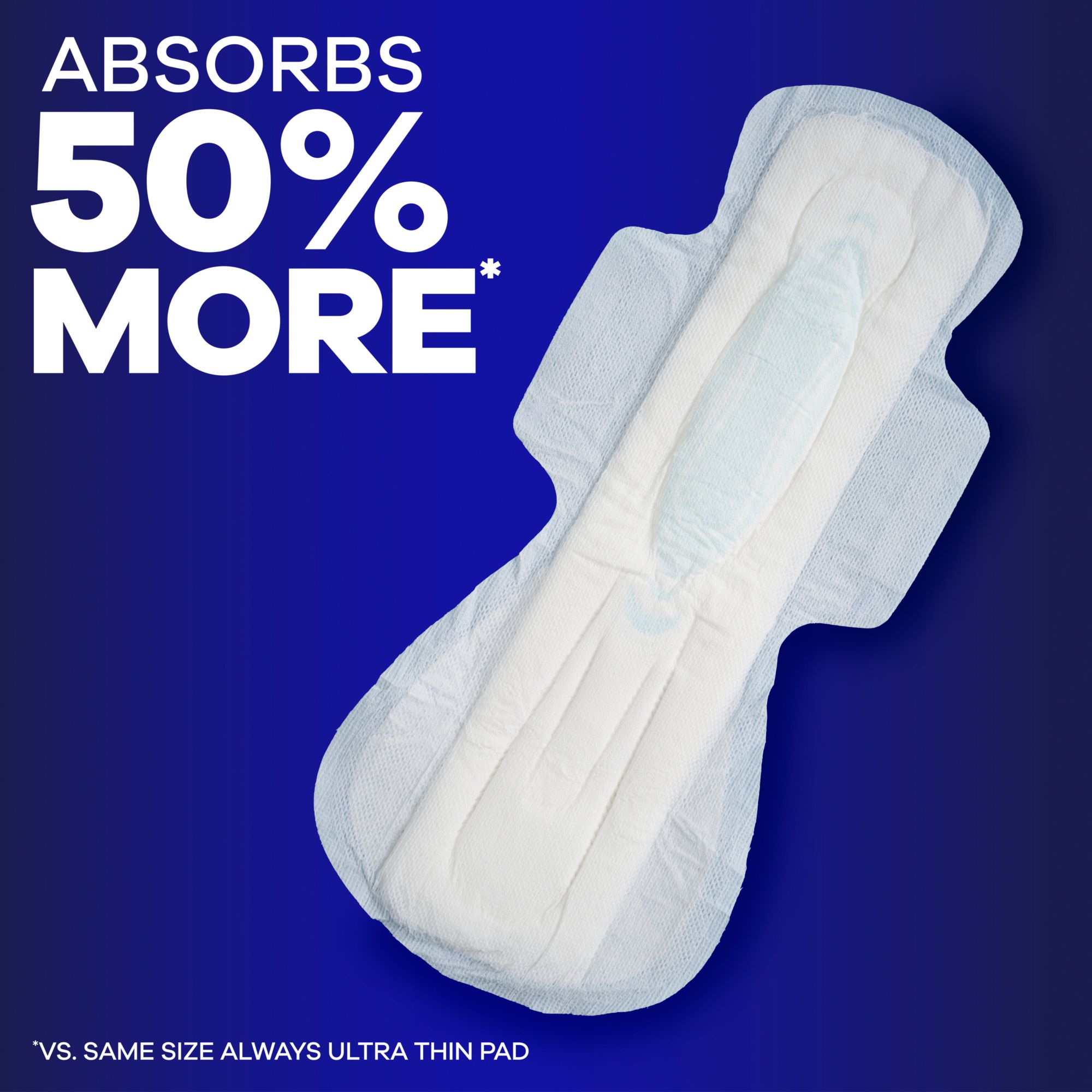 Always Maxi Overnight Pads provide you a perfect night sleep with 2X more coverage on the back for up to 100% Leak Free Comfort, no matter how you sleep. If you're looking for uncompromised period protection, you've come to the right place. Always Maxi Pads absorb 50% more vs. same size Always Ultra Thin. Additionally, Always Maxi Pads also feature the Always advanced 3X Protection System to give you up to 100% leak free protection throughout your days and nights. Always Maxi Pads possess RapidDRY Technology, which works to wick away gushes fast to absorb more than you may need. The LeakGUARD core locks in leaks for long-lasting protection to keep you fresh and clean, and SecurelyFITS helps the pad stay in place throughout no matter what you do. Make sure that you are getting the right protection from your pad, as using the wrong pad size can lead to leaks. Always Maxi Pads come in a range of sizes fit your flow and size perfectly depending on your needs. If you have a light flow or need a teen-sized pad, then we would recommend using our Always Maxi Pad size 1 to 3. If you have a heavy flow or want overnight protection, then we recommend using our size 4 or 5 Always Maxi Pad. Always has got your flow covered day and night for up to 100% leak-free comfort.