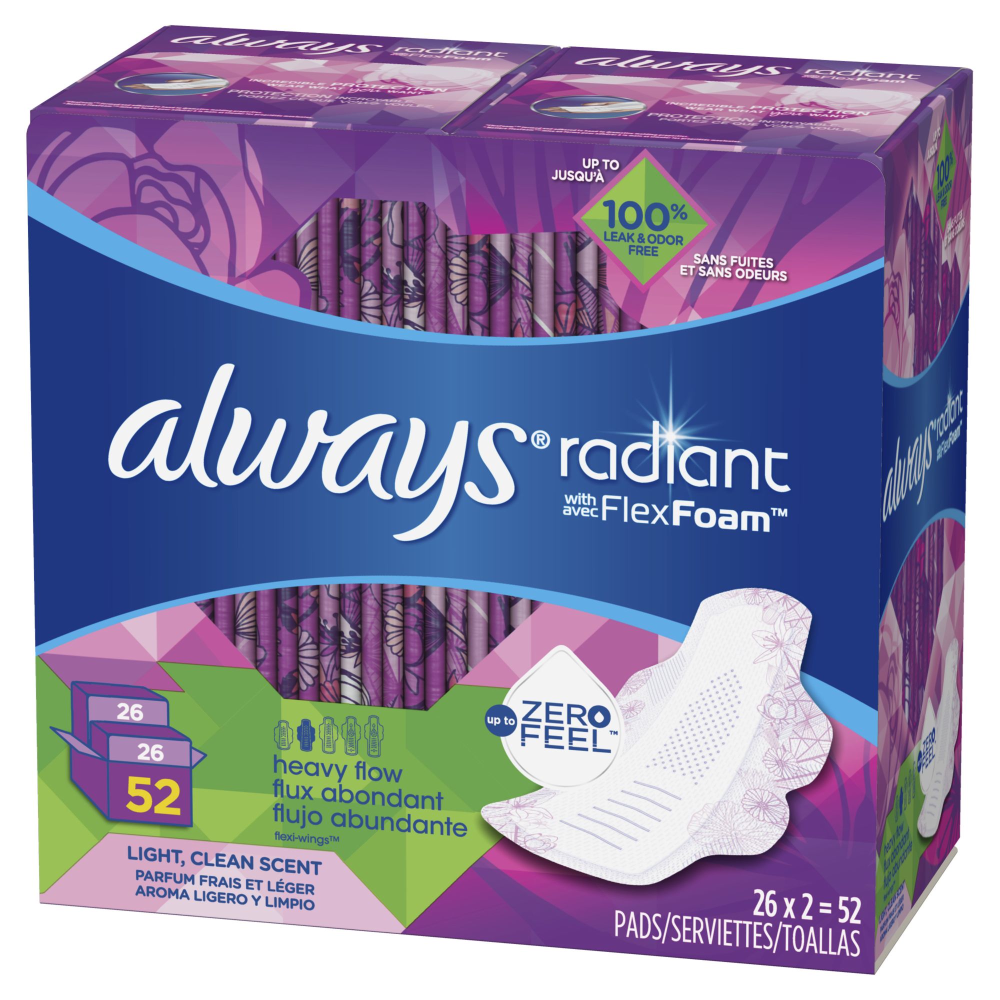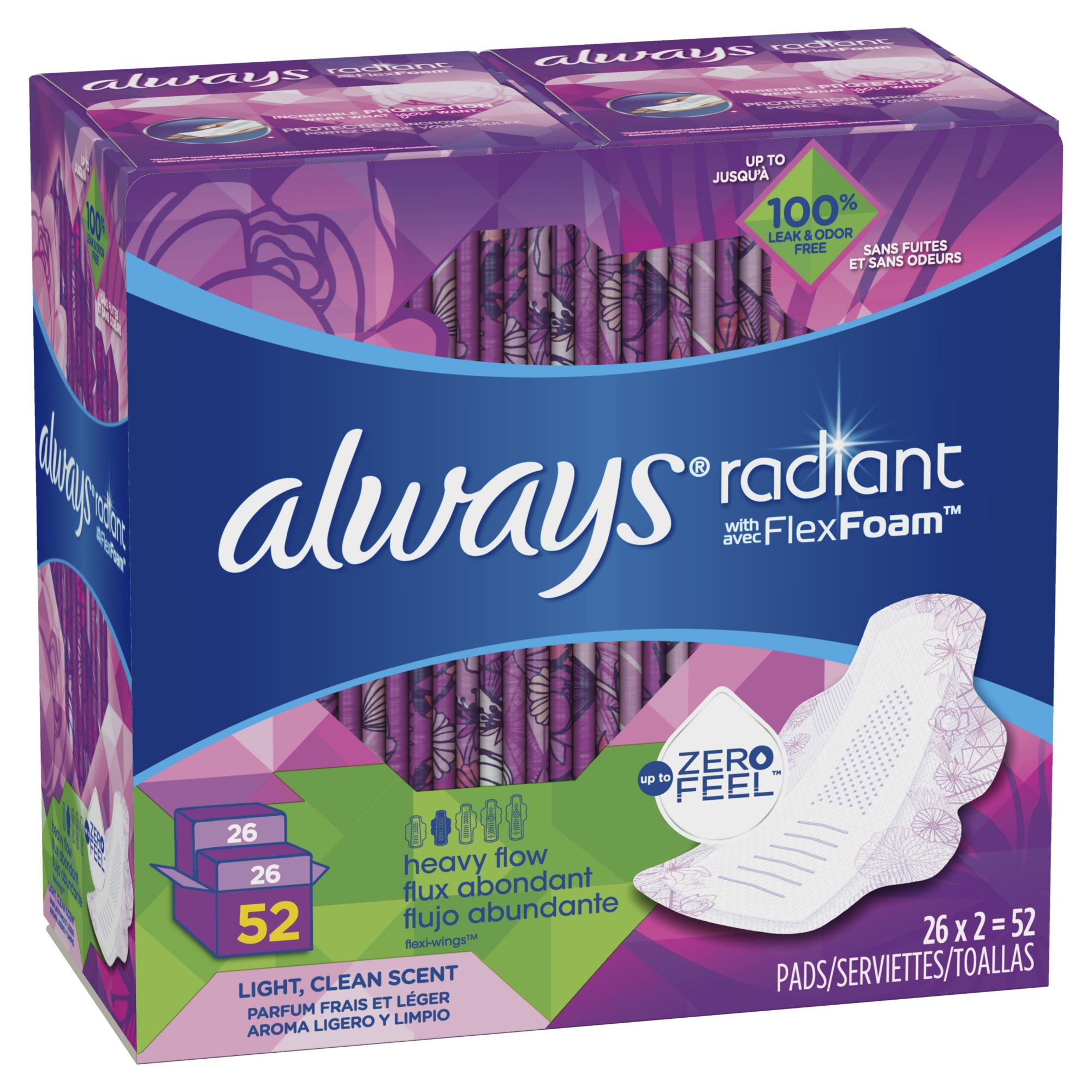 Club pack Get up to 100% leak & odor-free protection with Always Radiant Size 2 Sanitary Pads Zero Feel protection for all-day comfort Moisture-wicking technology ensures you stay clean and fresh throughout the day Delightful details such as colorful design and quiet wrapper Always Radiant Sanitary Pads are lightly scented to keep you feeling fresh