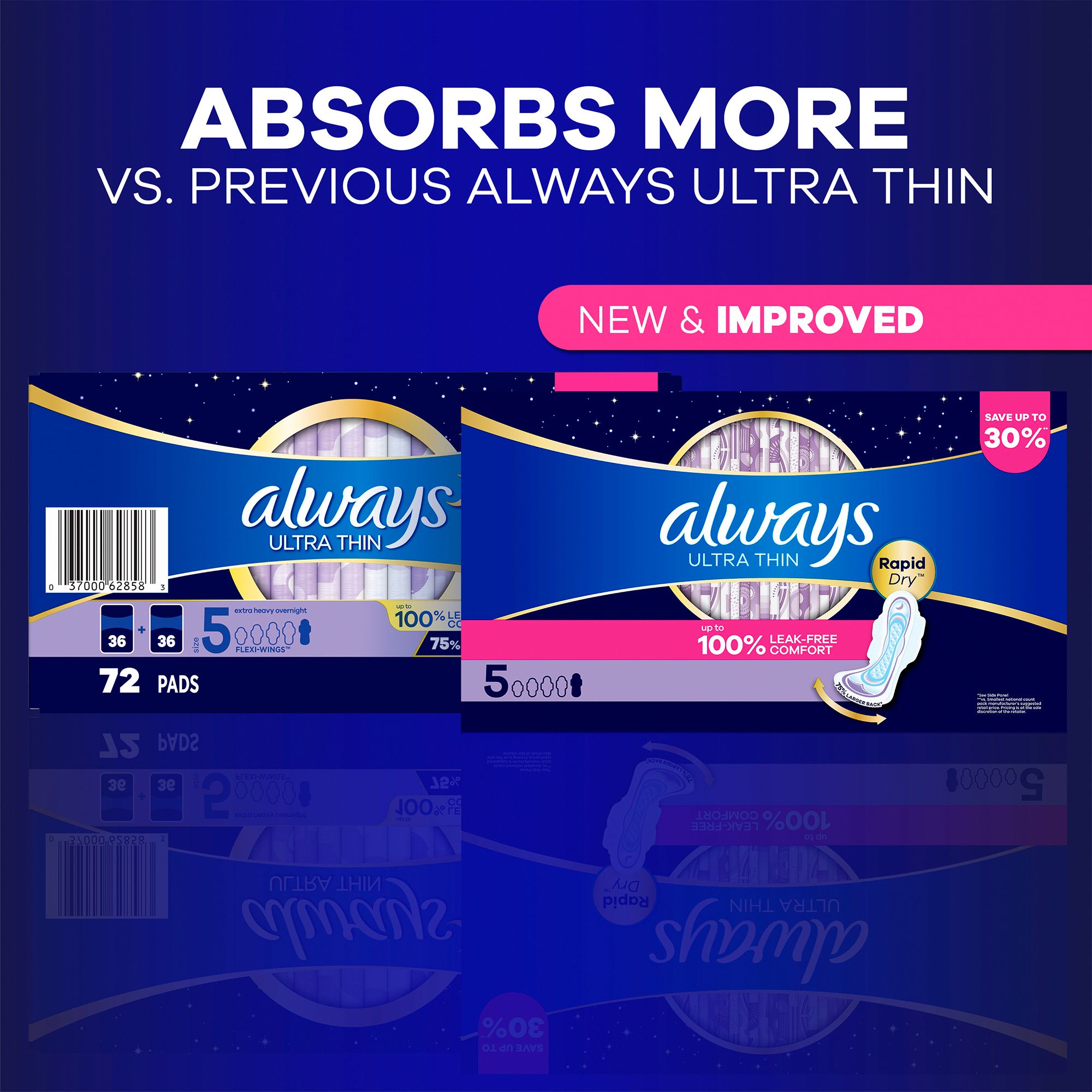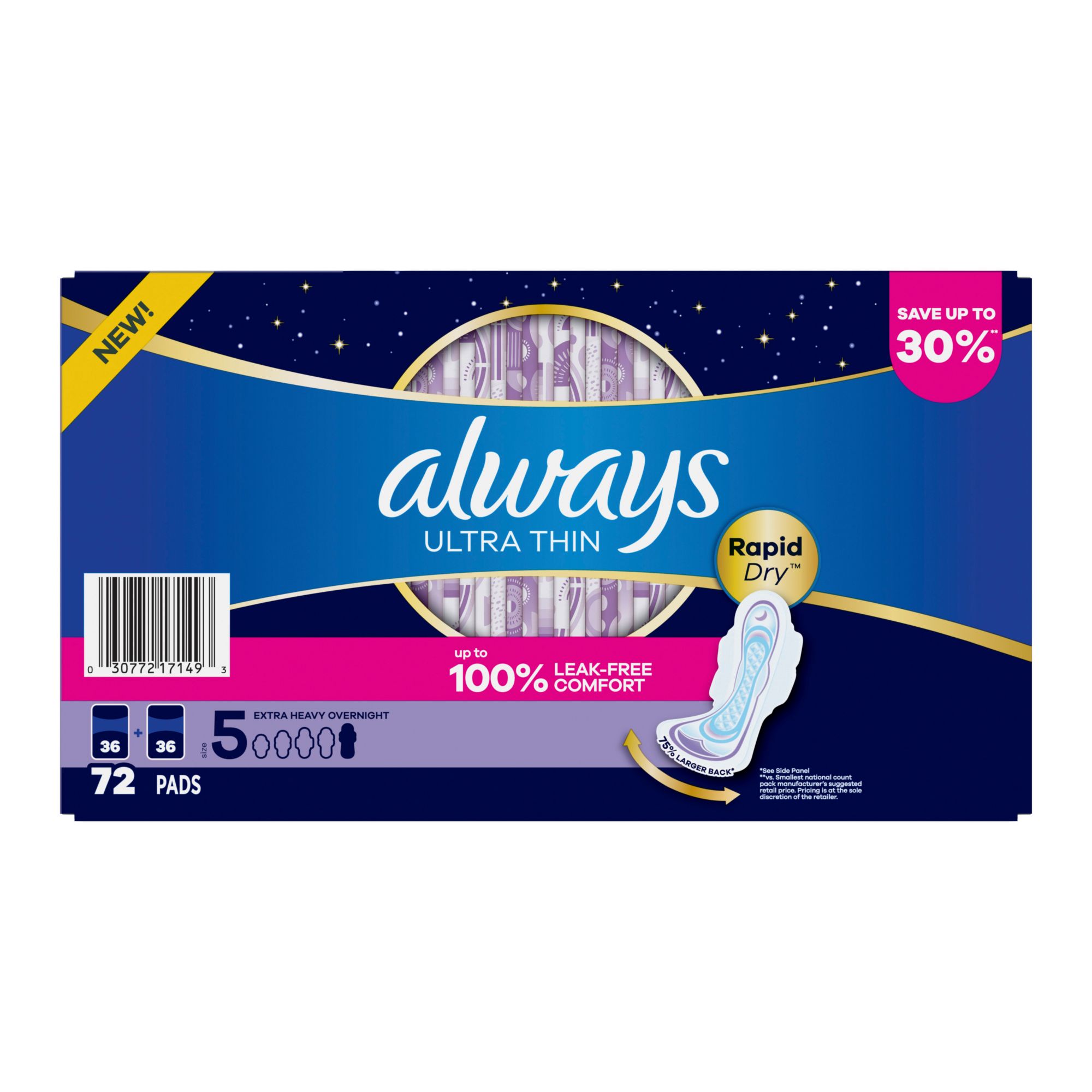 Always Ultra Thin Overnight Feminine Pads with Wings for Women, Size 5, Extra Heavy Overnight, 72 ct.
