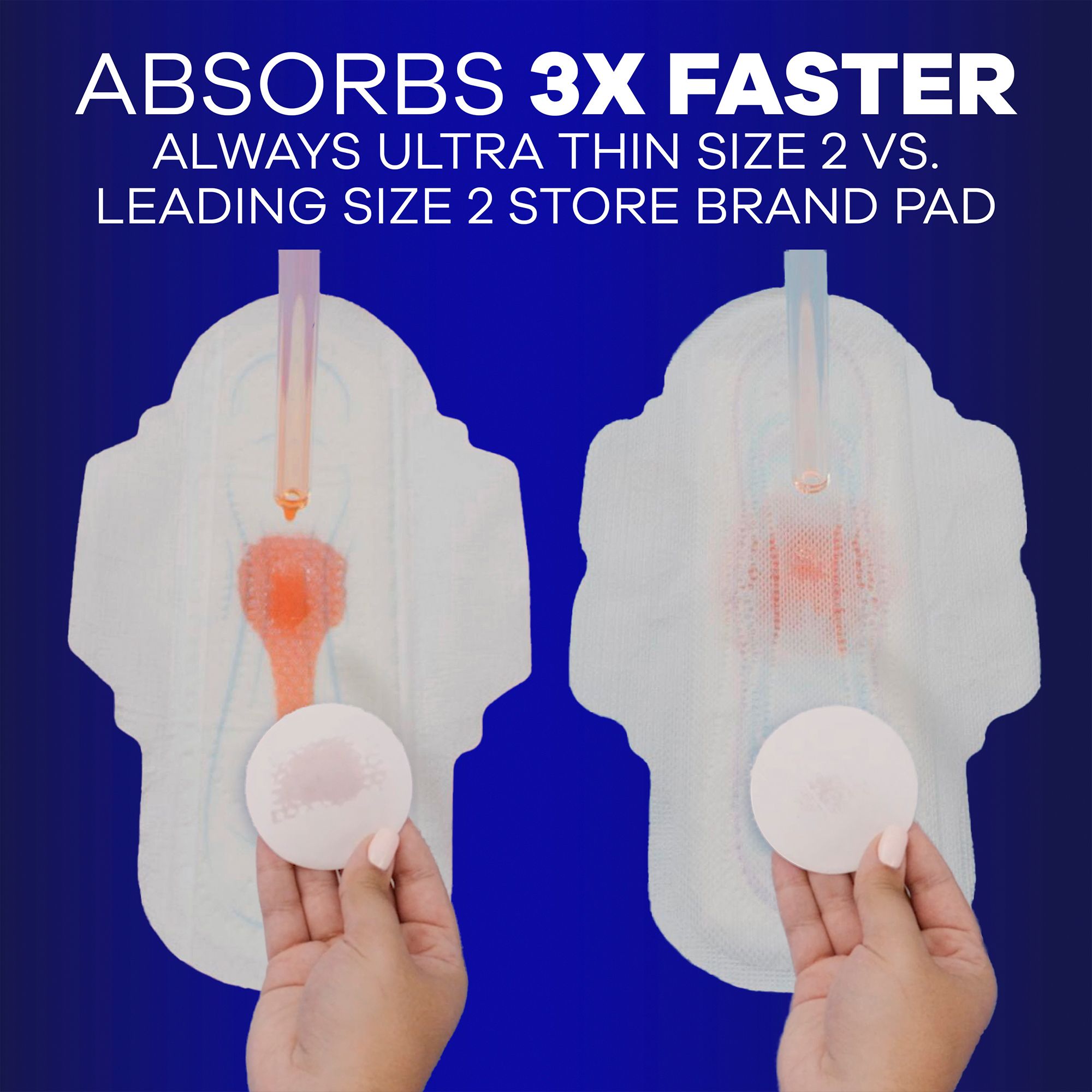 Absorbs 3x faster (Always Ultra Thin size 2 vs leading size 2 store brand pad)