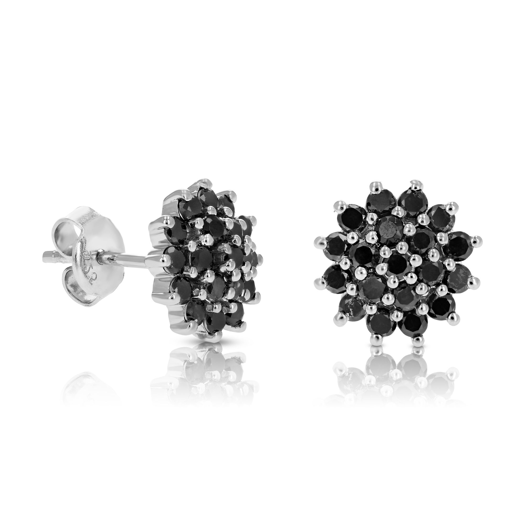 These lovely, elegant 1 ct. t.w. black diamond stud earrings are set in .925 sterling silver with rhodium plating. The diamonds are arranged in a floral style cluster. The dazzling natural black diamonds are heat treated. The width of the earring is .33". Push backs (butterfly friction backs) and a gift box are included with purchase of these earrings.