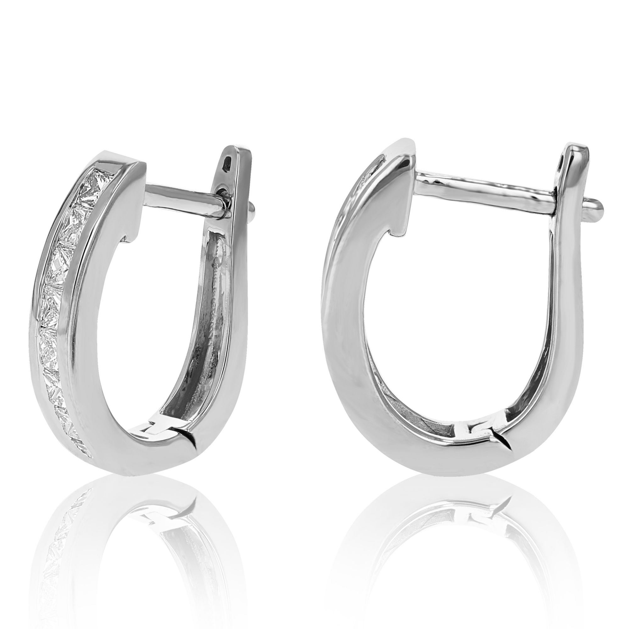 These lovely, elegant 1 ct. t.w. diamond hoop earrings are set in 14k white gold. The dazzling princess cut natural diamonds are SI2-I1 clarity and H-I color. The diamonds are set in a channel setting secured by hinge with notched post. The height of the earring is .50". The earrings weigh 3 grams. A gift box is included with purchase of these earrings.