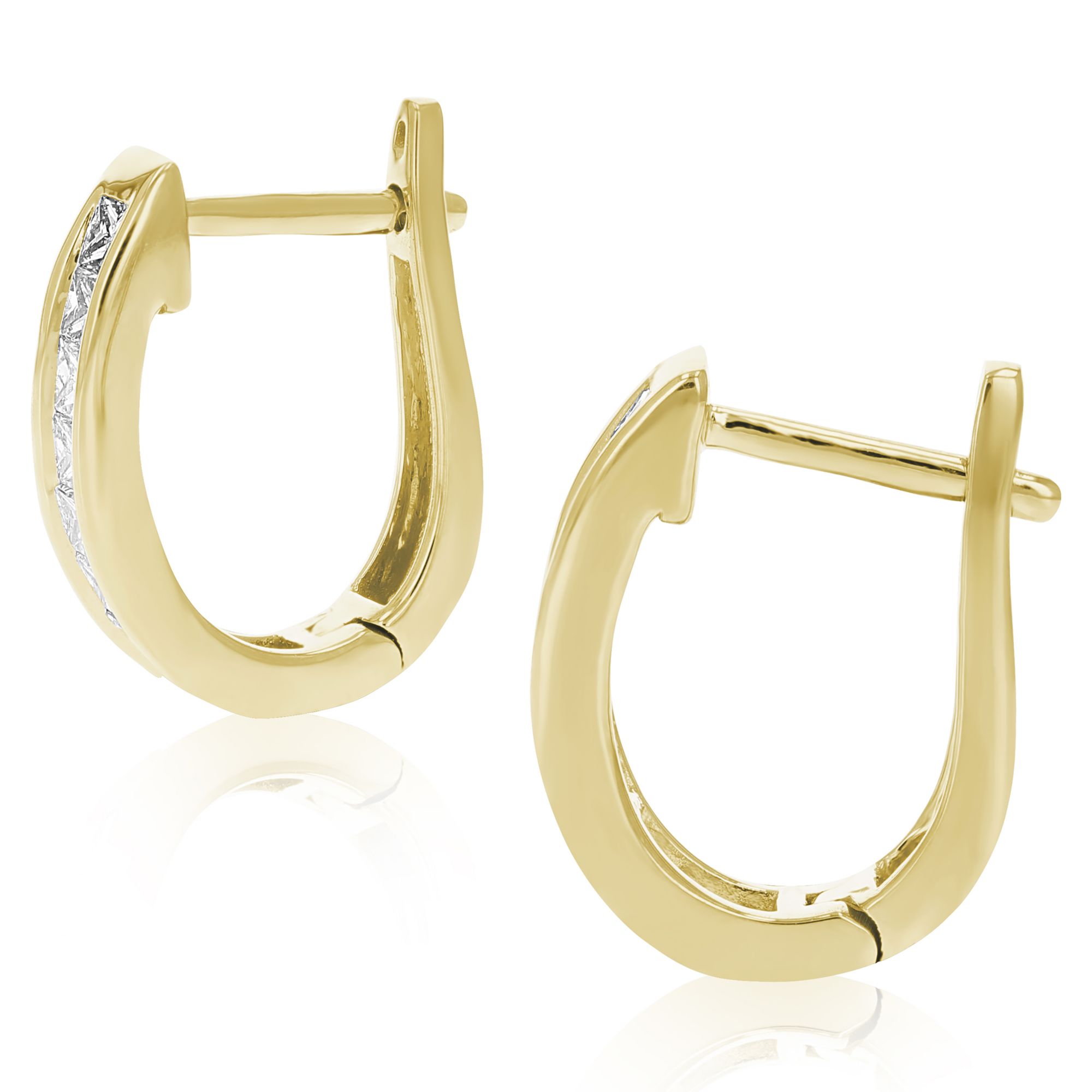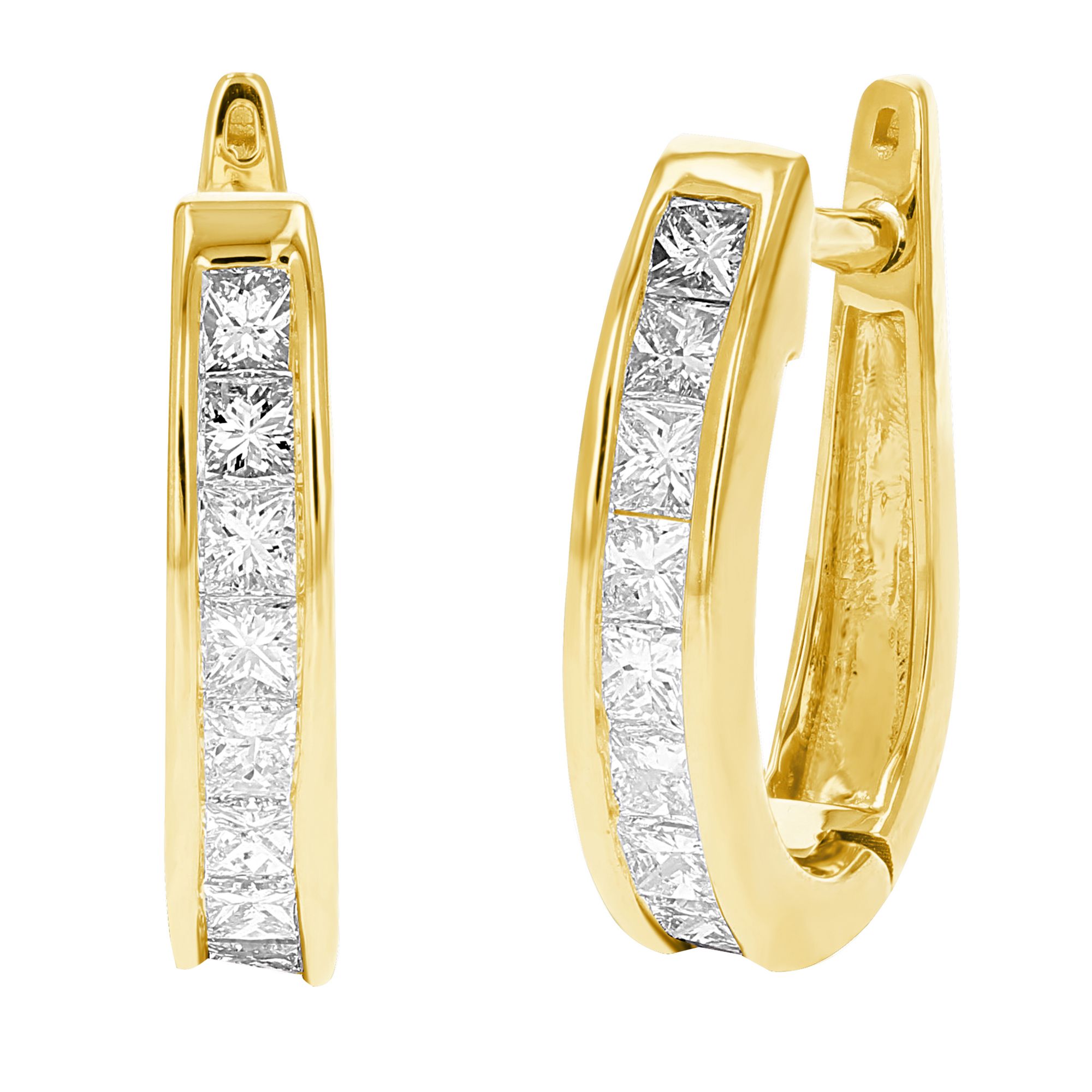 These lovely, elegant 1 ct. t.w. diamond hoop earrings are set in 14k yellow gold. The dazzling princess cut natural diamonds are SI2-I1 clarity and H-I color. The diamonds are set in a channel setting secured by hinge, with notched post. The height of the earring is .50". The earrings weigh 3 grams. A gift box is included with purchase of these earrings.