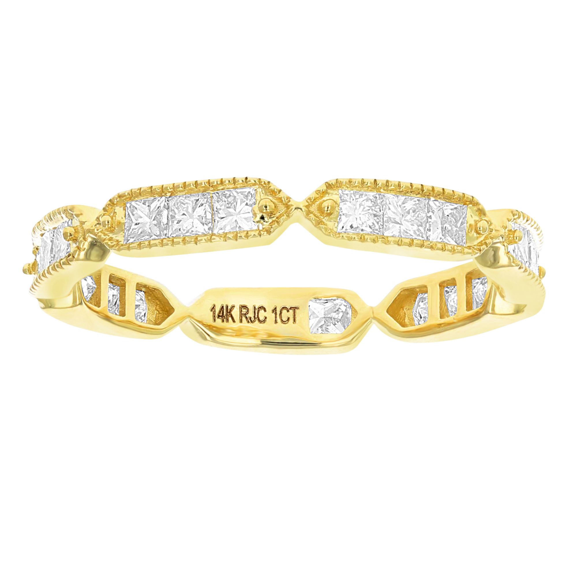 This lovely, elegant 1 ct. t.w. diamond eternity wedding band is set in 14k yellow gold. The natural princess diamonds are set in a channel setting with milgrain. The width of the ring is 3 mm, and the ring weighs 1.50 grams. This ring is available in multiple sizes. A gift box is included with this bridal ring.