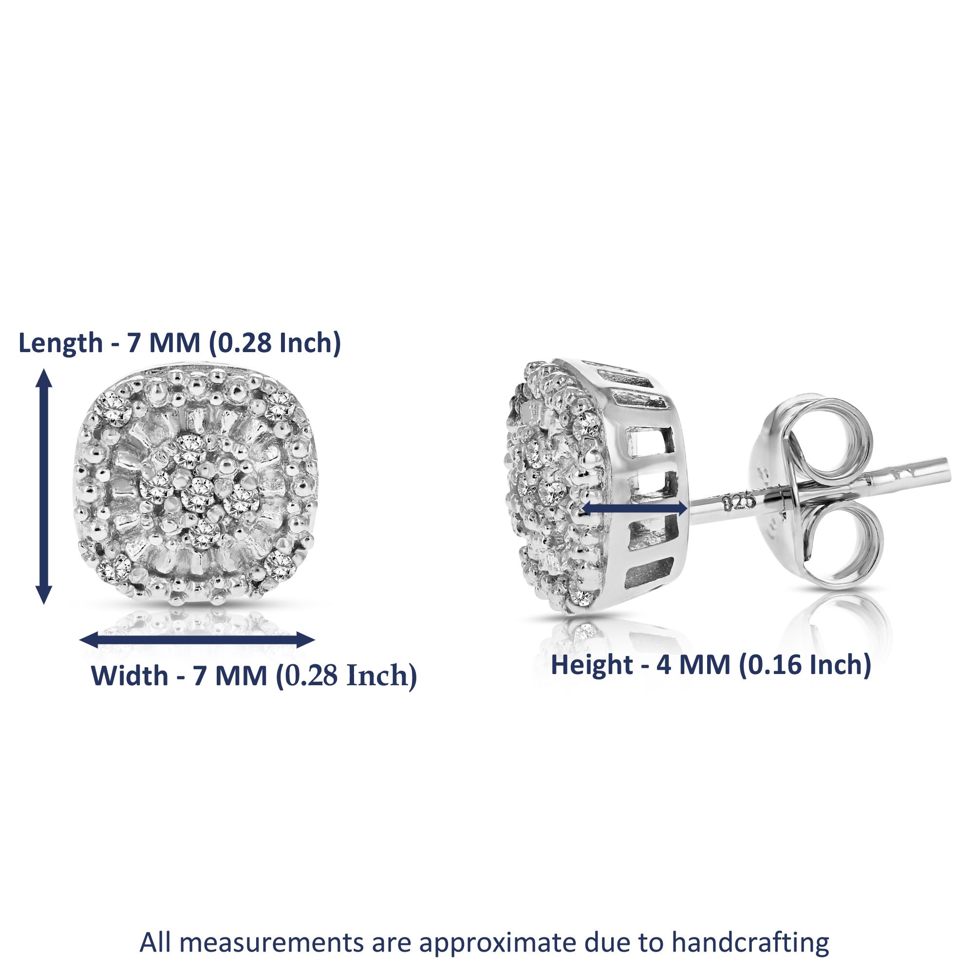 Gorgeous .10 ct. t.w. diamond dangle earrings in .925 Sterling silver with rhodium plating cushion shape. The 18 dazzling diamonds are natural. The width of the earring is 7mm while the length is 7mm. Push backs (butterfly friction backs) and a gift box are included with purchase of these earrings.