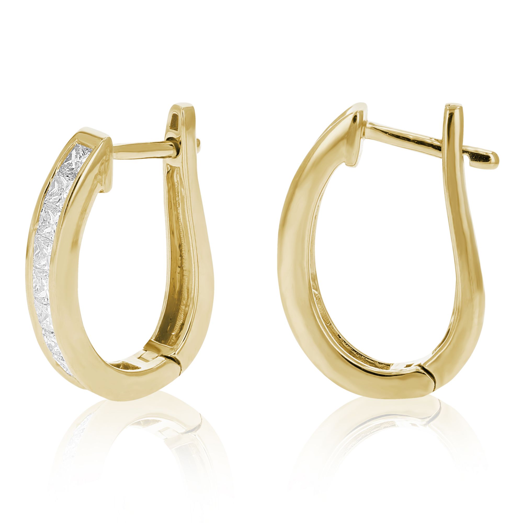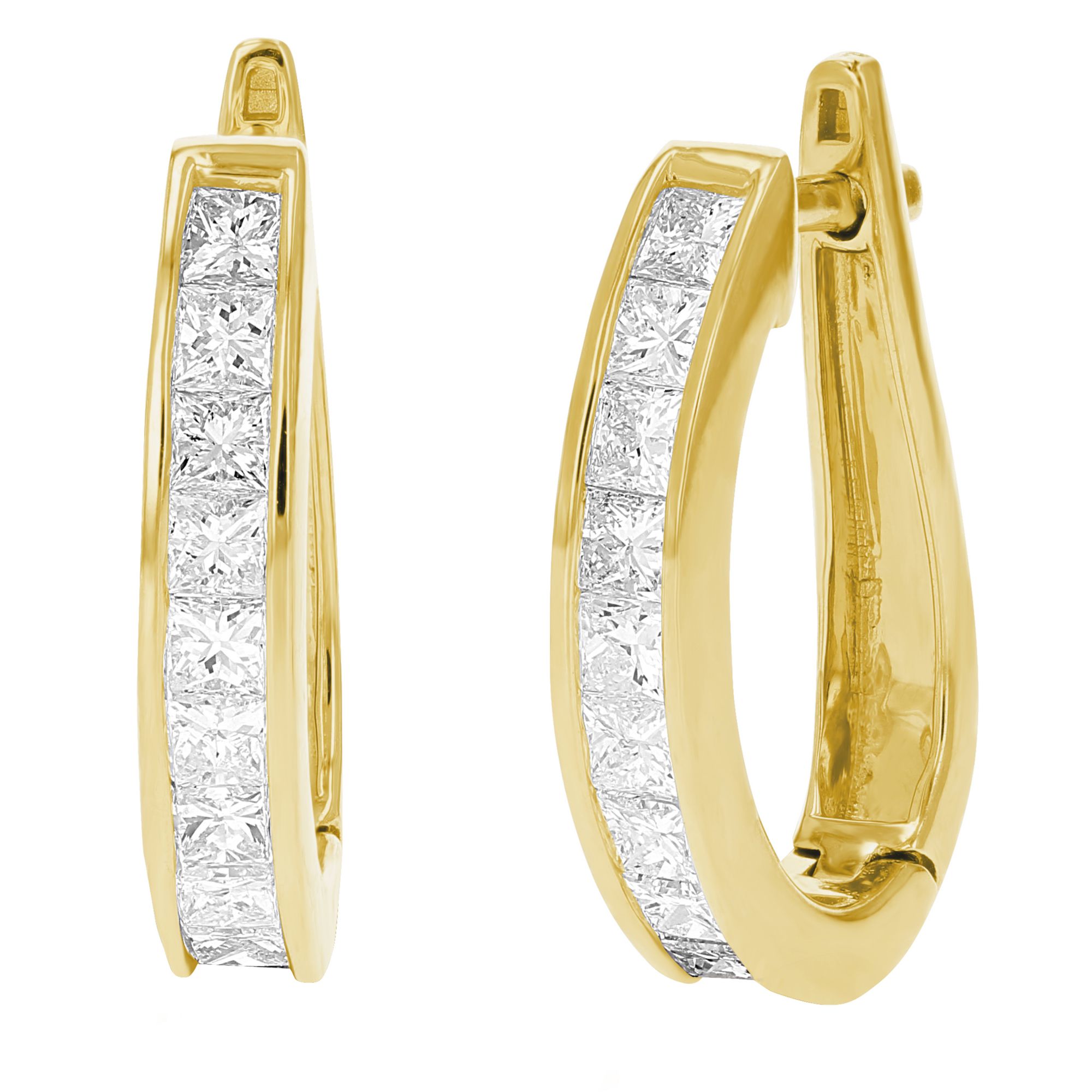 These lovely, elegant 1.50 ct. t.w. diamond hoop earrings are set in 14k yellow gold. The dazzling princess cut natural diamonds are SI2-I1 clarity and H-I color. The diamonds are set in a channel setting secured by hinge, with notched post. The height of the earring is .75". The earrings weigh 4.40 grams. A gift box is included with purchase of these earrings.