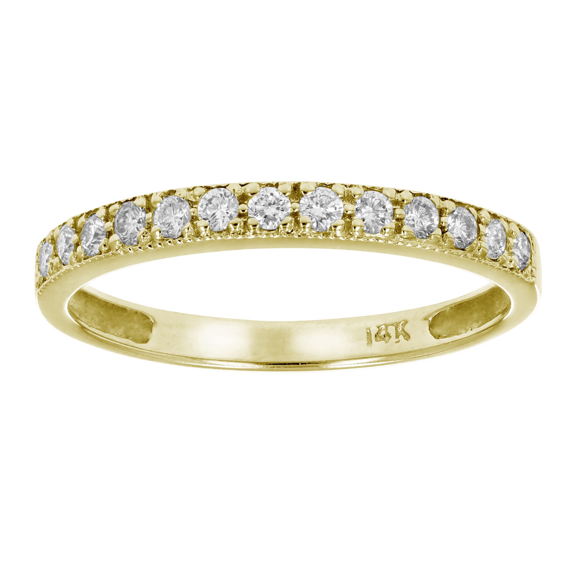 Style: Wedding Band Carat/ct. t.w.: .25 ct. t.w. Cut: Round Color: H-I Clarity: I1-I2 Count: 13 Gemstone: Diamond Lab Created: No Metal: 14k Yellow Gold Finish: Polished Warranty: 30 days