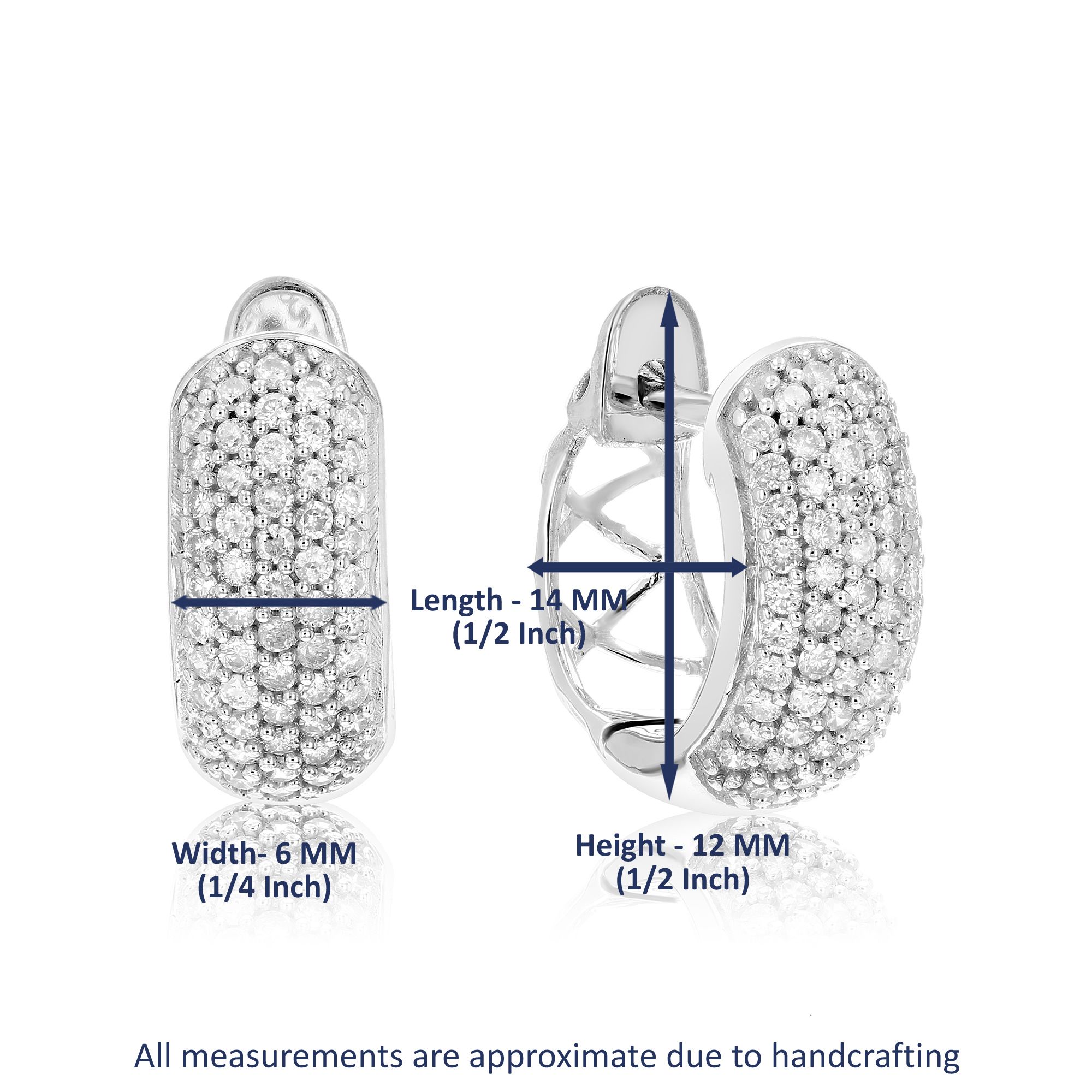 Highlight any and every look with these opulent .50 ct. t.w. hoop earrings, showcasing five rows of prong set diamonds. The stunning, natural diamonds are framed in .925 sterling silver with rhodium plating. These hoop earrings are bold and beautiful enough to be worn every day. The inside of the hoops has overlapping patterns, making the earrings all the more graceful. The width of the earrings is .25"", while the height is .50". The earrings have hinges with a notched post as closures, and are rhodium plated to give that extra sparkle. Gift box is included with purchase of these earrings.