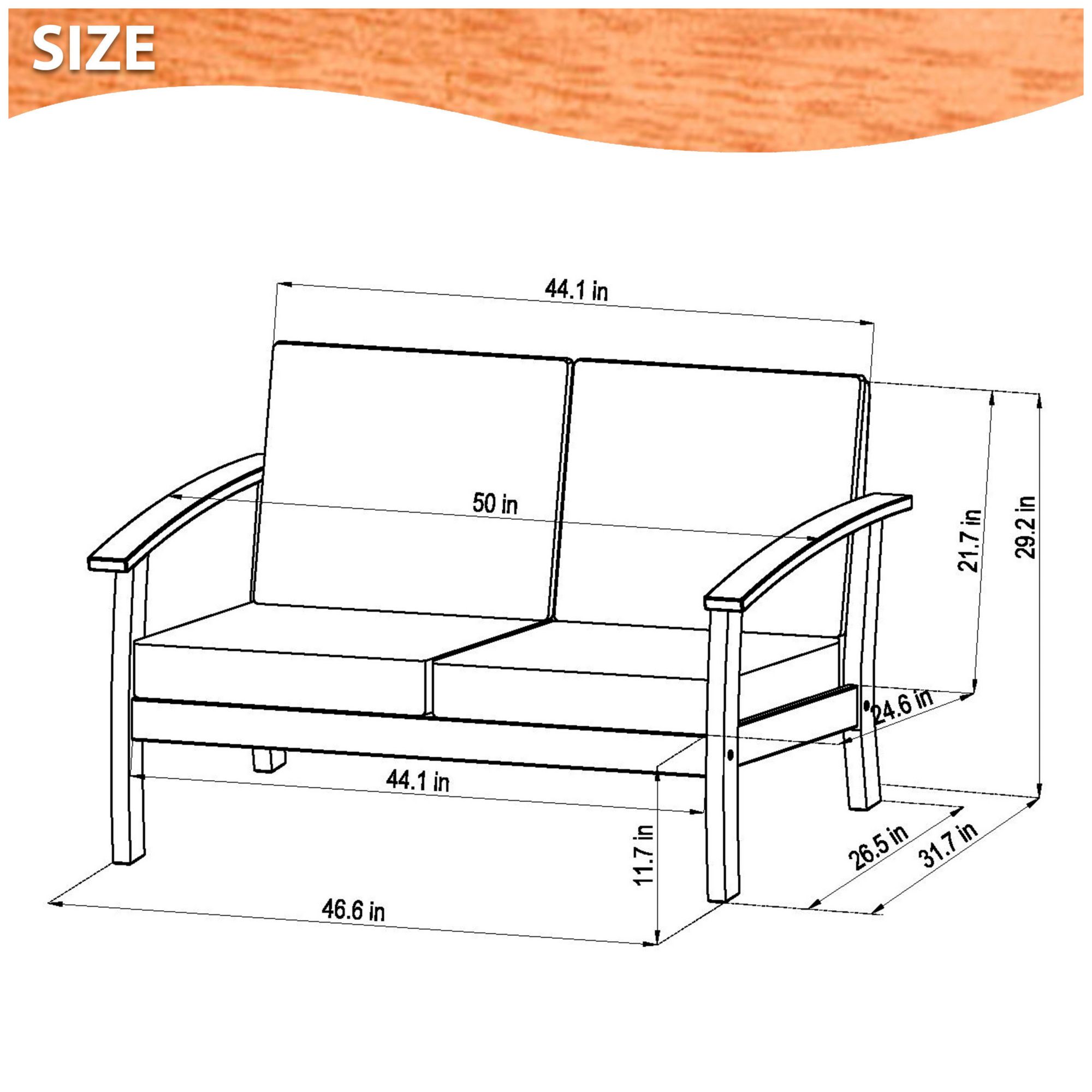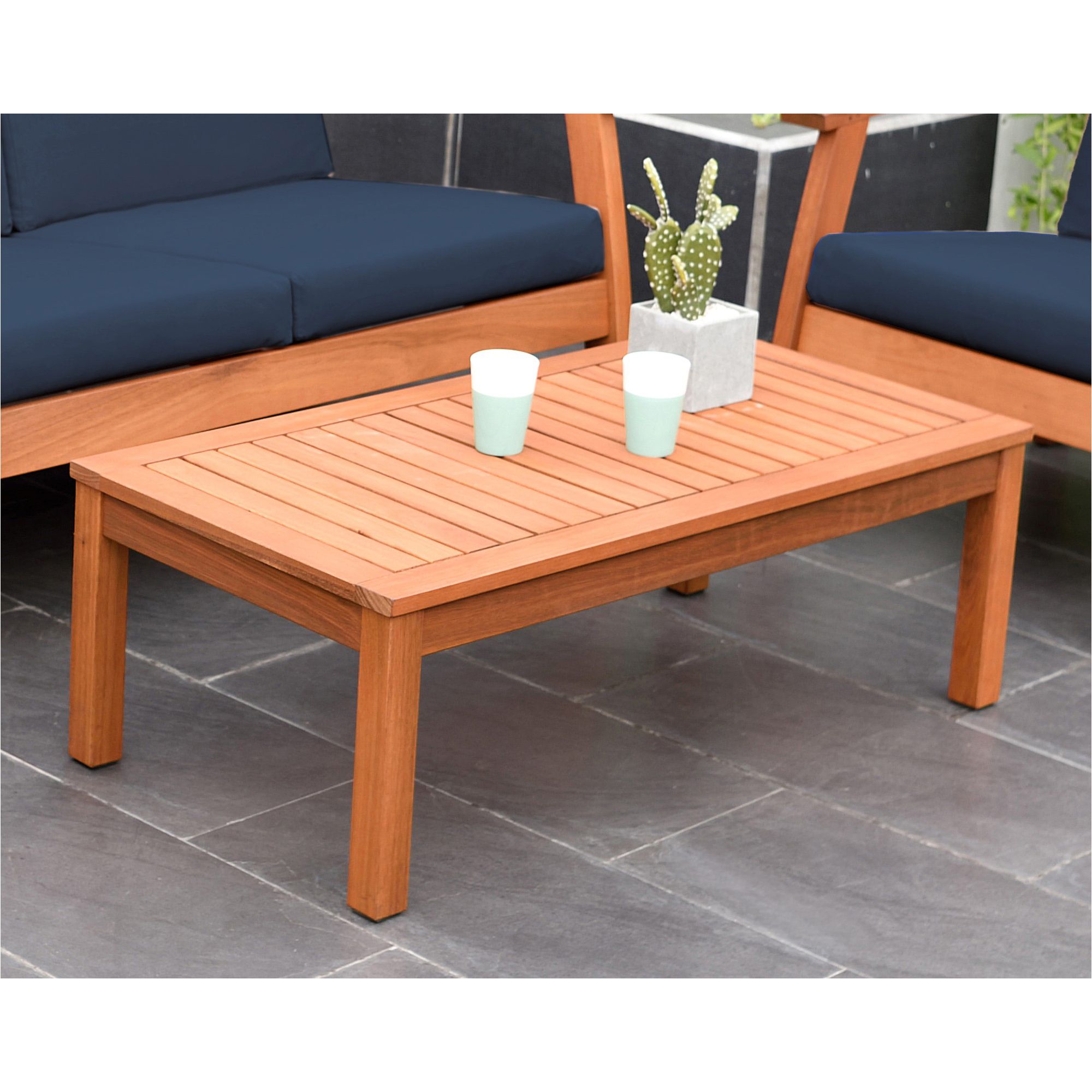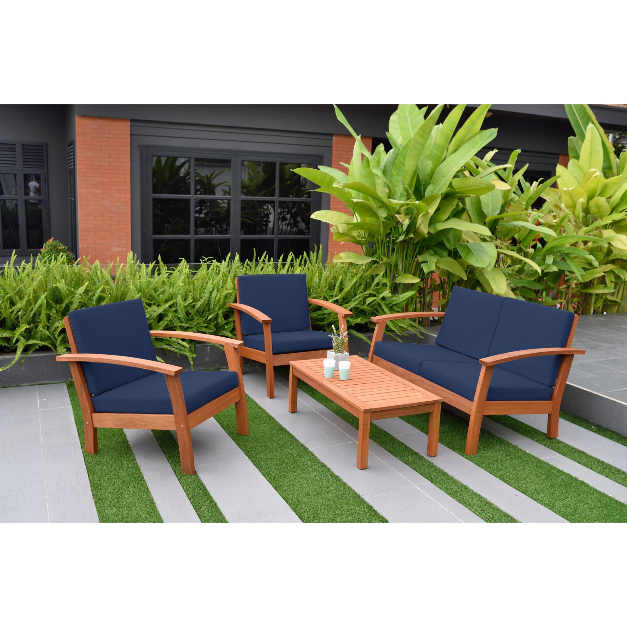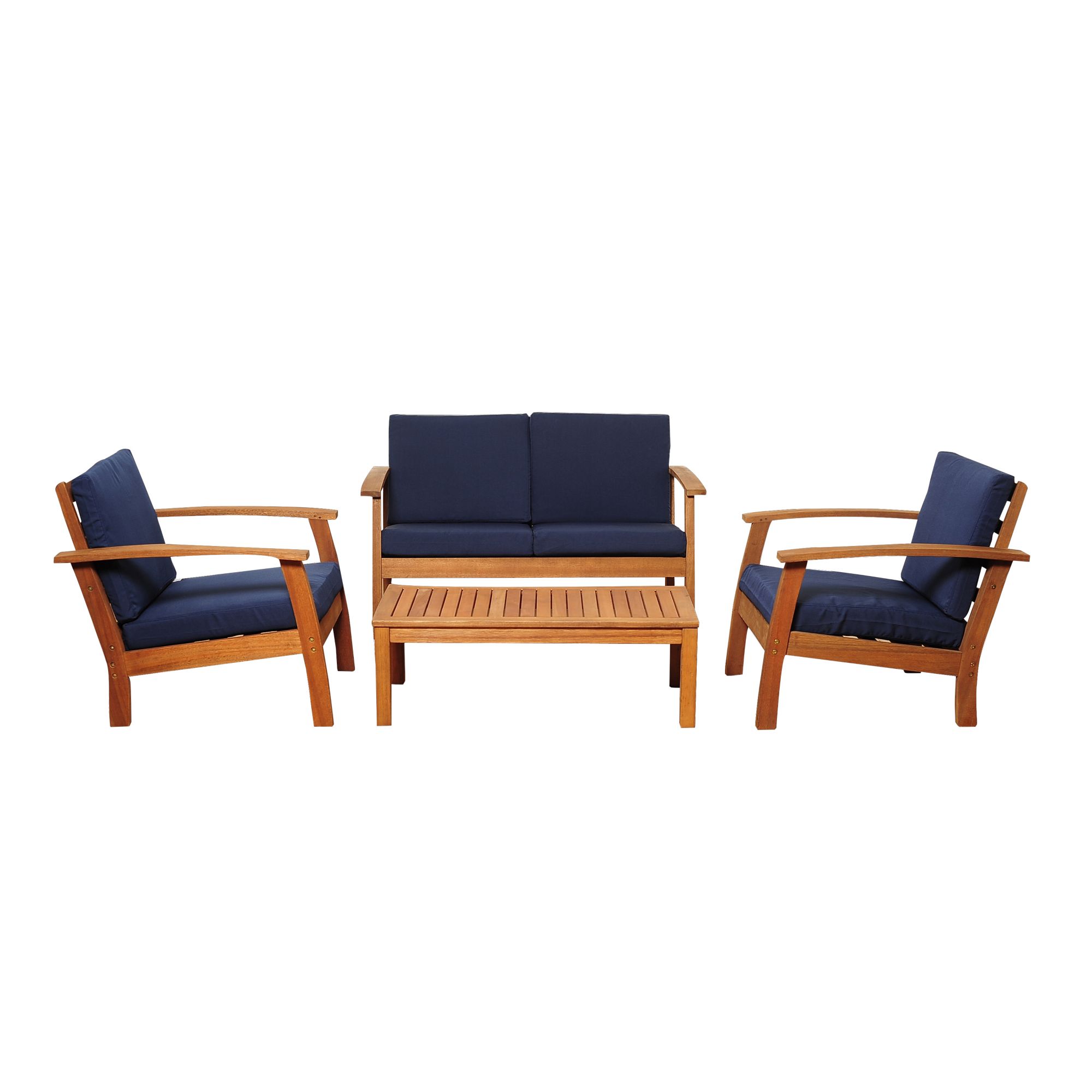 Entire set is made of 100% Eucalyptus wood Polyester blue cushions included Sofa dimensions: 32"L x 50"W x 25"H. Armchair dimensions: 32"L x 28"W x 25"H. Coffee table dimensions: 19"L x 38"W x 13"H Free Amazonia maintenance kit included with this set. Apply the first coat of sealer after assembly and thereafter re-apply up to four times a year or as needed. This process will help maintain color and prolong durability Includes 4-pc. outdoor patio seating set Warranty: 1 year limited