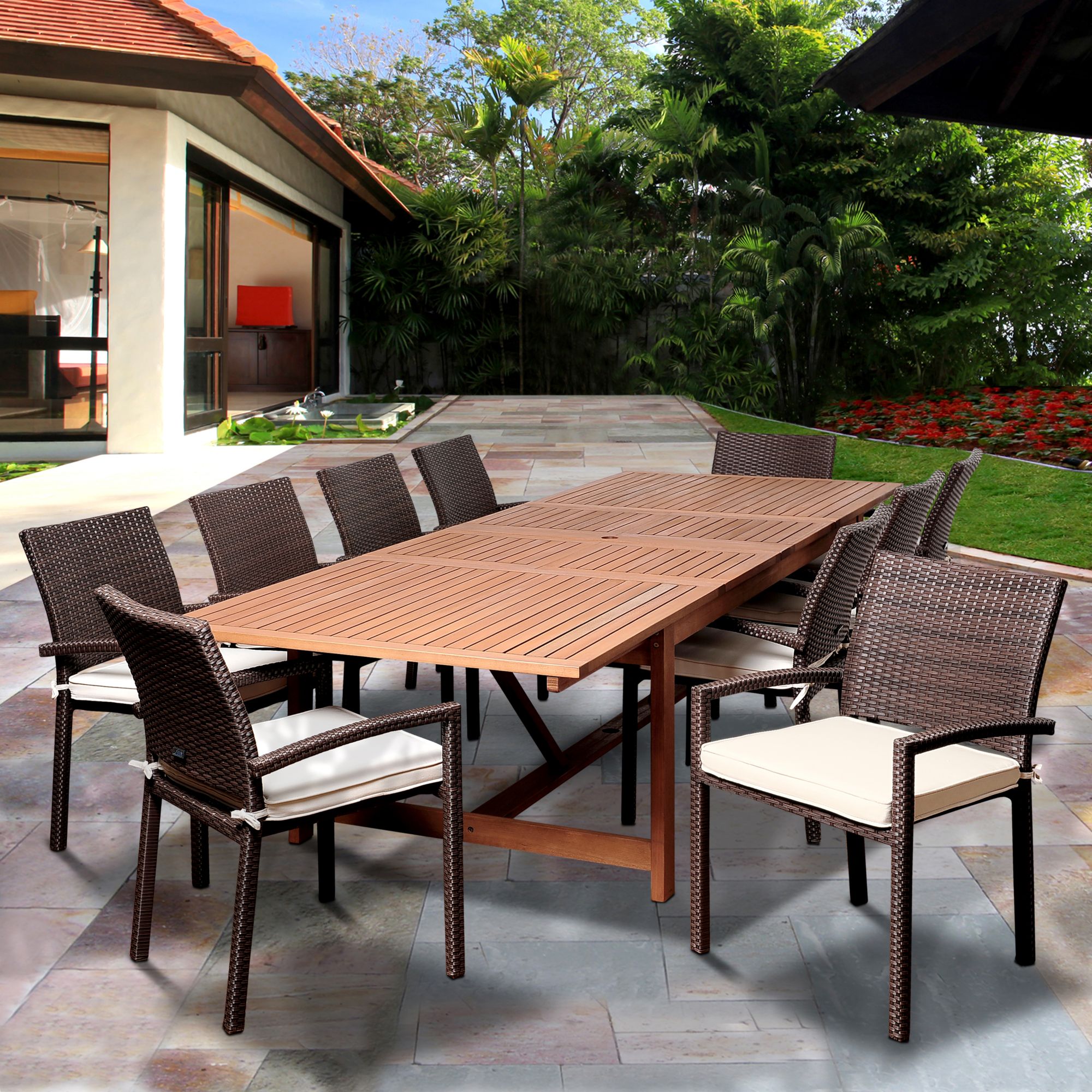 Amazonia Aletta 11-Pc. Eucalyptus and Synthetic Wicker Extendable Patio Dining Set - Natural/Off-White