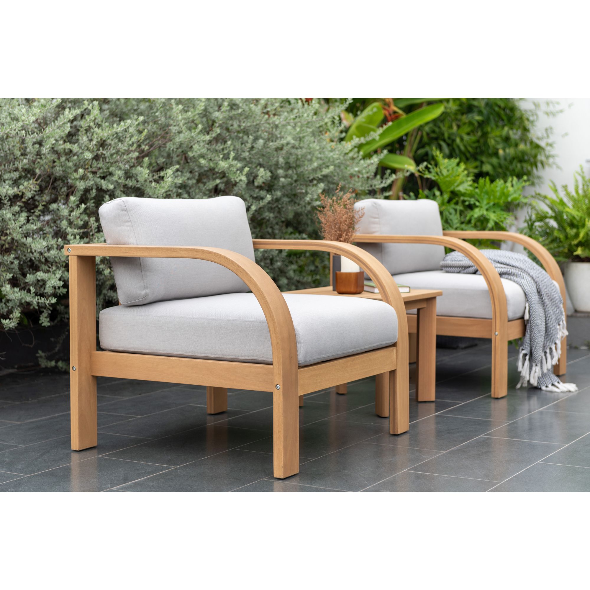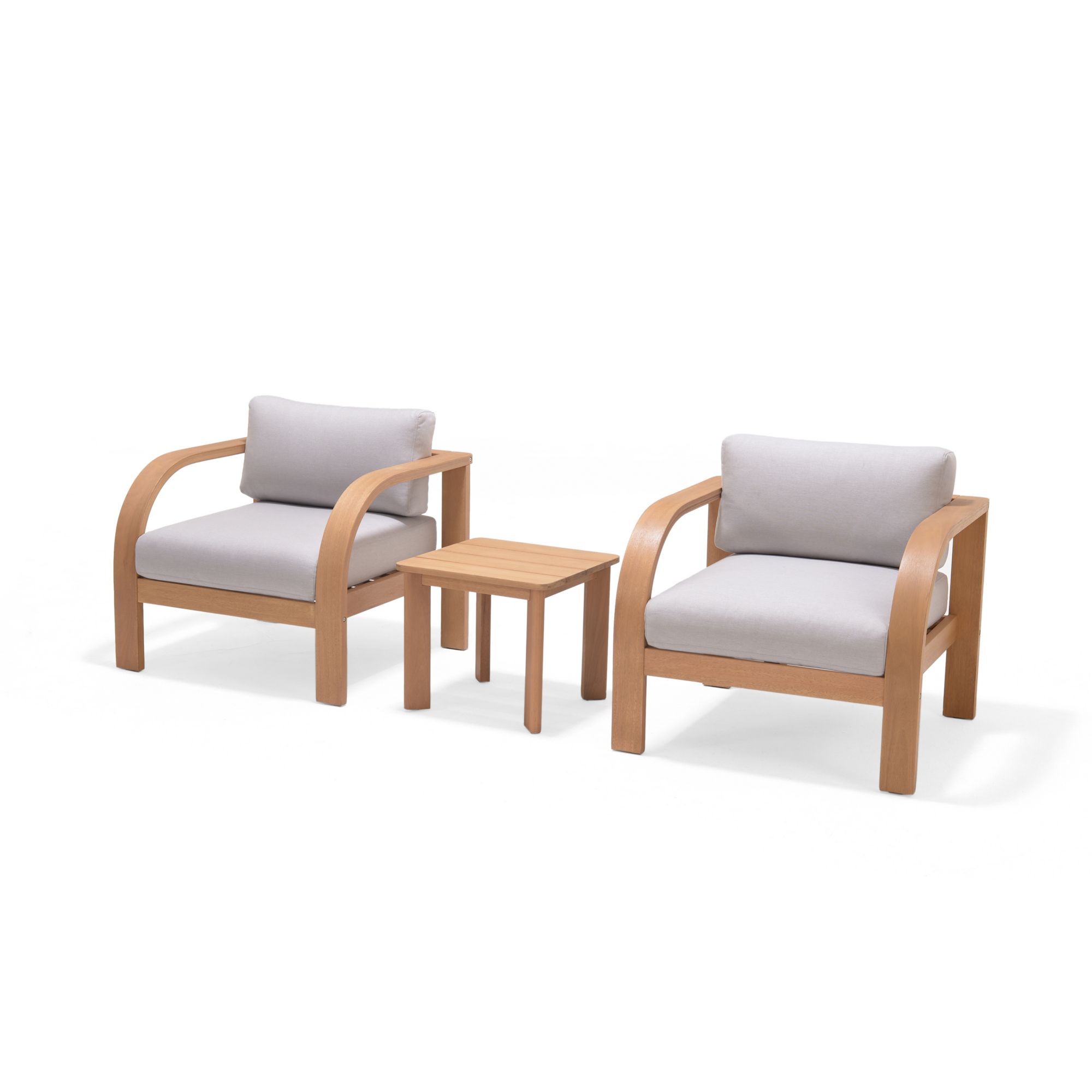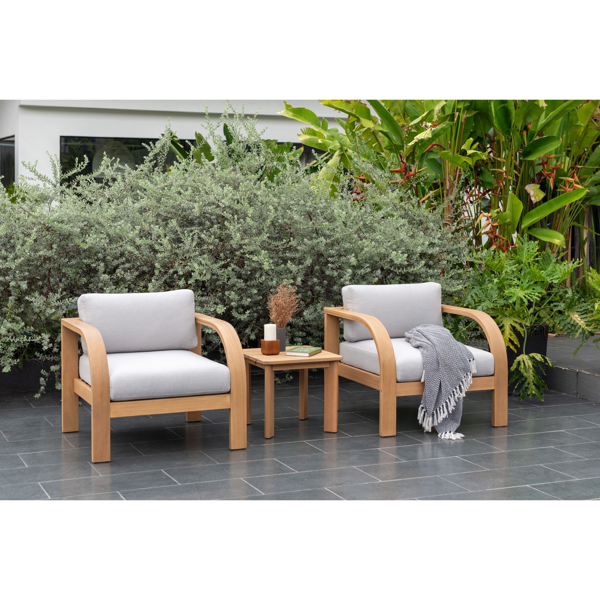 Enhance your outdoor relaxation with the Amazonia Brooke 3-Pc. Conversation Set. This stylish set includes two comfortable chairs and a sleek side table, all crafted from wood to ensure both durability and a chic aesthetic . Perfect for intimate gatherings or enjoying a peaceful moment outdoors, the Brooke collection brings a touch of sophistication to any backyard.