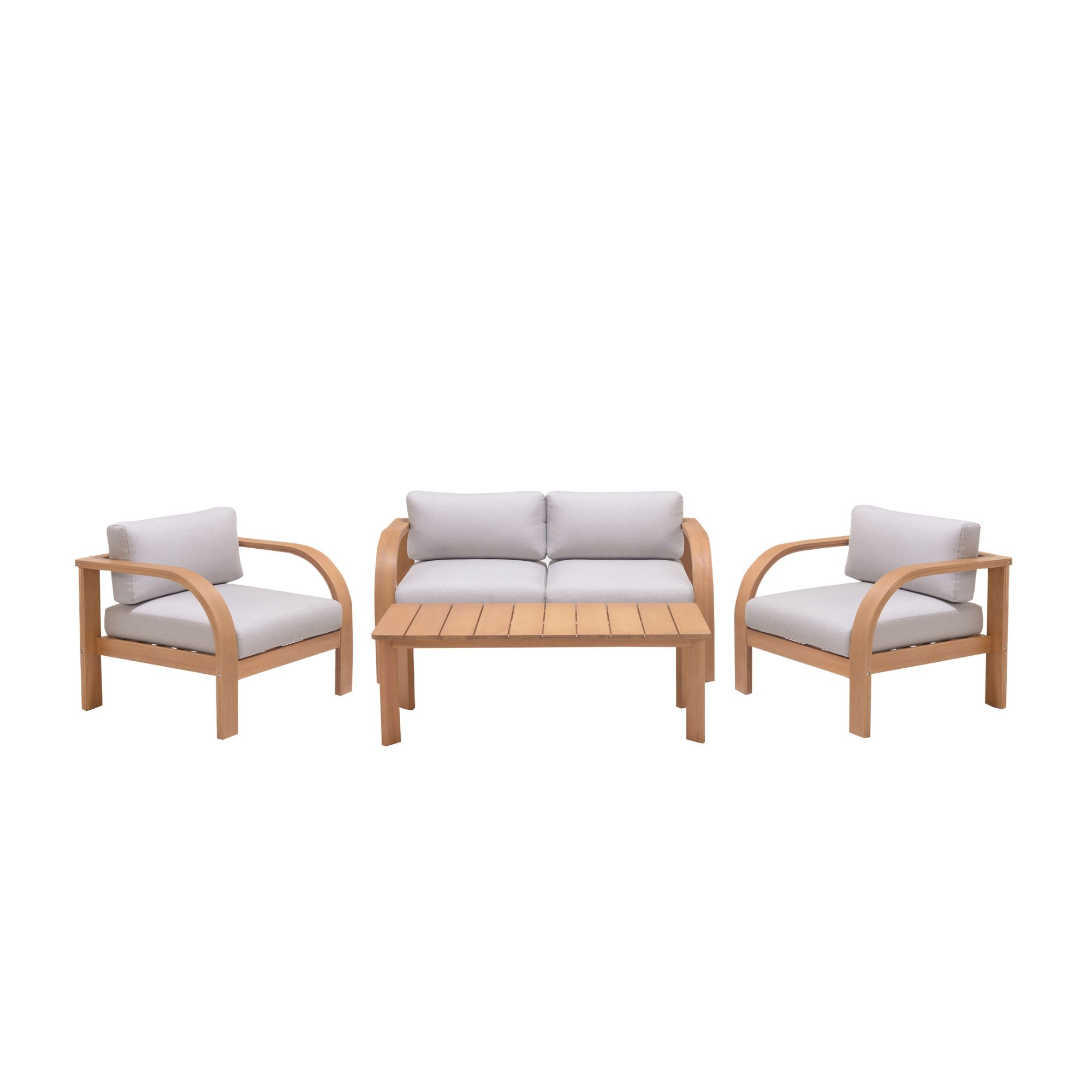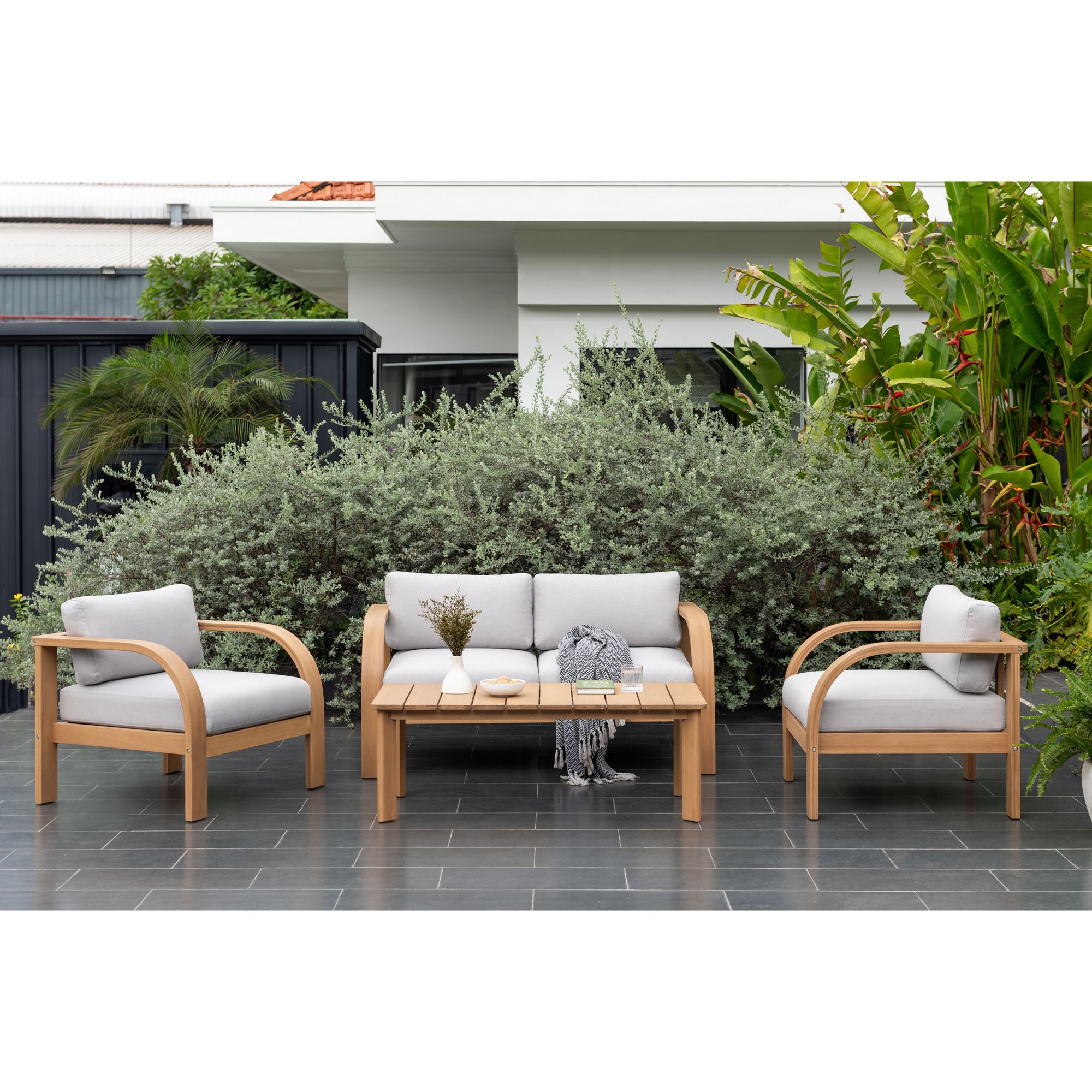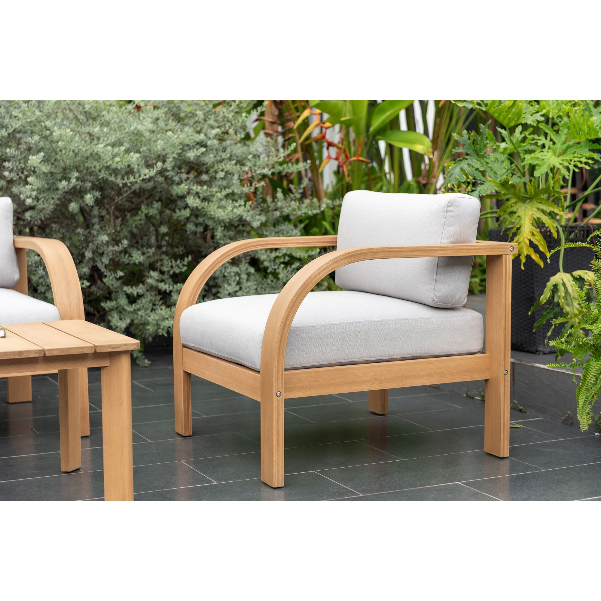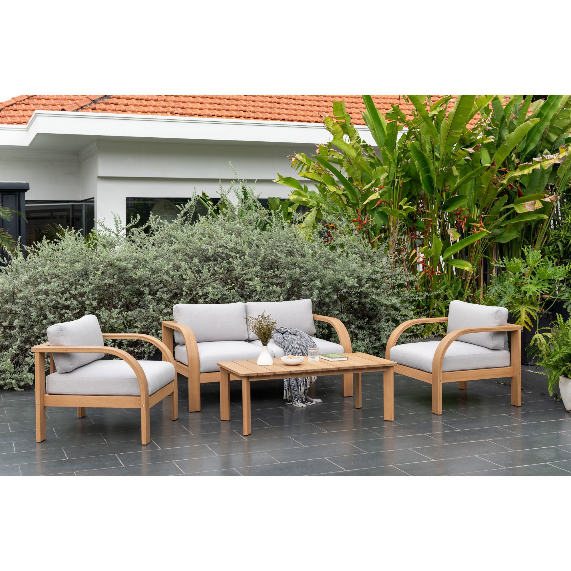 Redefine your outdoor comfort with the Amazonia Brooke 4-Pc. Deep Seating Set. This set includes a cozy loveseat, two stylish chairs, and a sleek coffee table, all crafted from wood for durability and a contemporary look. Perfect for relaxing with family or entertaining guests, the Brooke collection brings a touch of sophistication to any backyard.