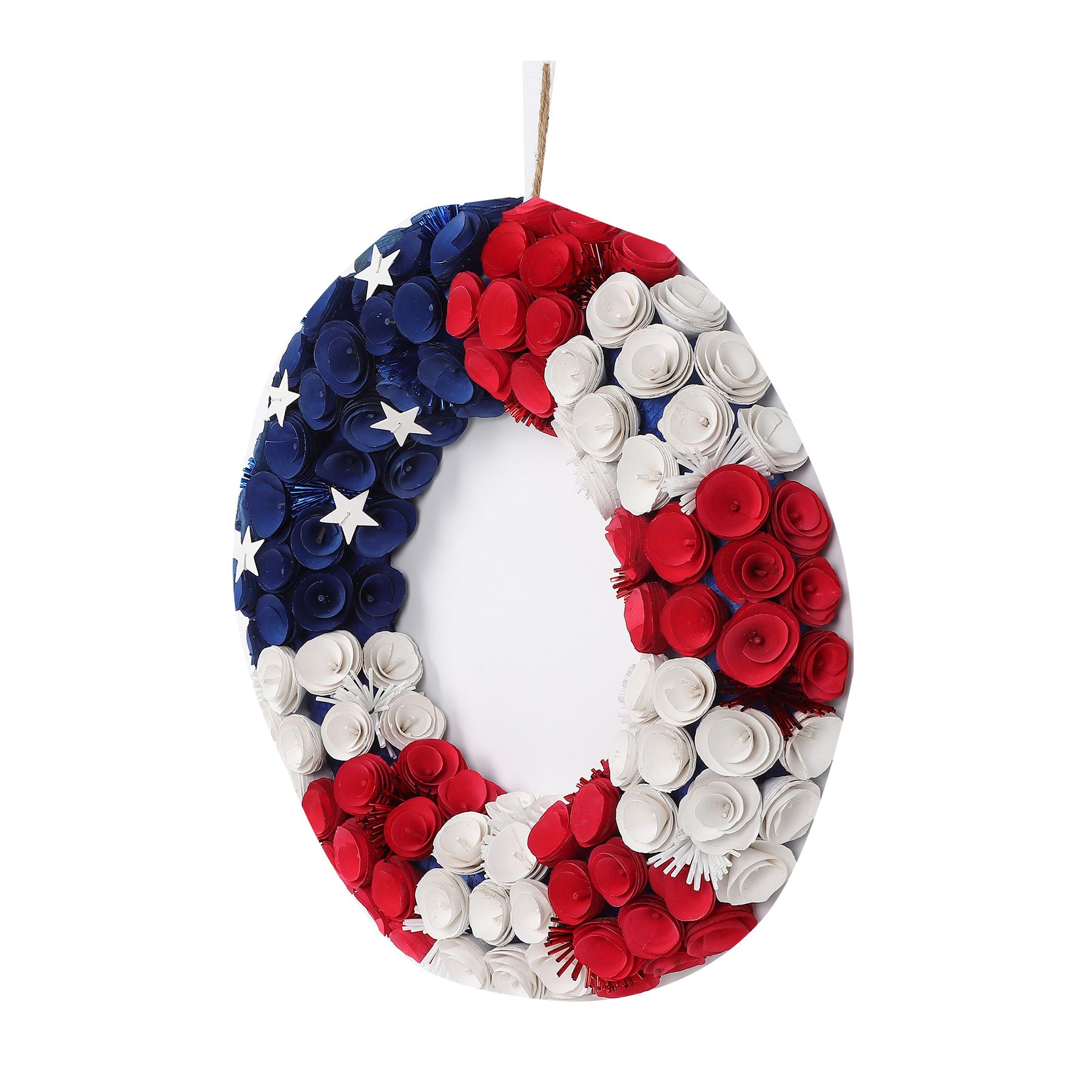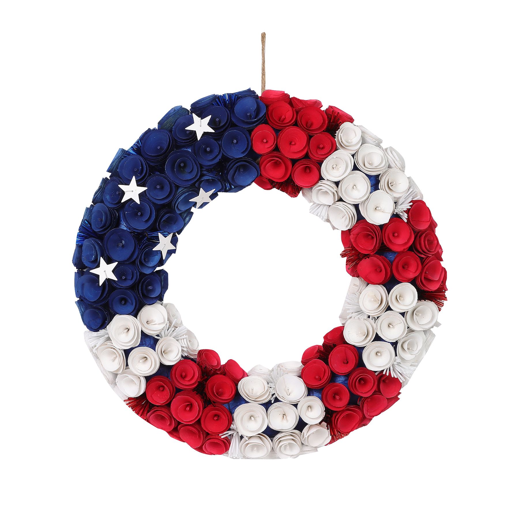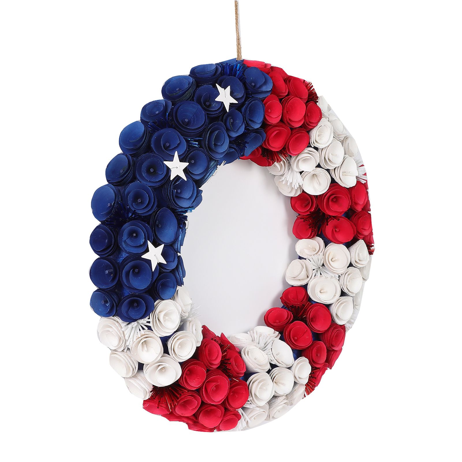 This beautiful wreath is made of woodchip flowers in a red, blue or white hue. It comes adorned with star-shaped and firework accents