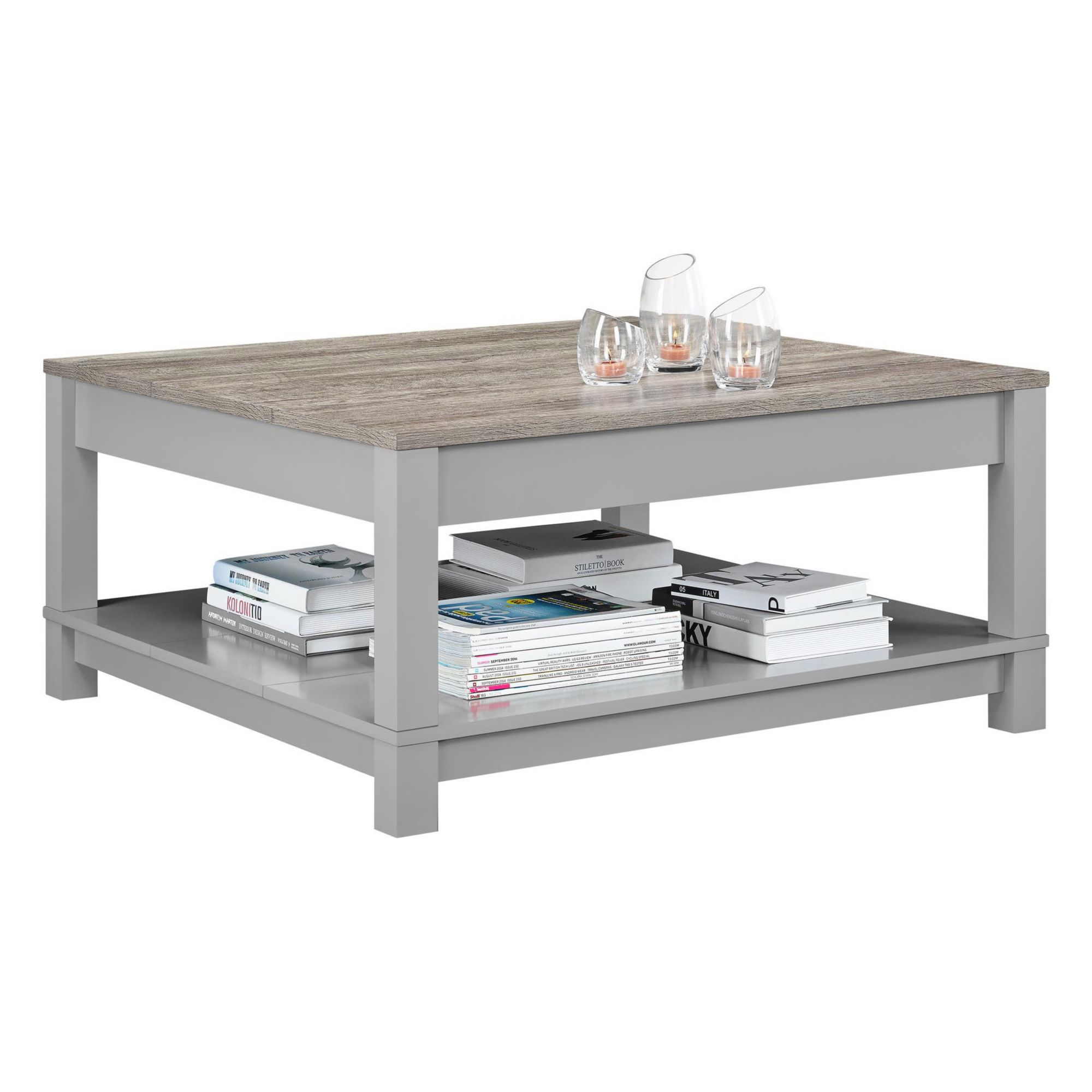 Add a touch of sophistication to your living room with the Ameriwood Home Carver Coffee Table. The soft gray finish will blend effortlessly into any decor style, and the distressed brown woodgrain top gives the table a rustic charm. The coffee table features a bottom storage shelf ideal for holding books and magazines so the top surface can stay open and free of clutter. The table is made of painted MDF and laminated particleboard. It stands at 35.4"D x 35.4"W x 17"H and is recommended to be assembled by 2 adults.