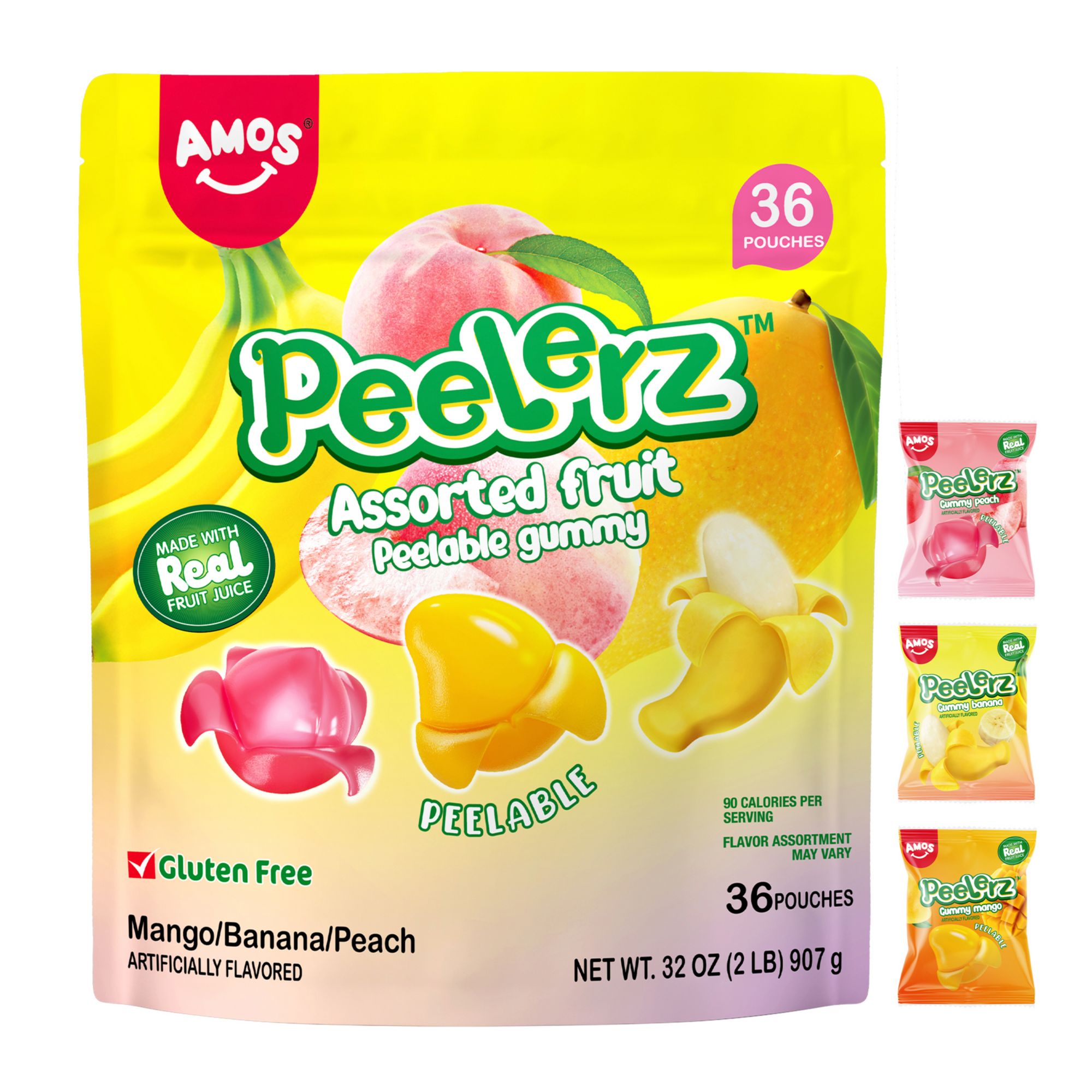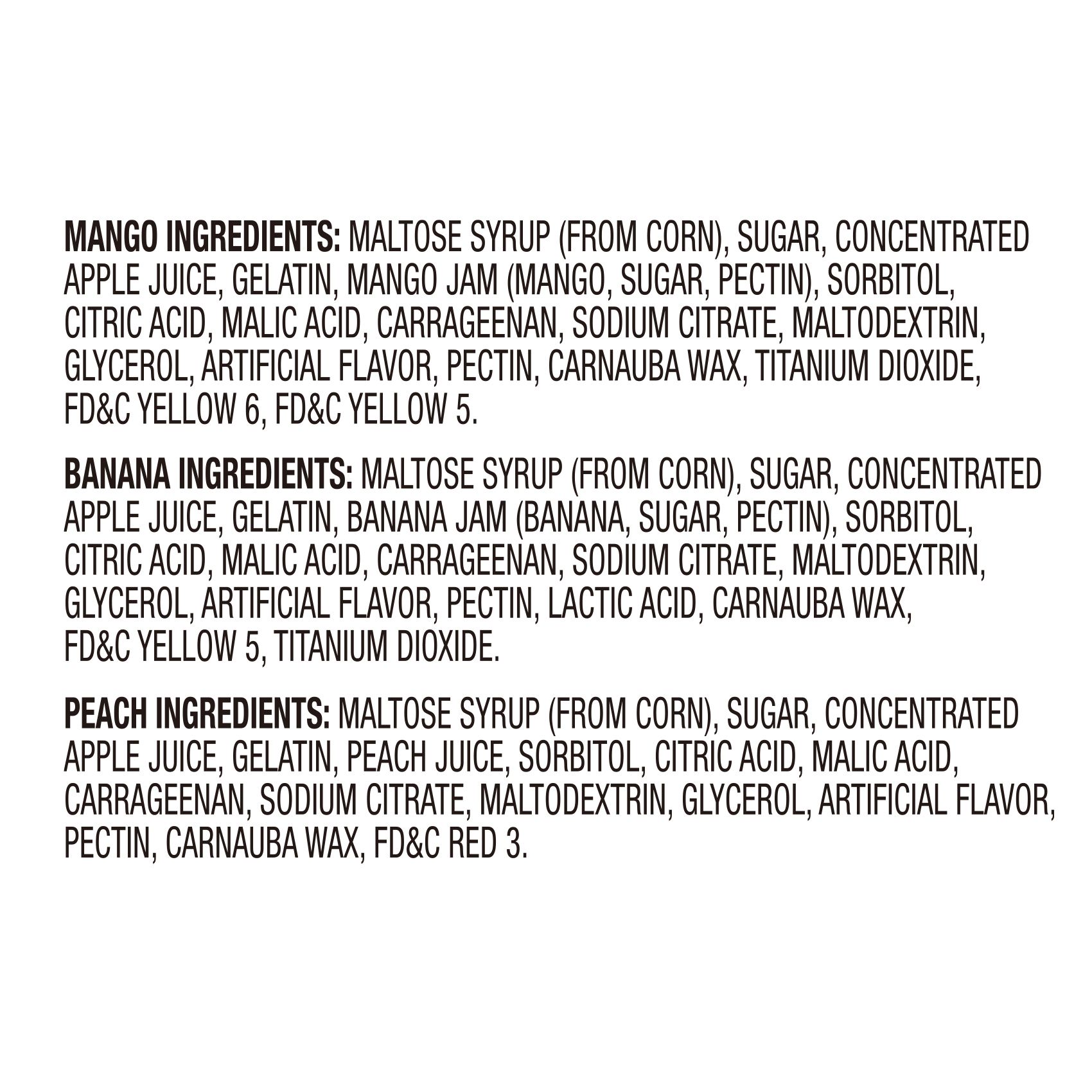 Ingredients: Mango Ingredients: Malt Syrup, Sugar, Concentrated Apple Juice, Gelatin, Mango Jam (Mango, Sugar, Pectin), Sorbitol, Citric Acid, Malic Acid, Carrageenan, Sodium Citrate, Maltodextrin, Glycerol, Artificial Flavor, Pectin, Carnauba Wax, Titanium Dioxide, Fd&c Yellow 6, Fd&c Yellow 5. Banana Ingredients: Malt Syrup, Sugar, Concentrated Apple Juice, Gelatin, Banana Jam (Banana, Sugar, Pectin), Sorbitol, Citric Acid, Malic Acid, Carrageenan, Sodium Citrate, Malto Dextrin, Glycerol, Artificial Flavor, Pectin, Lactic Acid, Carnauba Wax, Fd&c Yellow 5, Titanium Dioxide. Peach Ingredients: Malt Syrup, Sugar, Concentrated Apple Juice, Gelatin, Peach Juice, Sorbitol, Citric Acid, Malic Acid, Carrageenan, Sodium Citrate, Maltodextrin, Glycerol, Artificial Flavor, Pectin, Carnauba Wax, Fd&c Red 3.