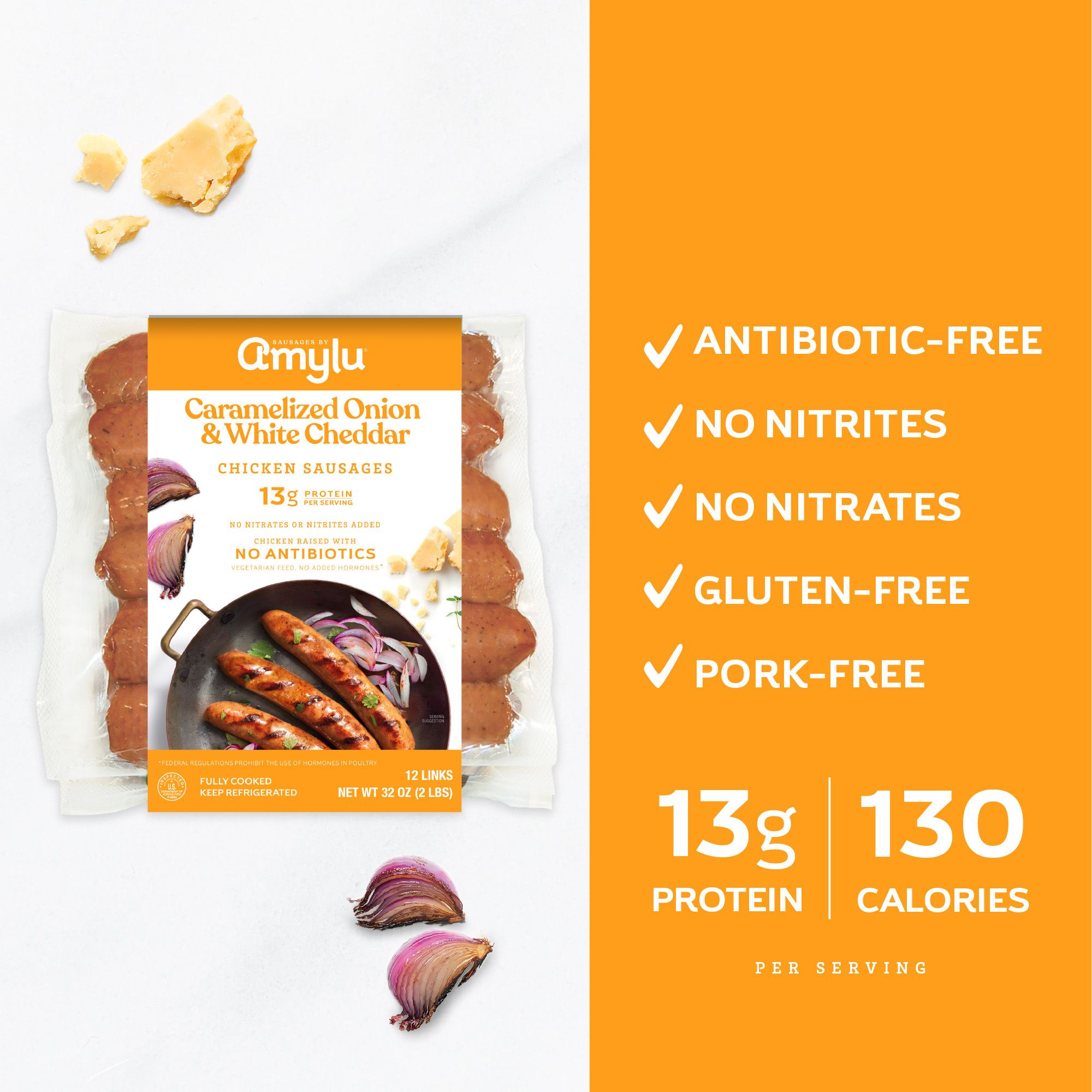 Amylu Foods Caramelized Onion and White Cheddar Chicken Sausages, Links, 12 ct.