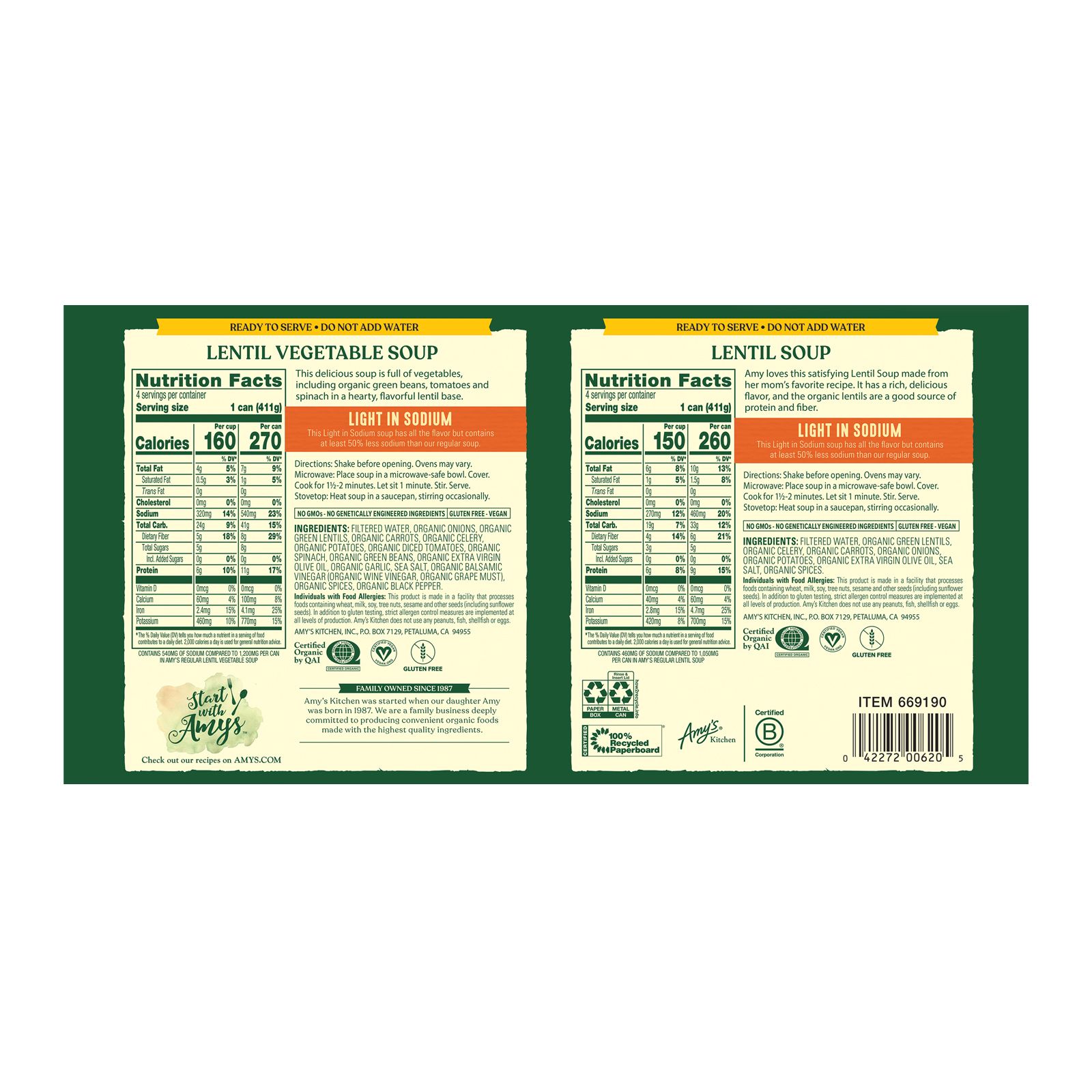 Amy's Organic Light in Sodium Lentil Soup and Organic Light in Sodium Lentil Vegetable Soup are made with 50 percent less sodium than our regular soups without sacrificing the same great taste. Amy's Organic Light in Sodium Lentil Soup is made with organic lentils, carrots, onion and organic spices. Amy's Organic Light in Sodium Lentil Vegetable Soup is made with organic lentils, sweet organic carrots, vine-ripened tomatoes, tender green beans and organic spices. Both are hearty organic soups that everyone will enjoy. Our soups are made with high-quality, organic ingredients so you can feel good about serving it for a delicious dinner or lunch option. They're dairy free and vegan-friendly, making them a great option for those with dietary restrictions or preferences. These low sodium soups are also easy to prepare: simply heat it up on the stove or in the microwave and serve. They're perfect for busy weeknights or lazy weekends when you want to enjoy a warm and comforting meal without spending hours in the kitchen. With their delicious flavor, Amy's Organic Light in Sodium Lentil Soup and Organic Light in Sodium Lentil Vegetable Soup will surely become kitchen favorites. Since 1987, Amy's has produced delicious, convenient organic food and frozen meals for people who are sometimes too busy to cook.