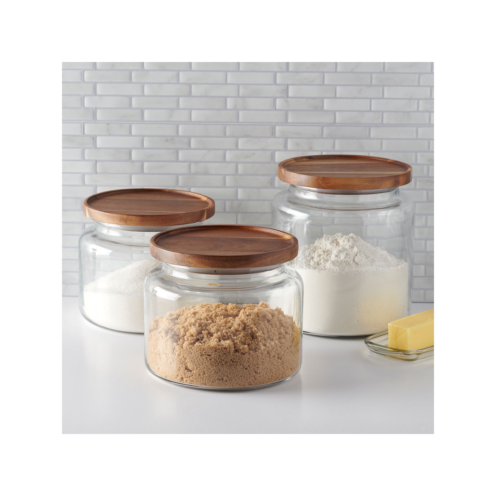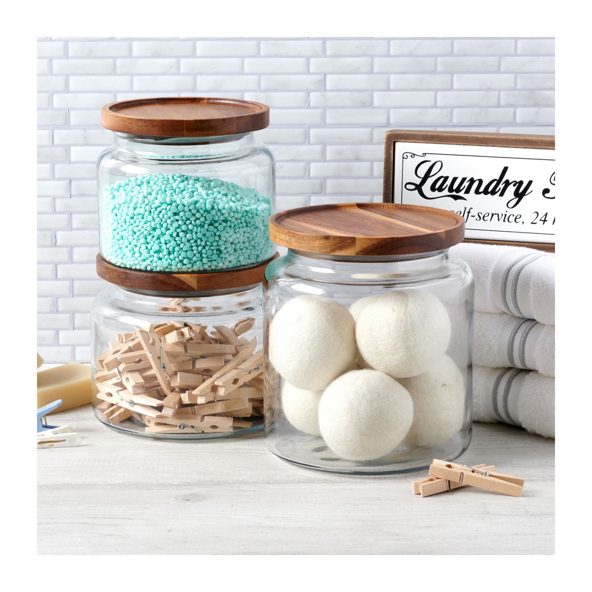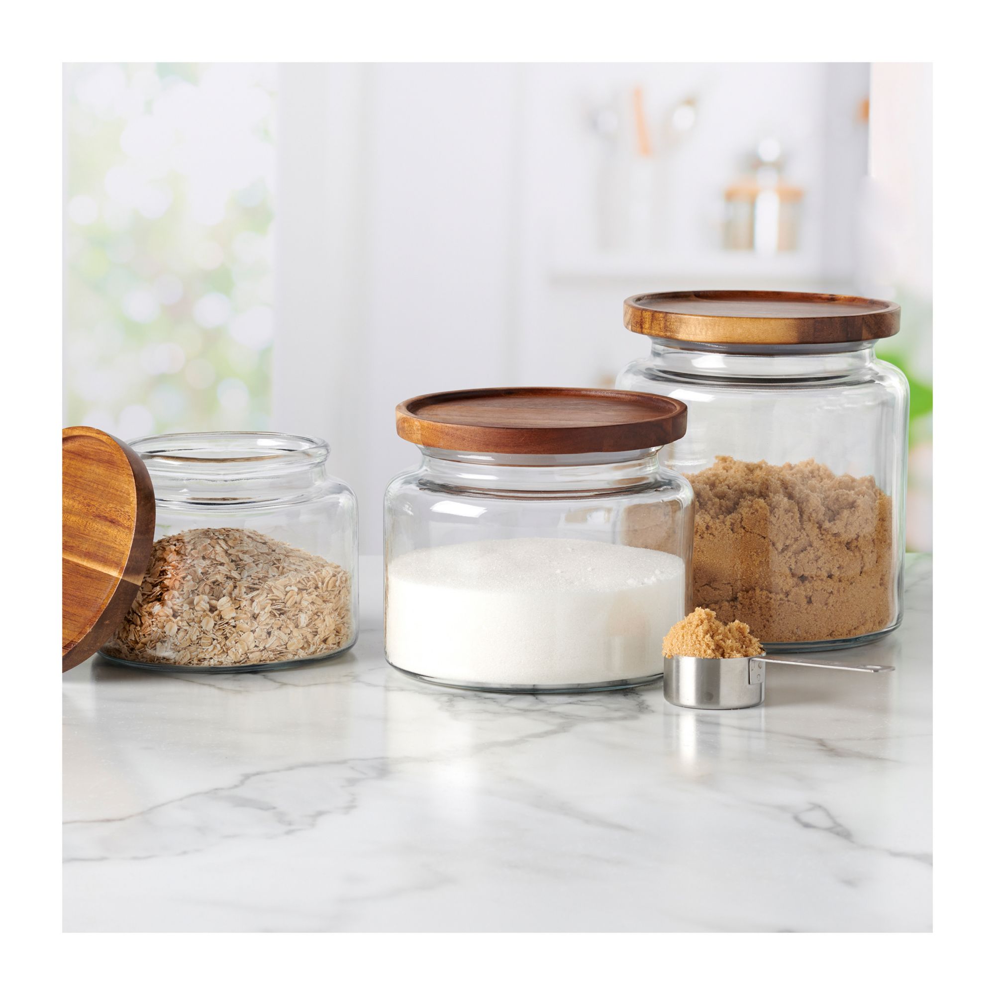 These beautiful glass jars with acacia wood lids add a natural warmth to whatever room you put them in. The classic glass jars combine the best of both storage and display, and can be used from your kitchen counter to your laundry room. Fixed silicone seal keeps contents fresh.