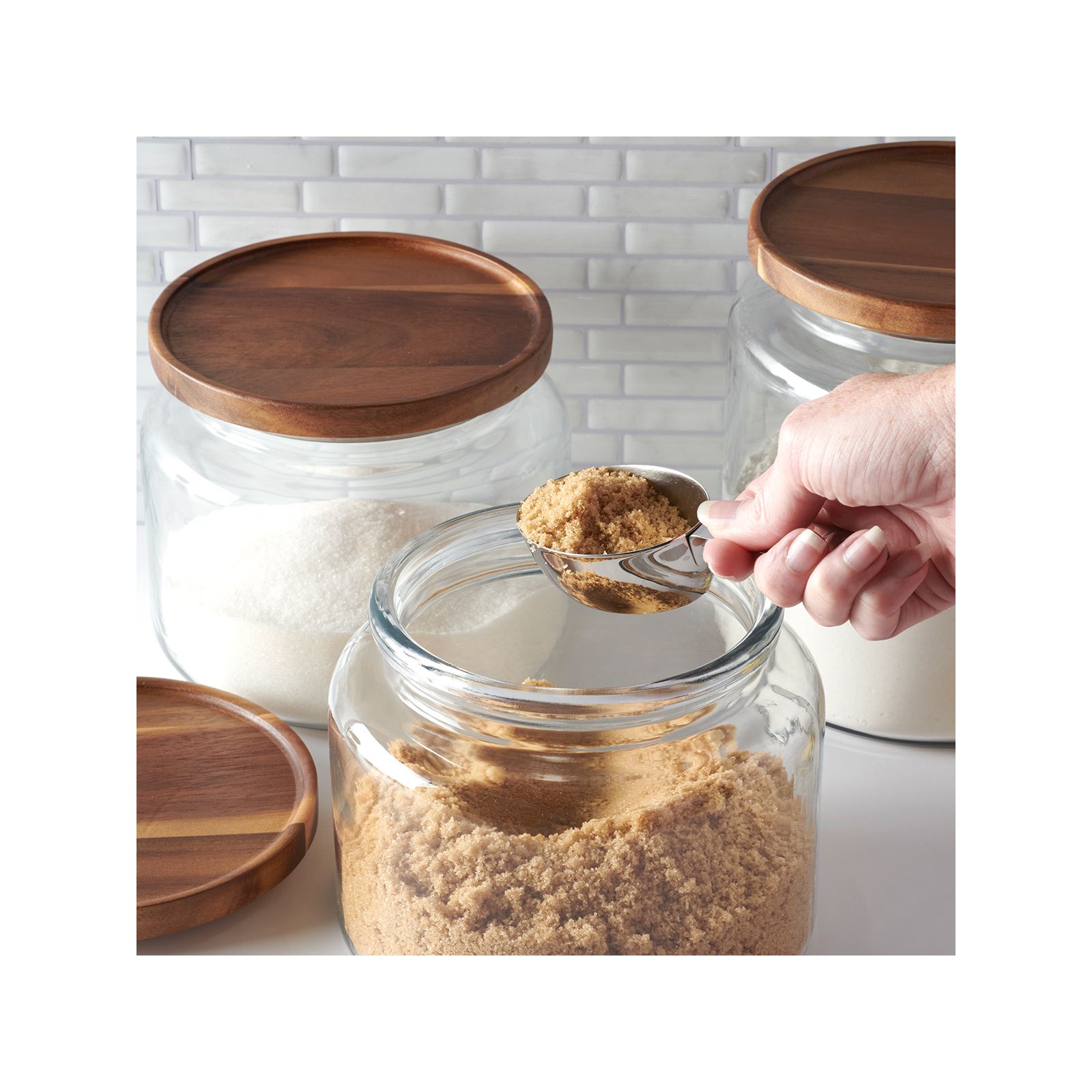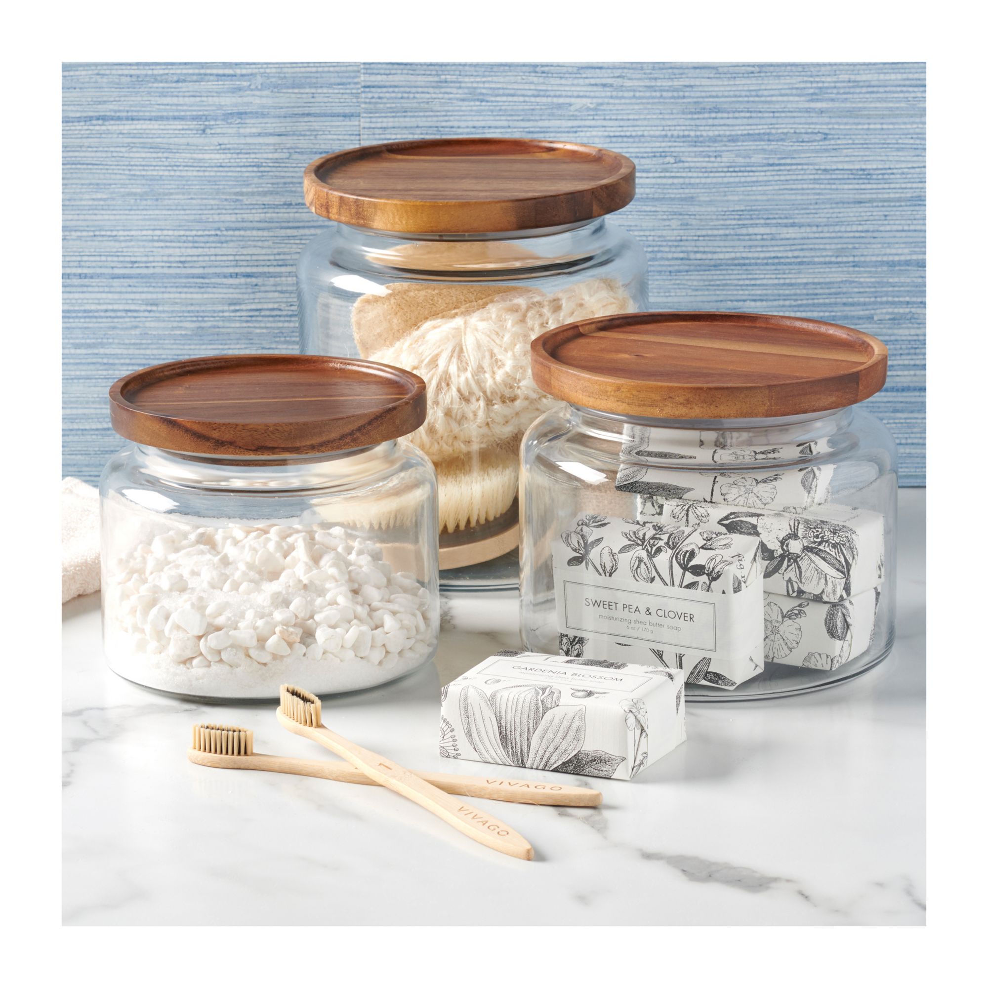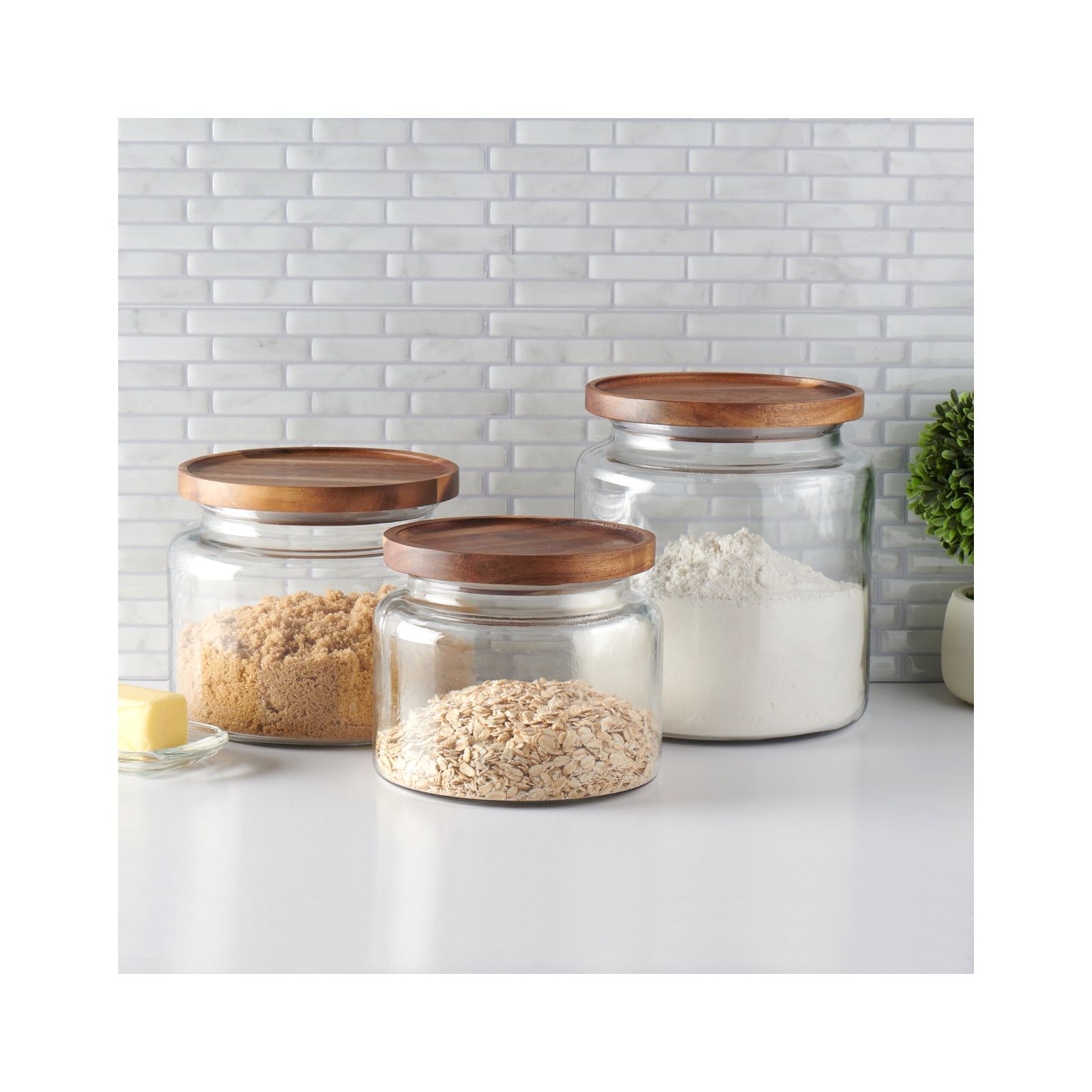 These beautiful glass jars with acacia wood lids add a natural warmth to whatever room you put them in. The classic glass jars combine the best of both storage and display, and can be used from your kitchen counter to your laundry room. Fixed silicone seal keeps contents fresh.