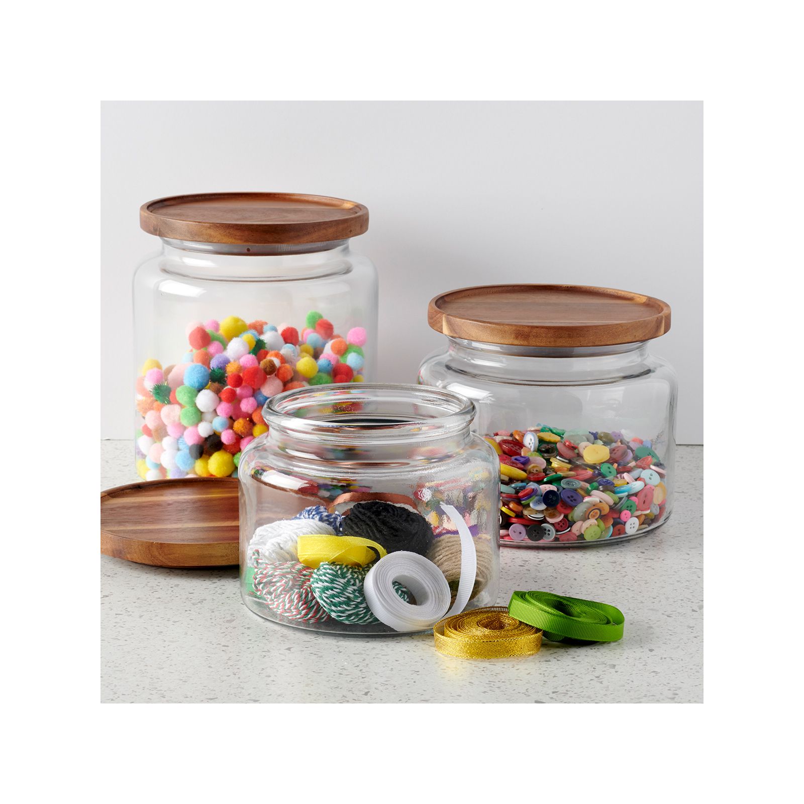 Glass jars are dishwasher safe Acacia lids are hand washable Glass jars are made in USA; lids are made in China Great for laundry Room, kitchen, pantry, craft room storage and bathroom Includes 3 glass canister jars with acacia lids: one 48 oz., one 64 oz. and one 96 oz.
