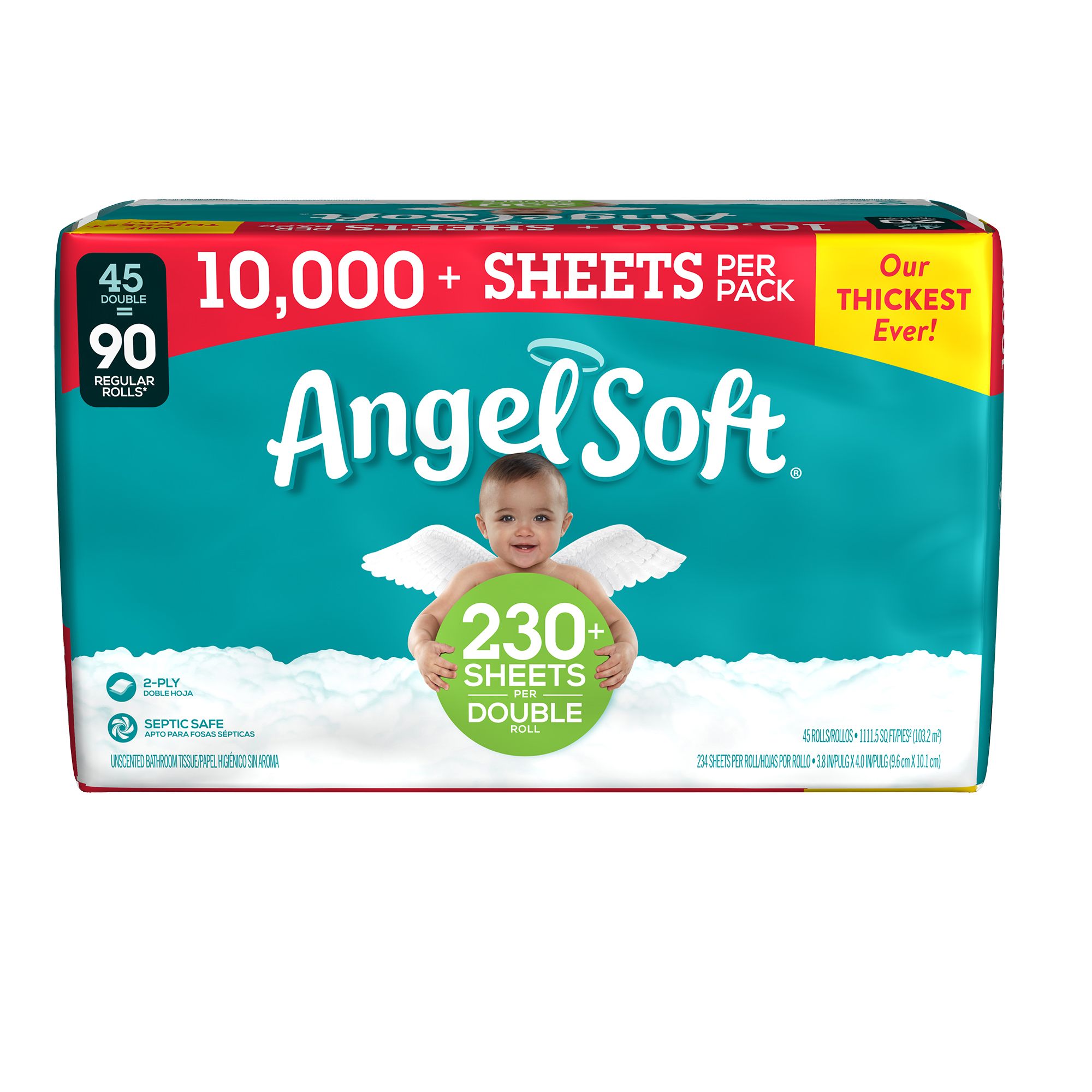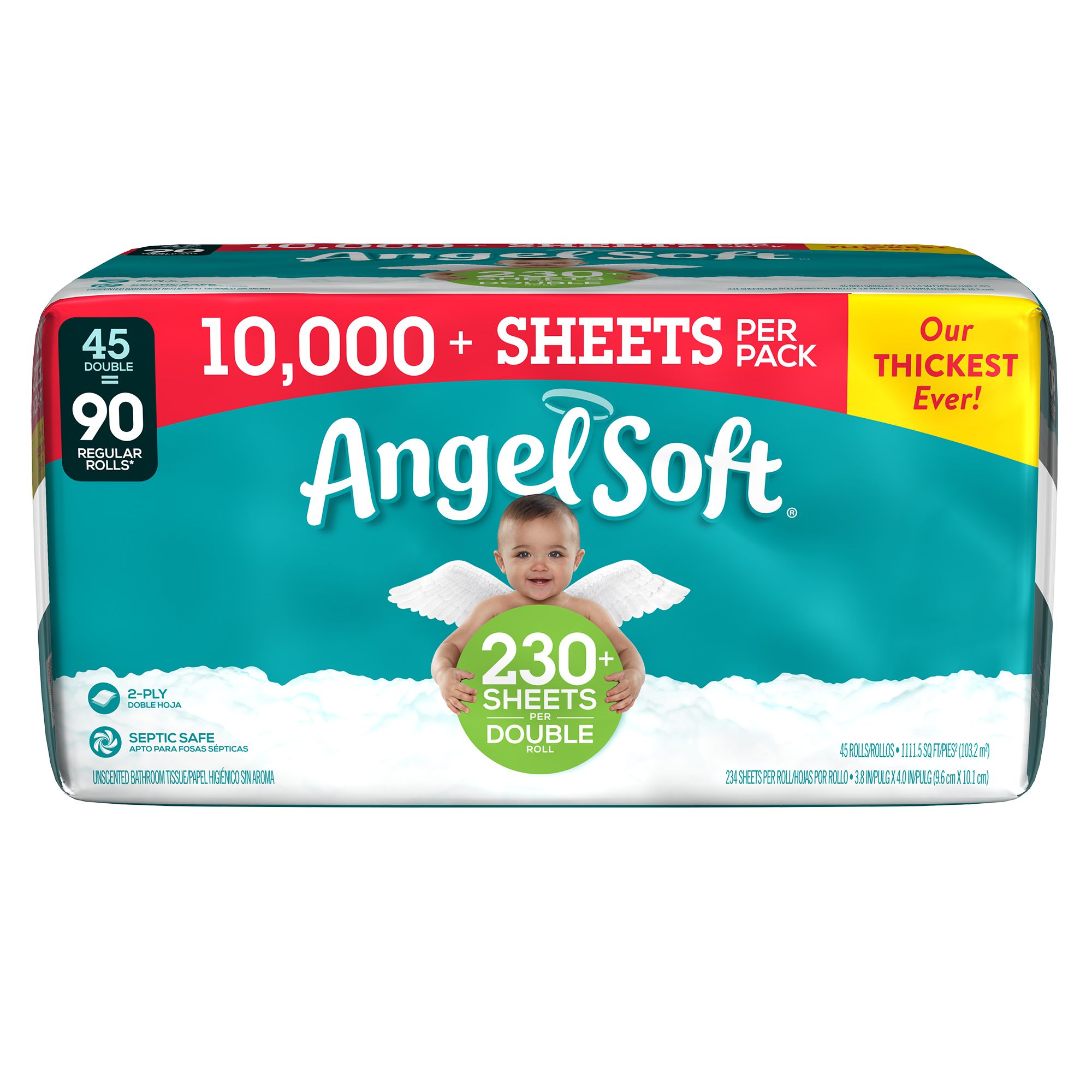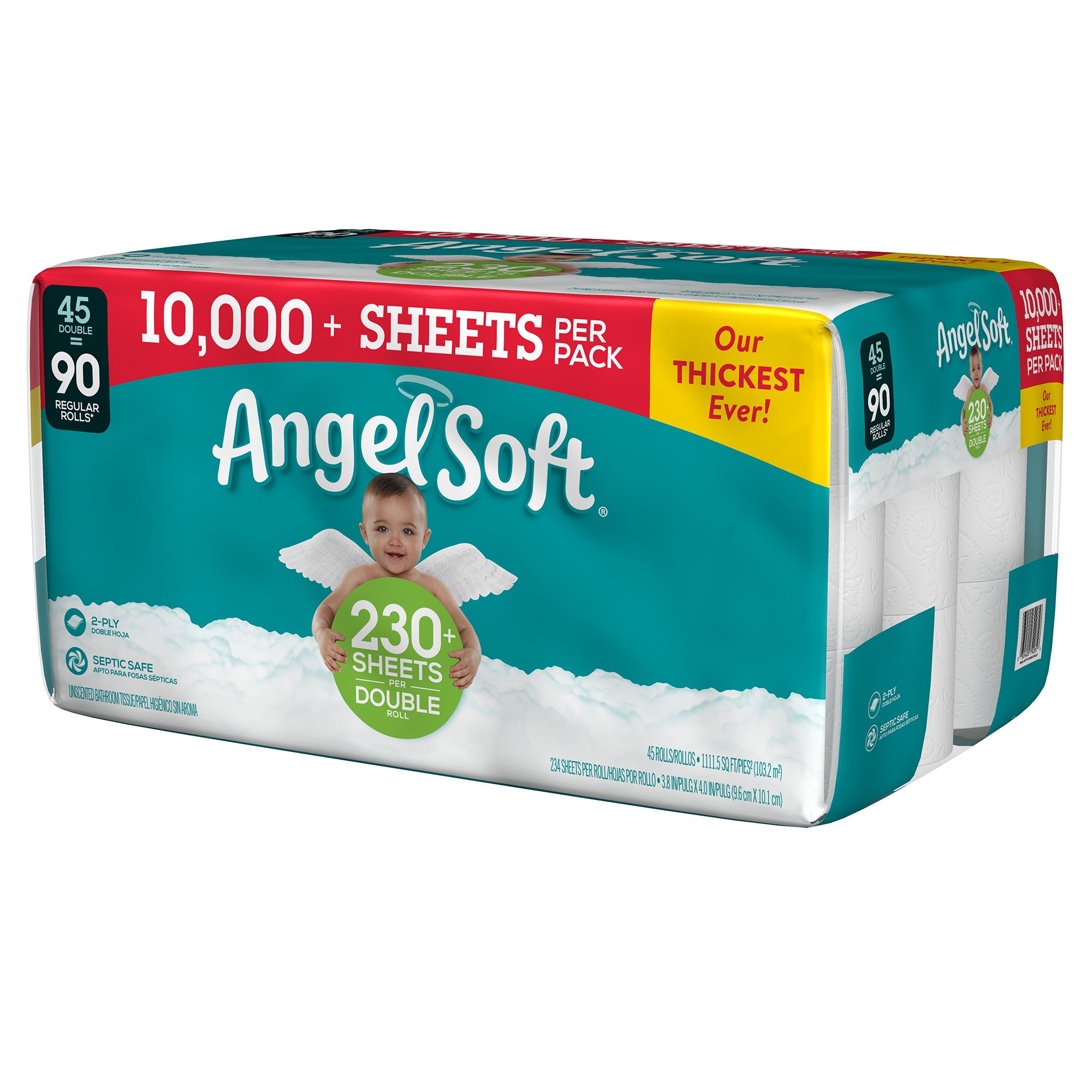 45 rolls mean over 10,000 sheets per pack 234 sheets 2-ply per roll Septic and sewer safe unscented bath tissue An ideal balance of softness and strength 45 double rolls = 90 regular rolls Angel Soft toilet paper is designed with softness and strength at a price that won't break the bank Roll for roll, Angel Soft gives you the quality you expect at a value you'll love Fits standard bathroom toilet paper holders Sustainable Forestry Initiative (SFI) certified Angel Soft Double rolls are made with sustainably-sourced trees Angel Soft toilet paper packaging is recyclable This plastic wrapper has a resin identification number of 4 Please check with your local recycling facility to determine if these materials are recycled in your area Includes 234-sheet two-ply toilet papers