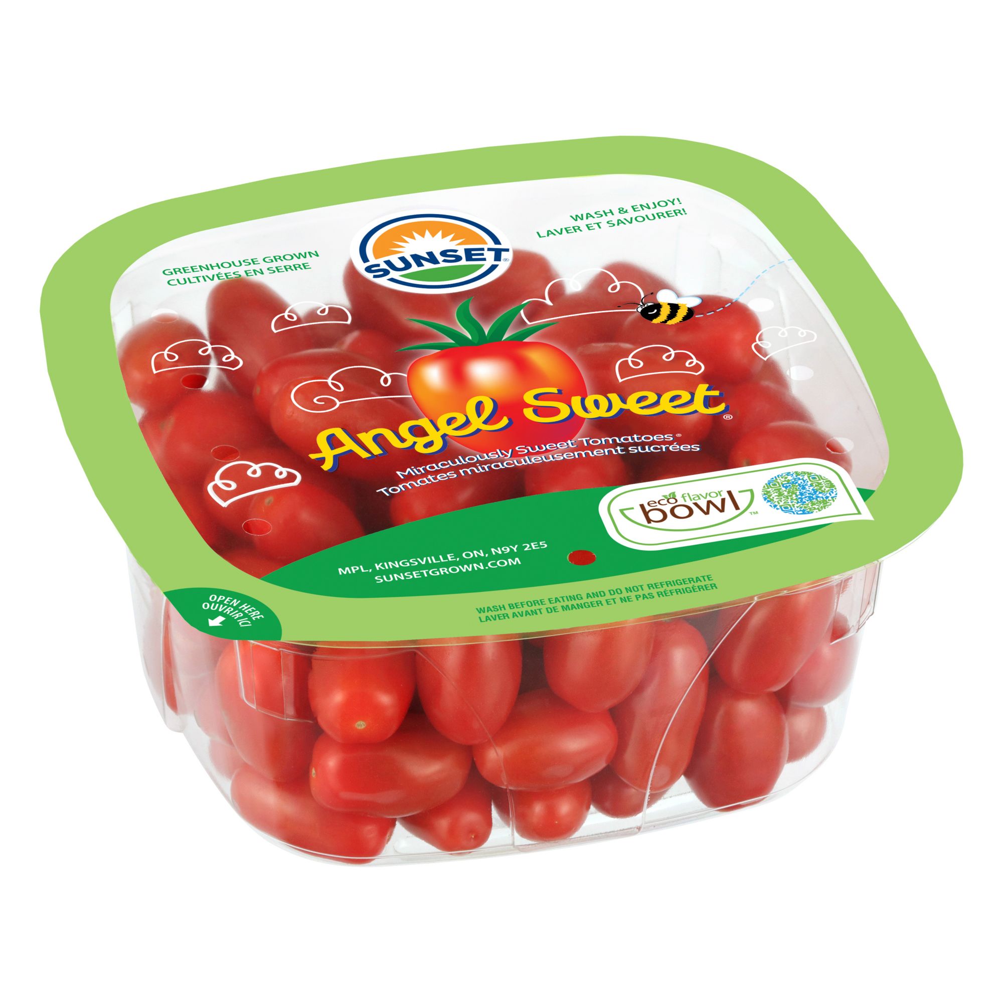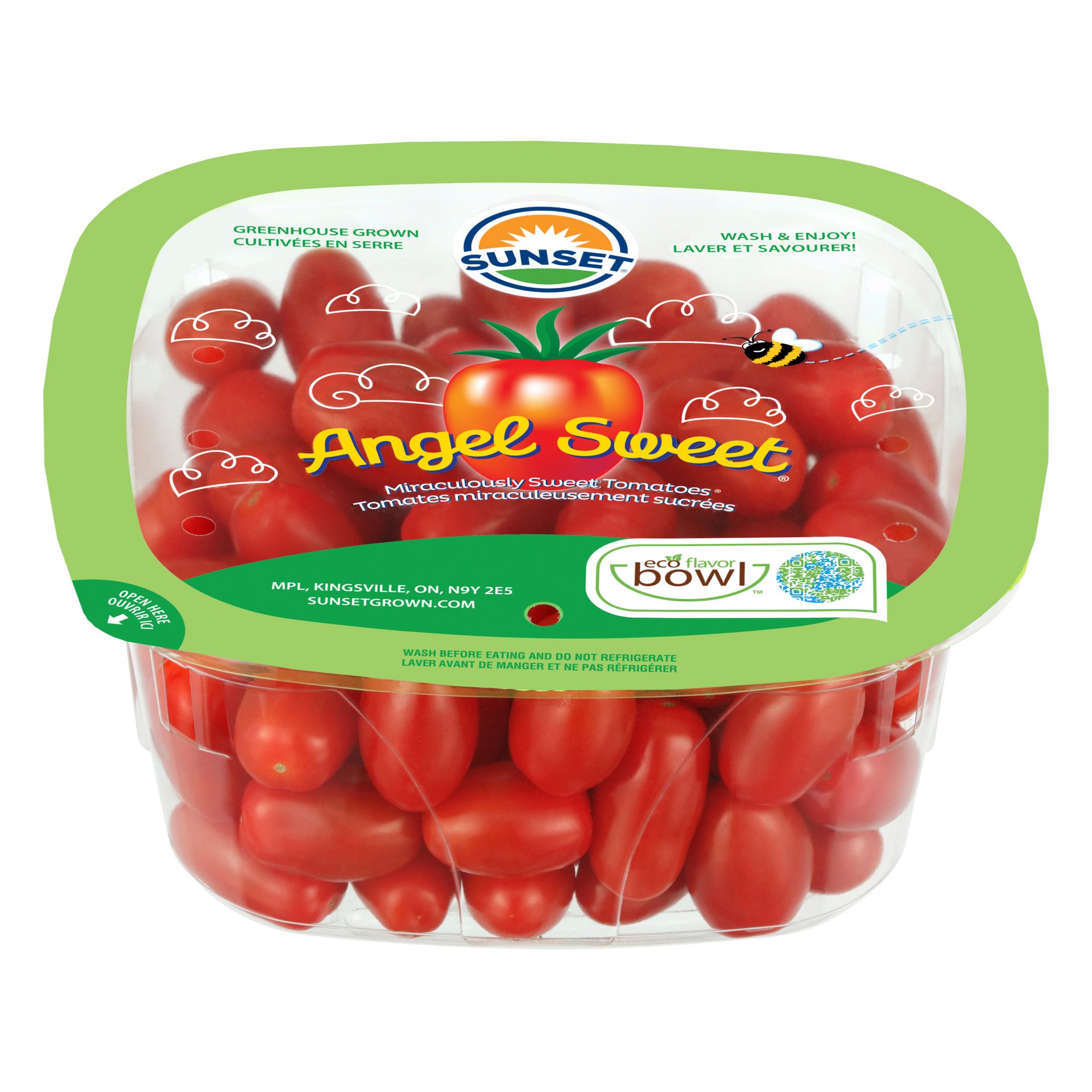Angel Sweet Tomatoes by Sunset are the miraculously sweet tomatoes. Sunset calls these little tomatoes Angel Sweet, because they are born from the world’s sweetest grape tomatoes and ripened on the vine in their pristine greenhouses.