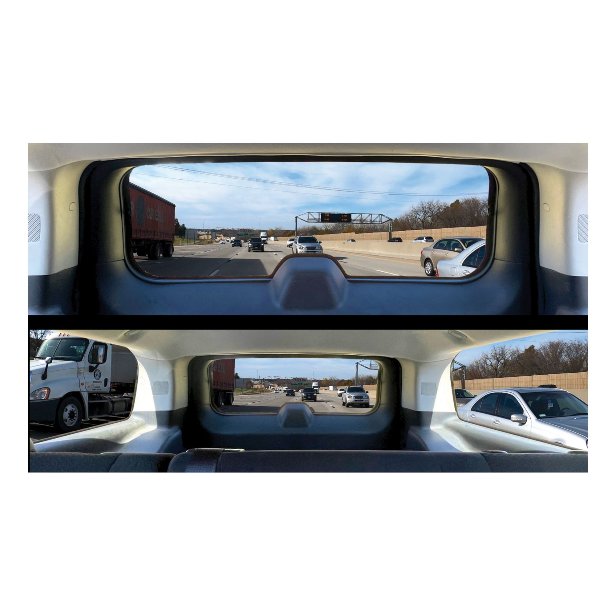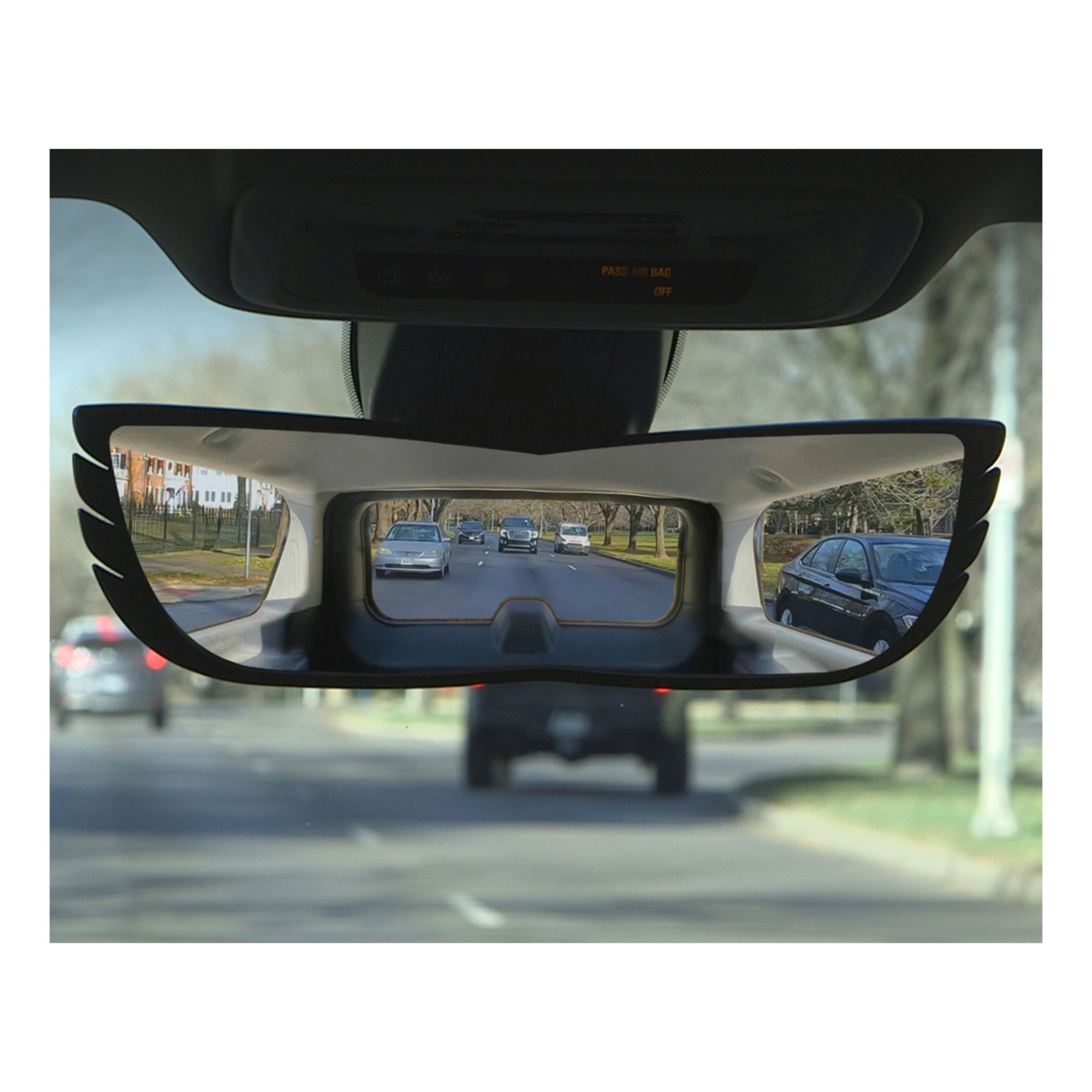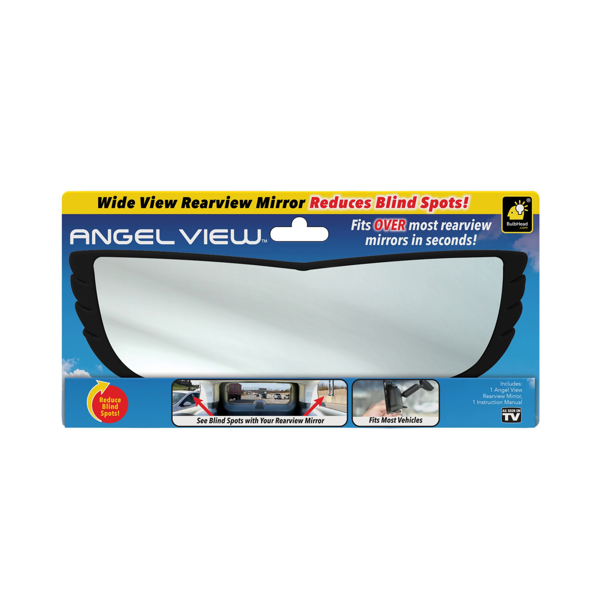 The Angel View Rearview Mirror is a 160° wide angle, convex shape that eliminates blind spots. The 12" length allows you to see more. Great for new drivers, old drivers, and everyone in between. Rubber spring loaded feet adjust and hold tight. Easily fits over your existing rearview mirror.