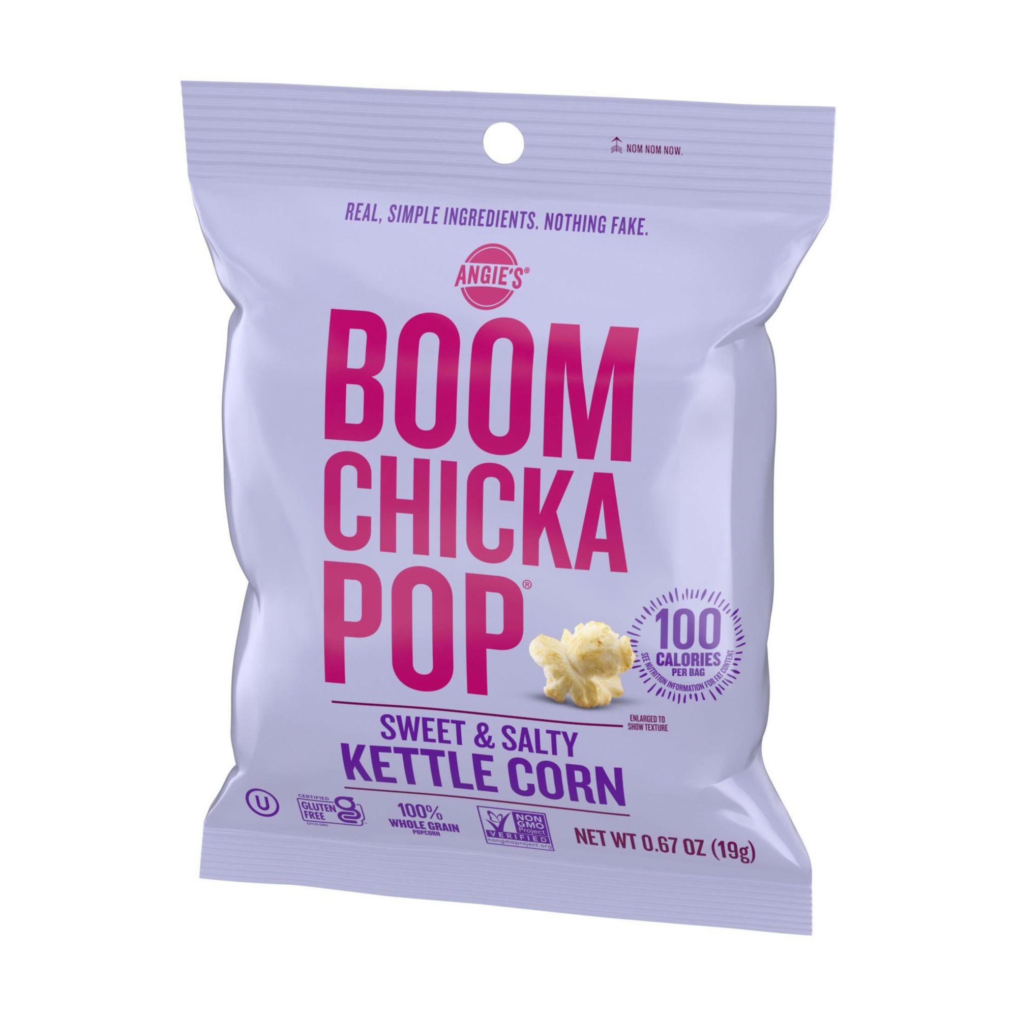 Stock up on deliciousness with Angie's BOOMCHICKAPOP Sweet & Salty Kettle Corn Popcorn 28 Bag Single Serve Pack. These convenient sweet and salty snacks are made with real, simple ingredients and nothing fake. Each individual bag of this whole-grain, vegan popcorn is a flavorful, gluten-free snack with 100 calories per bag. This multi-pack is also Non-GMO Project Verified and includes 28 servings of popcorn snacks per container. Enjoy delicious pre-popped popcorn for a sweet and salty snack that's ready to eat right out of the bag. This ready-to-eat bagged popcorn is perfect for families, lunch boxes, road trip snacks and more. Angie's BOOMCHICKAPOP Popcorn: Simply, Deliciously Boom.