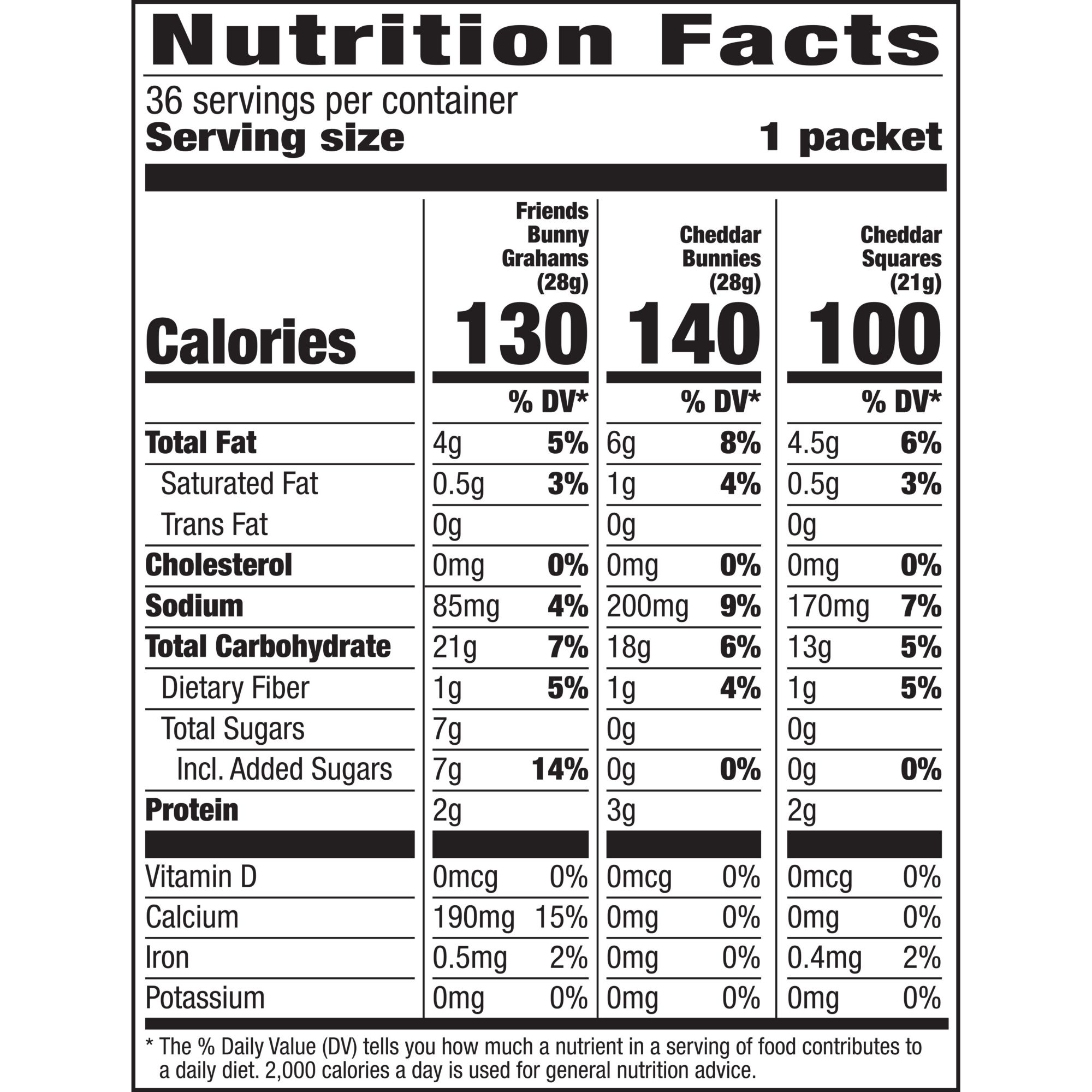 A Delightful mix of Cheddar Bunnies, Cheddar Squares and Friend Bunny Grahams. 36 individually wrapped pouches make this perfect for lunches and on-the-go snakcing.