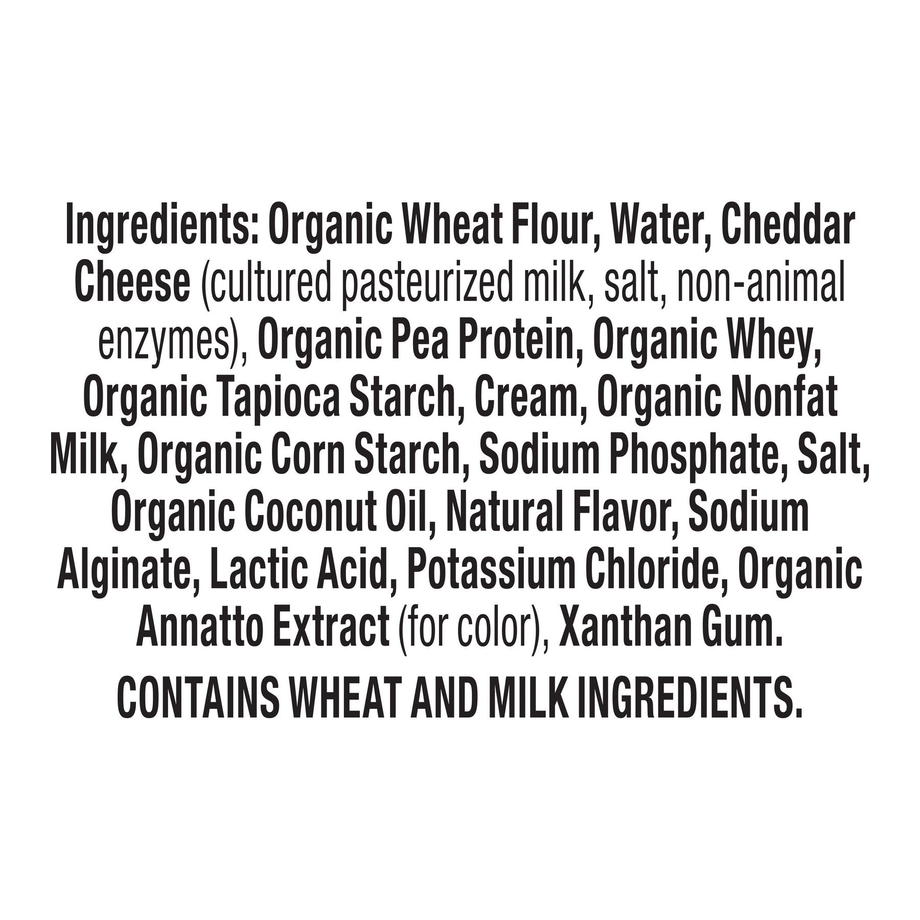 Ingredients: Organic Wheat Flour, Water, Cheddar Cheese (Cultured Pasteurized Milk, Salt, Non-animal Enzymes), Organic Pea Protein, Organic Whey, Organic Tapioca Starch, Cream, Organic Nonfat Milk, Organic Corn Starch, Sodium Phosphate, Salt, Organic Coconu Oil, Natural Flacor, Sodium Alginate, Lactic Acid, Potassium Chloride, Organic Annatto Extract (For Color), Xanthan Gum.