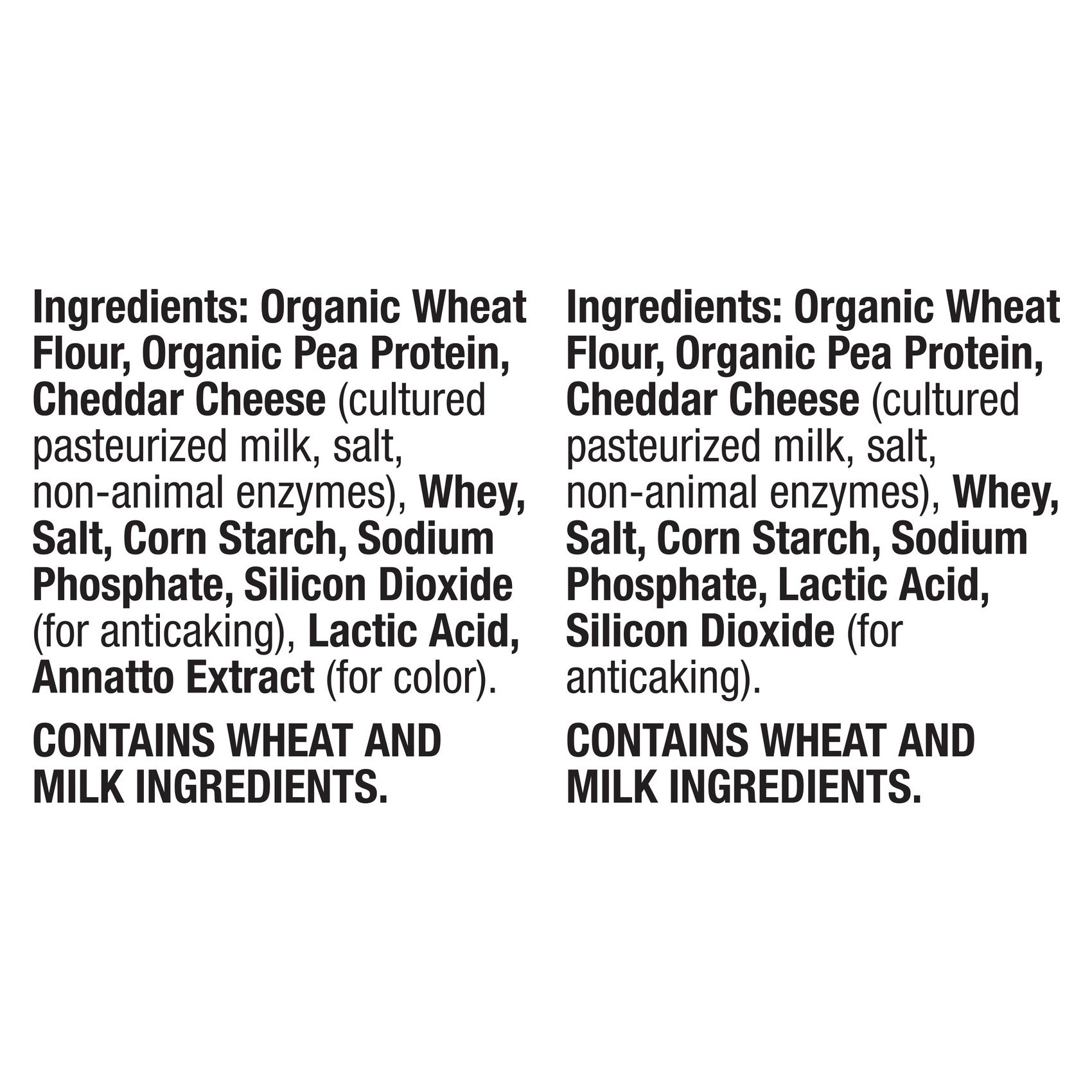 Ingredients: Organic Wheat Flour, Organic Pea Protein, Cheddar Cheese (Cultured Pasteurized Milk, Salt, Non-animal Enzymes), Whey, Salt, Corn Starch, Sodium Phosphate, Silicon Dioxide (For Anticaking), Lactic Acid, Annatto Extract (For Color) Contains Wheat And Milk Ingredients. Organic Wheat Flour, Organic Pea Protein, Cheddar Cheese (Cultured Pasteurized Milk, Salt, Non-animal Enzymes), Whey, Salt, Corn Starch, Sodium Phosphate, Lactic Acid, Silicon Dioxide (For Anticaking). Contains Wheat And Milk Ingredients.