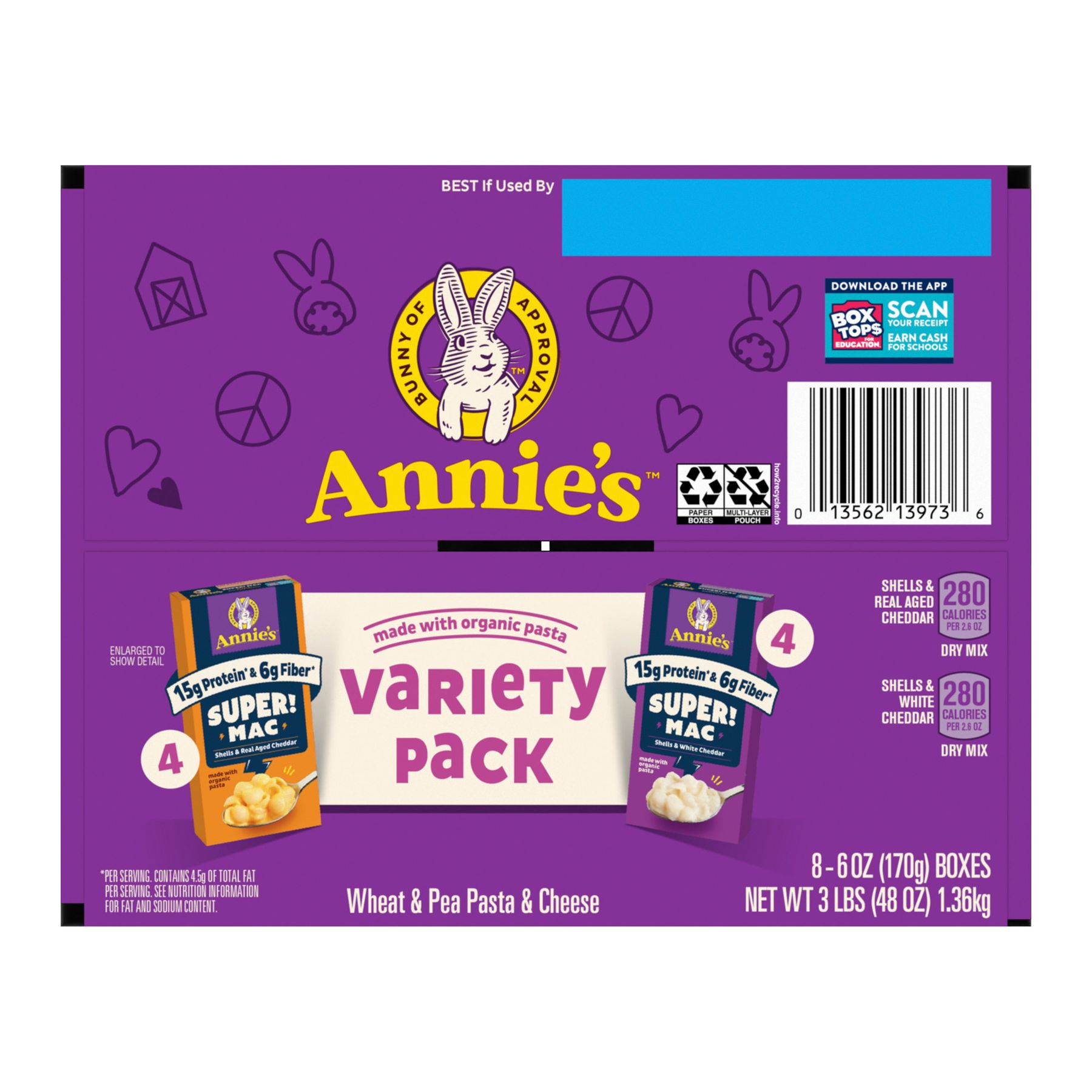 Contains: eight, 6 oz. boxes of Annie's Super! Mac White Cheddar and Real Aged Cheddar Wheat & Pea Pasta & Cheese Variety Pack