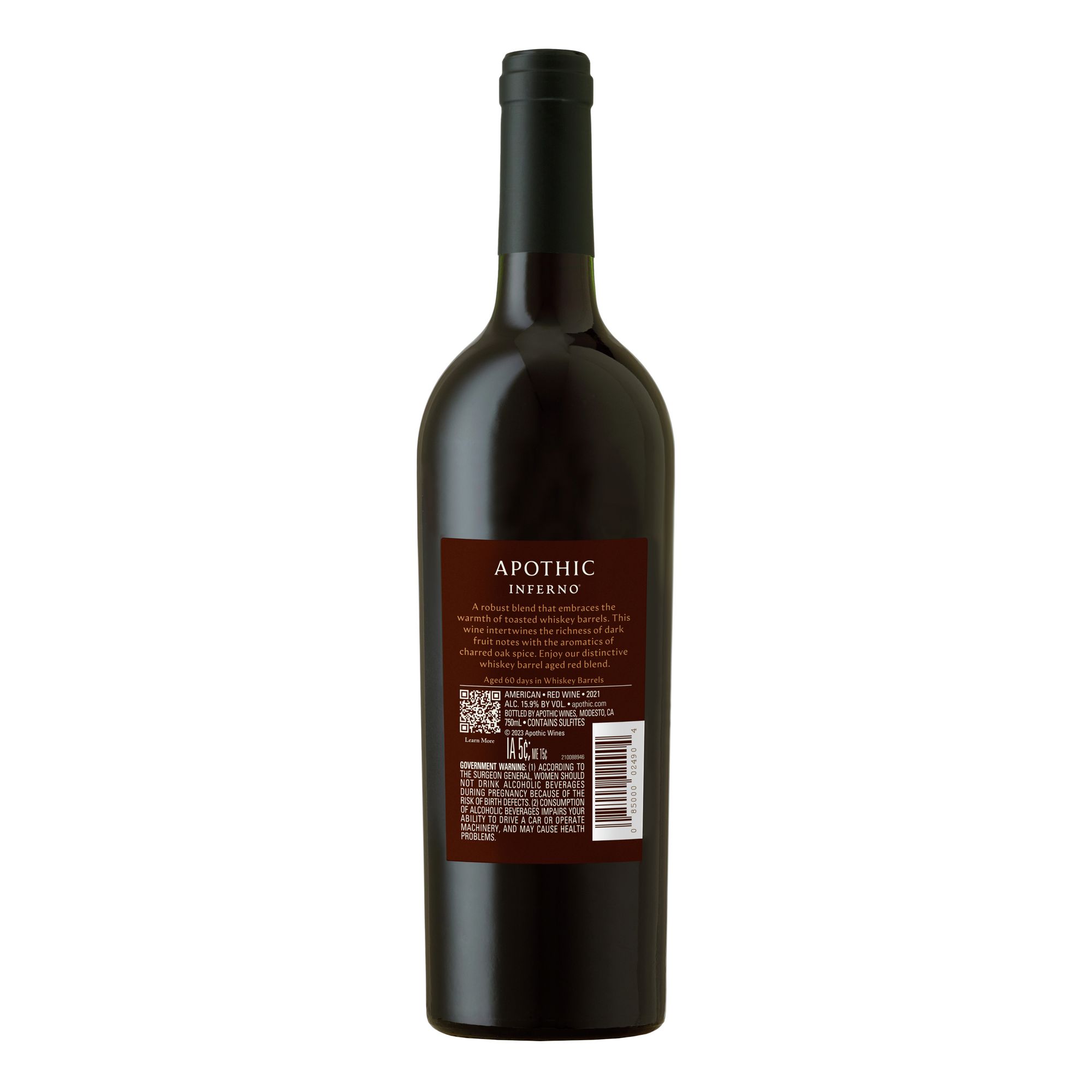 Indulge your senses with Apothic Inferno, a bold red wine blend aged for 60 days in charred whiskey barrels. Aging some of the wine in whiskey barrels adds an intriguing dimension of maple and spice to this red wine's dark layers of black plum and blackberry. The palate intensifies with notes of dried cherry and toasty vanilla leading to a long, warm finish. Apothic Inferno is perfect for drinking at room temperature on its own or in a whiskey-inspired wine cocktail. It's also a great wine to pair with your favorite foods, like pizza or barbecue dishes. Ideal for any occasion, Apothic Inferno is the perfect wine to accompany a night of endless possibilities, whether you're gathered around the dining table or a roaring fire. This red wine also makes a great wine gift for a birthday or anniversary. Each 750 mL wine bottle contains about 6 glasses of wine with 15.9% alcohol by volume. Discover flavor-forward, unforgettable wines with Apothic. In addition to Apothic Inferno, Apothic also offers Merlot, Apothic Crush and other varieties.