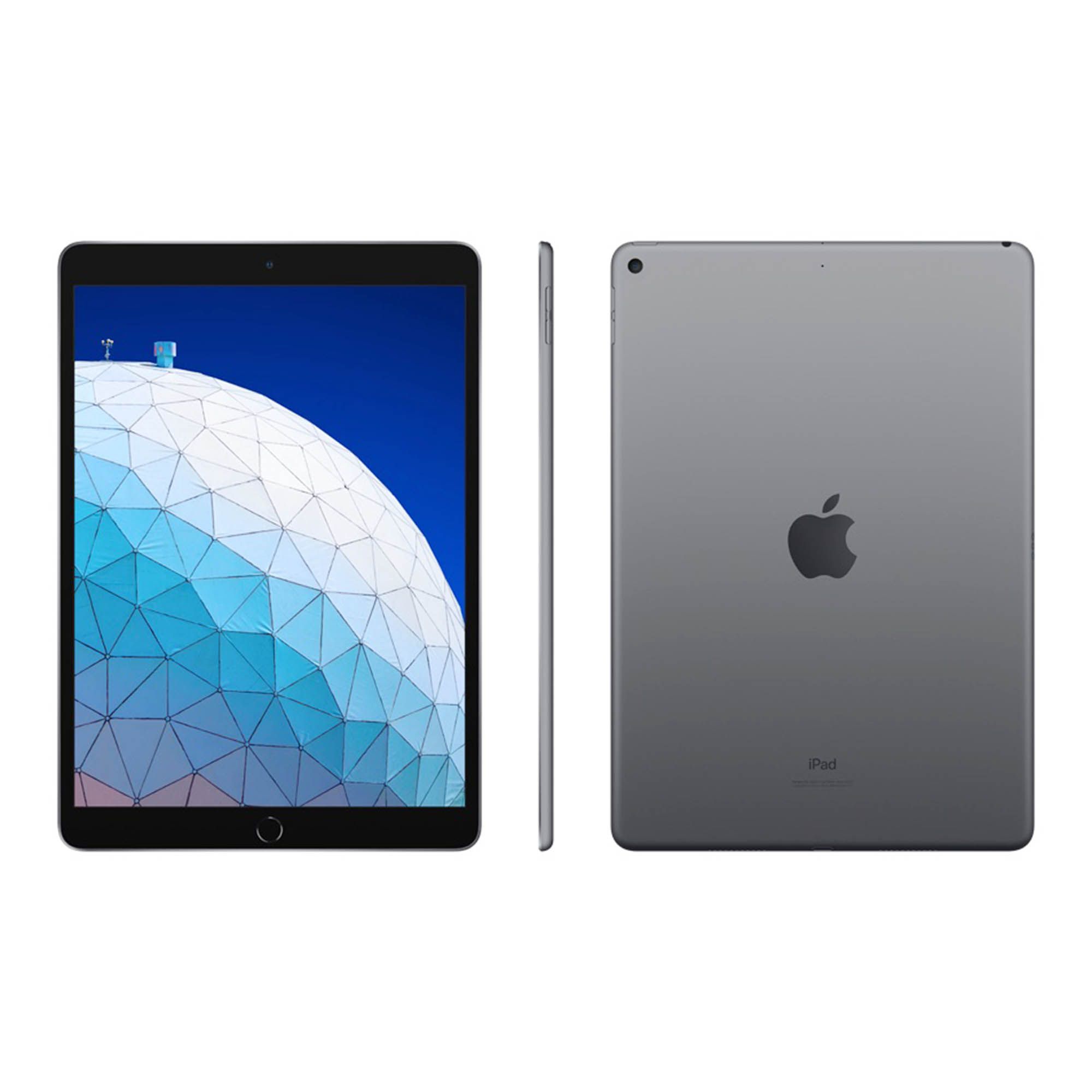 10.5-inch Retina display with True Tone and wide color A12 Bionic chip Touch ID fingerprint sensor and Apple Pay 8MP back camera, 7MP FaceTime HD front camera Stereo speakers 802.11ac Wi-Fi and Gigabit-class LTE cellular data Up to 10 hours of battery life Lightning connector for charging and accessories iOS 12 with Group FaceTime, shared augmented reality experiences, Screen Time, and more 64GB Space gray Includes Apple iPad Air Wi-Fi, power adapter, lightning to USB cable, and manual Warranty: 1 year limited